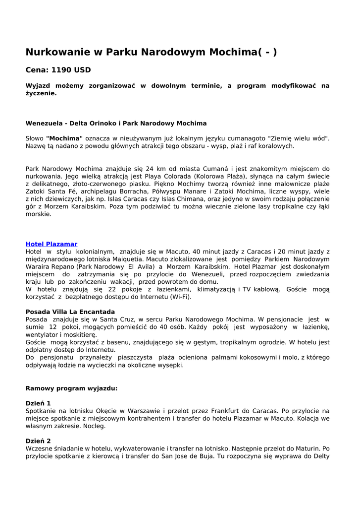 Nurkowanie w Parku Narodowym Mochima( - ) Cena: 1190 USD Wyjazd możemy zorganizować w dowolnym terminie, a program modyfikować na życzenie. Wenezuela - Delta Orinoko i Park Narodowy Mochima Słowo "Mochima" oznacza w nieużywanym już lokalnym języku cumanagoto "Ziemię wielu wód". Nazwę tą nadano z powodu głównych atrakcji tego obszaru - wysp, plaż i raf koralowych. Park Narodowy Mochima znajduje się 24 km od miasta Cumaná i jest znakomitym miejscem do nurkowania. Jego wielką atrakcją jest Playa Colorada (Kolorowa Plaża), słynąca na całym świecie z delikatnego, złoto-czerwonego piasku. Piękno Mochimy tworzą również inne malownicze plaże Zatoki Santa Fé, archipelagu Borracha, Półwyspu Manare i Zatoki Mochima, liczne wyspy, wiele z nich dziewiczych, jak np. Islas Caracas czy Islas Chimana, oraz jedyne w swoim rodzaju połączenie gór z Morzem Karaibskim. Poza tym podziwiać tu można wiecznie zielone lasy tropikalne czy łąki morskie. Hotel Plazamar Hotel w stylu kolonialnym, znajduje się w Macuto, 40 minut jazdy z Caracas i 20 minut jazdy z międzynarodowego lotniska Maiquetia. Macuto zlokalizowane jest pomiędzy Parkiem Narodowym Waraira Repano (Park Narodowy El Avila) a Morzem Karaibskim. Hotel Plazmar jest doskonałym miejscem do zatrzymania się po przylocie do Wenezueli, przed rozpoczęciem zwiedzania kraju lub po zakończeniu wakacji, przed powrotem do domu. W hotelu znajdują się 22 pokoje z łazienkami, klimatyzacją i TV kablową. Goście mogą korzystać z bezpłatnego dostępu do Internetu (Wi-Fi). Posada Villa La Encantada Posada znajduje się w Santa Cruz, w sercu Parku Narodowego Mochima. W pensjonacie jest w sumie 12 pokoi, mogących pomieścić do 40 osób. Każdy pokój jest wyposażony w łazienkę, wentylator i moskitierę. Goście mogą korzystać z basenu, znajdującego się w gęstym, tropikalnym ogrodzie. W hotelu jest odpłatny dostęp do Internetu. Do pensjonatu przynależy piaszczysta plaża ocieniona palmami kokosowymi i molo, z którego odpływają łodzie na wycieczki na okoliczne wysepki. Ramowy program wyjazdu: Dzień 1 Spotkanie na lotnisku Okęcie w Warszawie i przelot przez Frankfurt do Caracas. Po przylocie na miejsce spotkanie z miejscowym kontrahentem i transfer do hotelu Plazamar w Macuto. Kolacja we własnym zakresie. Nocleg. Dzień 2 Wczesne śniadanie w hotelu, wykwaterowanie i transfer na lotnisko. Następnie przelot do Maturin. Po przylocie spotkanie z kierowcą i transfer do San Jose de Buja. Tu rozpoczyna się wyprawa do Delty Orinoko. Przepakowanie na łodzie i podróż rzeką do Orinoco Eco Camp (około 40 minut). Po dotarciu na miejsce zapoznanie się campem i zakwaterowanie w domkach. Lunch. Po lunchu wyprawa łodziami po dopływach Orinoko. Czas na łowienie piranii. Kolacja i nocleg w campie. Dzień 3 Wcześnie rano pobudka (najprawdopodobniej za sprawą wyjców :-)). Jeszcze przed śniadaniem wycieczka canoe odnogami rzeki, by zaobserwować budząca się dżunglę. Camp jest jedynym tego rodzaju siedliskiem w obrębie dziewiczej dżungli. ¾ powierzchni Delty stanowi sawanna i dżungla wtórna. Po śniadaniu w campie wycieczka na niewielką farmę na sawannie, gdzie będzie możliwość obserwacji innego życia – wodnych bawołów, czarnych ibisów, skrzydłoszponów. Powrót do campu na lunch. Po lunchu czas na sjestę. Po odpoczynku przewodnik Warao poprowadzi wycieczkę w głąb dżungli (na piechotę). Doskonała okazja do doświadczenia tego nieprzyjaznego i niewybaczającego błędów środowiska. Po zakończeniu wycieczki powrót do campu (będzie potrzebna kąpiel :-)). Czas wolny do kolacji – można np. łowić piranie z pomostu w campie. Kolacja. Po kolacji dla chętnych - nocna wycieczka łodzią na bezkrwawe łowy na kajmany, węże i inne nocne stworzenia. Nocleg w campie. Dzień 4 Śniadanie w campie. Po śniadaniu transfer łodziami do San Jose de Buja i stamtąd busem do Parku Narodowego Mochima (przejazd około 4 – 5 godzin). Po dotarciu na miejsce zakwaterowanie w posada Villa Encantada. Reszta dnia wolna (w zależności o d godziny przyjazdu). Kolacja w posada. Nocleg. Dzień 5 - 7 Śniadania i kolacje w posada. Nurkowanie (2 nurkowania dziennie, jednego dnia dodatkowo nurkowanie nocne). Dla nienurkujących czas na plażowanie, wycieczki fakultatywne lub wypoczynek. Noclegi w posada. Dzień 8 Śniadanie i kolacja w posada. Dzień wolny na odpoczynek lub wycieczki fakultatywne. Nocleg w posada. Dzień 9 Po śniadaniu wymeldowanie i transfer na lotnisko w Barcelona i przelot do Caracas. Po przylocie na miejsce przesiadka do samolotu do Polski. Dzień 10 Przylot do Warszawy. Koniec imprezy. Dodatkowe koszty: pakiet 6 nurkowań + 1 nocne - 170,00 USD/ osoba przelot Warszawa – Caracas – Warszawa od ok. 3700,00 PLN/osoba. W cenie pakietu pobytowego: przeloty wewnętrzne transfery podczas objazdu noclegi w hotelach klasy turystycznej, campach 5 noclegów w posada w Mochima wyżywienie według programu opieka anglojęzycznego przewodnika ubezpieczenie turystyczne AXA. Dodatkowe opłaty: podatki lotniskowe przy przelotach wewnętrznych – ok. 5,00 USD/osoba/przelot posiłki niewymienione w programie napoje do posiłków zwyczajowe napiwki inne osobiste wydatki. SCUBA TRAVEL – PROFESSIONAL INCENTIVE UL. STOCZNIOWCÓW 9, 03-982 WARSZAWA EMAIL: [email protected], http://www.scubatravel.com.pl [email protected], http://www.proincentive.pl TEL.: (+4822) 646 98 43, FAX: (+4822) 646 98 41 Powered by TCPDF (www.tcpdf.org)