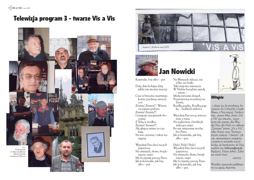 8 vis a vis | maj 2007 Telewizja program 3 - twarze Vis a Vis numer 2, Kraków, maj 2007 Konwalie, bzy albo – pet Daty, daty kolejne daty, jakby nie można inaczej Czas w brzuchu martwego konia, puchnąc mruczy coś. Ziemia! Ziemia!! - Wrzeszczy pijany grabarz. Ziemia! Ziemia!!! I zasypuje nią gniazdo bocianie. Z Tobą w środku. Ziemia! Ziemia!!! Ale głupcy mimo to czekają. Na ten czerwiec i także następny. fot. B. Kucharek A. Marczek (Bobs) Maciej Dudek z archiwum Pikusia Wpadnij Pan choć na pół papierosa. Na uśmiech, słowo, brzęknięcie, szept. My tu żyjemy proszę Pana. Jak te konwalie, jak bzy, albo – pet. Na Błoniach mlecze, raz żółte, raz białe. Taki majowy szmonces. W Niebie bezzębne anioły – wiem – Mielą żarnami dziąseł, Przetrawioną wcześniej na Ziemi, Rzadką papkę, Rzadką papkę – ludzkich miłości. Wpadnij Pan nocą, wieczorem, z rana. Na najkrótszy z krótkich milczący szept. Bo my umieramy trochę bez Pana. Jak te konwalie, jak bzy, albo – pet. Halo! Halo! Halo! Wpadnij Pan choć na pół papierosa. Na uśmiech, słowo, brzęknięcie, szept. My tu żyjemy, proszę Pana. Jak te konwalie, jak bzy, albo – pet. rys. Sebastian Kudas Jan Nowicki Witajcie ..i dzieje się..bo przybywa..bo czytacie..bo Usmiechy..Ciepłe Słowa..i Nas więcej i Serdeczniej...mamy Maj..drzwi „Vis a Vis” już otwarte.. nasze łamy jak zawsze..dla Was.. dla Nas..dla Nich..to całkiem „Zwisowe” pismo „Vis a Vis”... tylko Nasze..wiec Twórzcie piszcie rysujcie..”cykajcie” cyk cyk..opowiadajcie anegdoty.. a potem to wszystko na półeczkę, do barmanów, do Nas, mailem na: [email protected]... Bądźcie!..Dzień dobry!..Zabawa niech trwa! autorzy Wszelkie materiały publikujemy za zgodą Autorów. 2 vis a vis | maj 2007 Andrzej Warchał Stół - Panowie – powiedział prezydent, cofając się spod drzwi sali posiedzeń. –Za stołem ktoś siedzi. Pod drzwiami zaległa głucha cisza. - Jak to za stołem? – rzucił po chwili minister spraw wewnętrznych. – Jak siądziemy po drugiej stronie, to będą siedzieli przed. - Ale w ten sposób będą siedzieć za blisko. Jak któryś wyciągnie nogi, to je będzie miał po naszej stronie. - Niech ma. - Kiedy nie może być nóg w rządzie. - Przecież są – powiedział premier. – Chodzi tylko o to, żeby były rządowe. - Ależ w ten sposób pracować się nie da. Jak będziemy przemawiać, to nam jeszcze wypija wszystką wodę z karafek. - I tak nam gdzie indziej zostanie – rzucił minister zdrowia. – A w karafkach już może być zatruta. Przecież to mogą być zamachowcy. - Jakby to byli zamachowcy, to by siedzieli pod stołem. - Mogli się nie zmieścić. - W każdym razie cos trzeba zrobić – powiedział premier. – Jeszcze zaczną przemawiać i ustrój wypaczą. Trzeba ich zaskoczyć, jak zagrają hymn. Wstaną wtedy i jak się pospieszymy, to już nie usiądą. - Żeby tylko wiedzieć jaki? - Zorientujemy się po pierwszych taktach i jak co, to się wycofamy. - A jak tak oni za nami? – rzucił minister obrony. Bronić się nie da, bo mam fundusze tylko na atak. - No to zaatakować! - Nigdzie się stąd nie ruszę – powiedział prezydent. - A jak zmienią ustrój? - Ustrój mogą zmieniać, ale stół zostanie. Przecież pełnię funkcje z urzędu, a nie z przekonania. Kraków, 1965 Już z Nami: Andrzej Warchał * Andrzej Warzecha * Adam Ziemianin * Jan Nowicki * Bogusław Kucharek * Marek Wawrzyński * Krysztof „Kris” Cedro * Sebastian Kudas * Adam „Bobs” Marczek * Janusz Wosiek * Bożena Boba-Dyga * Maciej Dudek * Ryszard „Pikuś” * Ryszard Szociński * Anna * Marcin Hernas ..a Ty?..dołącz!..czekamy... maj 2007 Adam Ziemianin Poeci w krakowskim barze “Vis a Vis” Smutni poeci siedzą w „Zwisie” Pewnie coś nie coś napiliby się Ale na razie siedzą w zwisie BurnsWyller (Norwegia) Krakow Stadt Funny Farm Żywiec Piwo Nice Girls Good and Bad Unite and Fight Ryszard Szociński „Lato w Bieszczadzie” wyjdźcie wszyscy święci bieszczadnicy z gór z potoków ze śpiewających gałęziami drzew dziś wielkie ucztowanie w Bieszczadzie w Siekierezadzie Zubow coctail czyni na denaturacie stary Rados śpiewa jurne dumki dum dum dum dum rozcharczały się gitary struny tracą wytrzymałość i skowytem kończą śpiewne życie dum dum dum dum zadumały się jawory zadumały się dusioły Rafał się zadumał W Siekierezadzie stary sprzedawca pamiątek - na czadzie a gitary grały charczały bo dziś ucztowanie w Siekierezadzie w Bieszczadzie w tymczasie Adam Marczek Noga Szła ze mną Szła... Razem Doszliśmy aż tu Do Teraz -----------------Codziennie Niezmiennie Życie się przędzie W pędzie Codziennym Niezmiennym Aż do czasu końca Aż do zaćmienia Słońca Tam gdzie pył... | vis a vis 7 Marek Wawrzyński Maj na czubkach palców na czubkach piersi na czubkach ust Anna Jak kiść pomarańczy Ty u wezgłowia czasu układasz wiersz o mnie. Jest parafraza dysonans i krótka chwila zbawienia od gwałtowności pękniętego serca rozpaczą za wierność i cnotę które Ty respektujesz odpowiedzią za gesty i pocałunki tak słodkie jak hiszpańskie pomarańcze kiedy sok przenika przez ich skórkę niespokojnie wprost do Twoich ust Z moich nimi dłoni. Bożena Boba-Dyga (tomik Kropla) brzeziny zakwitają wiosną zielenią biel przypruszona zielonym pieprzem nadziei czerniobiel w ślubnej woalce nowego początku a wszystko na tle błękitu 6 vis a vis | maj 2007 maj 2007 Zwisowe bajania Pewnego dnia: ..pewnego dnia.. zdarzyła się w „Vis a Vis” historia ta: ..w owych czasach zmian i nowości wielu.. były też komórki Centertelu.. wielkie jak walizki.. nie dane było ich nosić wszystkim. Tego dnia Pewien Nasz Pan Znany i Zasłużony chciał się napić kawy w Vis a Vis jej noszeniem strudzony. Akurat trafił na zmianę ..gdzie Krysi nóżki rozbiegane…bo to tu to tam.. był Nasz Pan. Usiadł i czekał chwilę.. prostując swe strudzone to i owo.. i rac