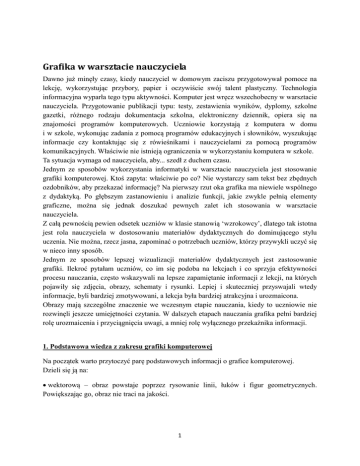 Grafika w warsztacie nauczyciela Dawno już minęły czasy, kiedy nauczyciel w domowym zaciszu przygotowywał pomoce na lekcję, wykorzystując przybory, papier i oczywiście swój talent plastyczny. Technologia informacyjna wyparła tego typu aktywności. Komputer jest wręcz wszechobecny w warsztacie nauczyciela. Przygotowanie publikacji typu: testy, zestawienia wyników, dyplomy, szkolne gazetki, różnego rodzaju dokumentacja szkolna, elektroniczny dziennik, opiera się na znajomości programów komputerowych. Uczniowie korzystają z komputera w domu i w szkole, wykonując zadania z pomocą programów edukacyjnych i słowników, wyszukując informacje czy kontaktując się z rówieśnikami i nauczycielami za pomocą programów komunikacyjnych. Właściwie nie istnieją ograniczenia w wykorzystaniu komputera w szkole. Ta sytuacja wymaga od nauczyciela, aby... szedł z duchem czasu. Jednym ze sposobów wykorzystania informatyki w warsztacie nauczyciela jest stosowanie grafiki komputerowej. Ktoś zapyta: właściwie po co? Nie wystarczy sam tekst bez zbędnych ozdobników, aby przekazać informację? Na pierwszy rzut oka grafika ma niewiele wspólnego z dydaktyką. Po głębszym zastanowieniu i analizie funkcji, jakie zwykle pełnią elementy graficzne, można się jednak doszukać pewnych zalet ich stosowania w warsztacie nauczyciela. Z całą pewnością pewien odsetek uczniów w klasie stanowią ‘wzrokowcy’, dlatego tak istotna jest rola nauczyciela w dostosowaniu materiałów dydaktycznych do dominującego stylu uczenia. Nie można, rzecz jasna, zapominać o potrzebach uczniów, którzy przywykli uczyć się w nieco inny sposób. Jednym ze sposobów lepszej wizualizacji materiałów dydaktycznych jest zastosowanie grafiki. Ilekroć pytałam uczniów, co im się podoba na lekcjach i co sprzyja efektywności procesu nauczania, często wskazywali na lepsze zapamiętanie informacji z lekcji, na których pojawiły się zdjęcia, obrazy, schematy i rysunki. Lepiej i skuteczniej przyswajali wtedy informacje, byli bardziej zmotywowani, a lekcja była bardziej atrakcyjna i urozmaicona. Obrazy mają szczególne znaczenie we wczesnym etapie nauczania, kiedy to uczniowie nie rozwinęli jeszcze umiejętności czytania. W dalszych etapach nauczania grafika pełni bardziej rolę urozmaicenia i przyciągnięcia uwagi, a mniej rolę wyłącznego przekaźnika informacji. 1. Podstawowa wiedza z zakresu grafiki komputerowej Na początek warto przytoczyć parę podstawowych informacji o grafice komputerowej. Dzieli się ją na: wektorową – obraz powstaje poprzez rysowanie linii, łuków i figur geometrycznych. Powiększając go, obraz nie traci na jakości. 1 rastrową – powstały obraz jest bitmapą, czyli prostokątną siatką składająca się z pikseli. Są to małe punkty, znajdujące się jeden obok drugiego na bitmapie. O jakości obrazu świadczy ilość pikseli. Znajomość podstawowych rodzajów plików graficznych jest niezwykle pomocna. Najbardziej popularne rozszerzenia w grafice rastrowej to: jpg – powszechnie stosowany format w internecie, który jednak powoduje straty w jakości, png – bardzo dobry format, nie powodujący strat w jakości przy zapisie, gif – służy do tworzenia animacji, chętnie wykorzystywanych w internecie, psd – typowe rozszerzenie dla programu Adobe Photoshop. Najbardziej popularne rozszerzenia w grafice wektorowej to z kolei: svg – stosowany na przykład w programie Inkscape, cdr – jest rozszerzeniem programu CorelDraw. 2. Szukamy gotowych rozwiązań Zasadnicze pytanie brzmi: skąd pozyskiwać elementy graficzne, dostosowane do naszych potrzeb? Internet pęka w szwach od różnego rodzaju stron, oferujących zdjęcia i cliparty (pliki graficzne). Właściwie nie musimy nawet wchodzić na konkretną stronę. Wystarczy doskonale wszystkim znane narzędzie - wyszukiwarka Google, gdzie klikając w zakładkę Grafika i wpisując nazwę poszukiwanego tematu wyświetla nam się pokaźny zasób fotografii lub obrazków z różnych źródeł internetowych. Czy zawsze jednak jest to legalne i bezpieczne? Niektóre obrazy są chronione prawem autorskim i zabezpieczone przed kopiowaniem poprzez nałożenie przezroczystej warstwy lub umieszczeniem tzw. „watermark”, czyli napisu na obrazie, wskazującego na źródło pochodzenia. Ten ostatni może stanowić niewielki i dyskretny napis, nie zakłócający przekazu obrazu, bądź - w gorszym przypadku - może zajmować cały obraz. Wtedy pozostaje nam odwiedzić stronę i zakupić dany obraz. Inne z obrazów nie są zabezpieczone, ale ich wykorzystywanie jest nielegalne. Istnieją jednak strony, działające za zasadzie licencji Creative Commons, które pozwalają udzielić określonych praw do korzystania z licencjonowanego dzieła. Utwory na licencjach Creative Commons mogą więc być wykorzystywane bez konieczności uzyskania każdorazowej, indywidualnej zgody od właściciela praw autorskich. Poprzez utwory (według organizacji Creative Commons) rozumiemy tutaj książki, strony internetowe, blogi, zdjęcia, filmy, nagrania wideo, piosenki oraz inne nagrania dźwiękowe i wizualne. 2 Podstawowe warunki licencji Creative Commons to (źródło: wikipedia.org): uznanie autorstwa (BY). Wolno kopiować, rozprowadzać, przedstawiać i wykonywać objęty prawem autorskim utwór oraz opracowane na jego podstawie utwory zależne pod warunkiem, że zostanie przywołane nazwisko autora pierwowzoru. użycie niekomercyjne (NC). Wolno kopiować, rozprowadzać, przedstawiać i wykonywać objęty prawem autorskim utwór oraz opracowane na jego podstawie utwory zależne jedynie do celów niekomercyjnych. na tych samych warunkach (SA). Wolno rozprowadzać utwory zależne jedynie na licencji identycznej do tej, na jakiej udostępniono utwór oryginalny. bez utworów zależnych (ND). Wolno kopiować, rozprowadzać, przedstawiać i wykonywać utwór jedynie w jego oryginalnej postaci; tworzenie utworów zależnych nie j