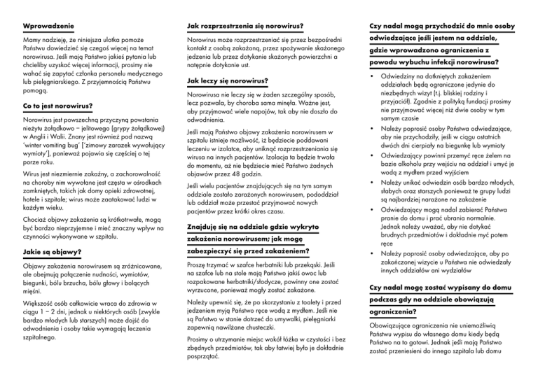 Wprowadzenie Jak rozprzestrzenia się norowirus? Czy nadal mogą przychodzić do mnie osoby Mamy nadzieję, że niniejsza ulotka pomoże Państwu dowiedzieć się czegoś więcej na temat norowirusa. Jeśli mają Państwo jakieś pytania lub chcieliby uzyskać więcej informacji, prosimy nie wahać się zapytać członka personelu medycznego lub pielęgniarskiego. Z przyjemnością Państwu pomogą. Norowirus może rozprzestrzeniać się przez bezpośredni kontakt z osobą zakażoną, przez spożywanie skażonego jedzenia lub przez dotykanie skażonych powierzchni a natępnie dotykanie ust. odwiedzające jeśli jestem na oddziale, Co to jest norowirus? Norowirus jest powszechną przyczyną powstania nieżytu żołądkowo – jelitowego (grypy żołądkowej) w Anglii i Walii. Znany jest również pod nazwą ‘winter vomiting bug’ [‘zimowy zarazek wywołujący wymioty’], ponieważ pojawia się częściej o tej porze roku. Wirus jest niezmiernie zakaźny, a zachorowalność na choroby nim wywołane jest częsta w ośrodkach zamkniętych, takich jak domy opieki zdrowotnej, hotele i szpitale; wirus może zaatakować ludzi w każdym wieku. Chociaż objawy zakażenia są krótkotrwałe, mogą być bardzo nieprzyjemne i mieć znaczny wpływ na czynności wykonywane w szpitalu. Jak leczy się norowirus? Norowirusa nie leczy się w żaden szczególny sposób, lecz pozwala, by choroba sama minęła. Ważne jest, aby przyjmować wiele napojów, tak aby nie doszło do odwodnienia. Jeśli mają Państwo objawy zakażenia norowirusem w szpitalu istnieje możliwość, iż będziecie poddawani leczeniu w izolatce, aby uniknąć rozprzestrzeniania się wirusa na innych pacjentów. Izolacja ta będzie trwała do momentu, aż nie będziecie mieć Państwo żadnych objawów przez 48 godzin. Jeśli wielu pacjentów znajdujących się na tym samym oddziale zostało zarażonych norowirusem, pododdział lub oddział może przestać przyjmować nowych pacjentów przez krótki okres czasu. Znajduję się na oddziale gdzie wykryto zakażenia norowirusem; jak mogę Jakie są objawy? zabezpieczyć się przed zakażeniem? Objawy zakażenia norowirusem są zróżnicowane, ale obejmują połączenie nudności, wymiotów, biegunki, bólu brzucha, bólu głowy i bolących mięśni. Proszę trzymać w szafce herbatniki lub przekąski. Jeśli na szafce lub na stole mają Państwo jakiś owoc lub rozpakowane herbatniki/słodycze, powinny one zostać wyrzucone, ponieważ mogły zostać zakażone. Większość osób całkowicie wraca do zdrowia w ciągu 1 – 2 dni, jednak u niektórych osób (zwykle bardzo młodych lub starszych) może dojść do odwodnienia i osoby takie wymagają leczenia szpitalnego. Należy upewnić się, że po skorzystaniu z toalety i przed jedzeniem myją Państwo ręce wodą z mydłem. Jeśli nie są Państwo w stanie dotrzeć do umywalki, pielęgniarki zapewnią nawilżane chusteczki. Prosimy o utrzymanie miejsc wokół łóżka w czystości i bez zbędnych przedmiotów, tak aby łatwiej było je dokładnie posprzątać. gdzie wprowadzono ograniczenia z powodu wybuchu infekcji norowirusa? • Odwiedziny na dotkniętych zakażeniem oddziałach będą ograniczone jedynie do niezbędnych wizyt (t.j. bliskiej rodziny i przyjaciół). Zgodnie z polityką fundacji prosimy nie przyjmować więcej niż dwie osoby w tym samym czasie • Należy poprosić osoby Państwa odwiedzające, aby nie przychodziły, jeśli w ciągu ostatnich dwóch dni cierpiały na biegunkę lub wymioty • Odwiedzający powinni przemyć ręce żelem na bazie alkoholu przy wejściu na oddział i umyć je wodą z mydłem przed wyjściem • Należy unikać odwiedzin osób bardzo młodych, słabych oraz starszych ponieważ te grupy ludzi są najbardziej narażone na zakażenie • Odwiedzający mogą nadal zabierać Państwa pranie do domu i prać ubrania normalnie. Jednak należy uważać, aby nie dotykać brudnych przedmiotów i dokładnie myć potem ręce • Należy poprosić osoby odwiedzające, aby po zakończonej wizycie u Państwa nie odwiedzały innych oddziałów ani wydziałów Czy nadal mogę zostać wypisany do domu podczas gdy na oddziale obowiązują ograniczenia? Obowiązujące ograniczenia nie uniemożliwią Państwu wypisu do własnego domu kiedy będą Państwo na to gotowi. Jednak jeśli mają Państwo zostać przeniesieni do innego szpitala lub domu opieki, może to zostać opóźnione, aż do zniesienia ograniczeń. Ma to zapobiec rozprzestrzenianiu się infekcji w innych placówkach. Czy mogę opuścić oddział, jeśli ograniczenia nadal obowiązują? Jeśli zaistnieje potrzeba przeprowadzenia testów lub badań poza oddziałem, zwykle dochodzi do nich zgodnie z planem. Jednak prosimy o nieodwiedzanie miejsc publicznych takich jak kawiarnia czy restauracja w czasie obowiązywania ograniczeń. Jeśli rodzina chce zabrać Państwa z oddziału, prosimy porozmawiać z pielęgniarką. Norowirus Przepraszamy za wszelkie niedogodności powstałe w tym czasie. Jeśli macie Państwo jakieś inne pytania szczegółowe, pielęgniarki na oddziale z przyjemnością Państwu pomogą. Można również skontaktować się z zespołem ds. kontroli zakażeń [infection control team] przez pielęgniarkę nadzorującą na oddziale. Materiał źródłowy Kontrola zakażeń Health Protection Agency [Agencja Ochrony Zdrowia] http://www.hpa.org.uk/ P Appleby/Jul14/review Jul16