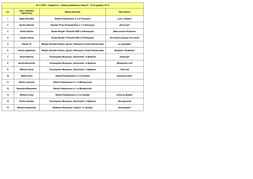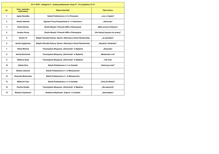 23.11.2016 – kategoria II – szkoły podstawowe, klasy IV – VI od godziny 12:15 Lp. Imię i nazwisko wykonawcy Nazwa placówki Tytuł utworu 1 Agata Szwedka Szkoła Podstawowa nr 2 w Pszczynie „Lew u fryzjera” 2 Amelia Adamek Ognisko Pracy Pozaszkolnej nr 1 w Sosnowcu „Damą byc” 3 Emilia Klimża Studio Muzyki i Piosenki ARS w Pietraszynie „Mała smutna Królewna” 4 Jonatan Koczy Studio Muzyki i Piosenki ARS w Pietraszynie „Dni których jeszcze nie znamy” 5 Kamila Til Miejski Ośrodek Kultury, Sportu i Rekreacji w Kuźni Raciborskiej „Ja wysiadam” 6 Amelia Zagdańska Miejski Ośrodek Kultury, Sportu i Rekreacji w Kuźni Raciborskiej „Brzydula i Rudzielec” 7 Oliwia Michna Towarzystwo Muzyczne „Dominanta” w Będzinie „Deszczyk” 8 Amelia Bochenek Towarzystwo Muzyczne „Dominanta” w Będzinie „Miasteczko cud” 9 Wiktoria Goryl Towarzystwo Muzyczne „Dominanta” w Będzinie „Taki kraj” 10 Natalia Dera Szkoła Podstawowa nr 3 w Czeladzi „Kolorowy wiatr” 11 Natalia Lebiocka Szkoła Podstawowa nr 1 w Mierzęcicach 12 Kasandra Miszewska Szkoła Podstawowa nr 1 w Mierzęcicach 13 Wiktoria Fulas Szkoła Podstawowa nr 3 w Czeladzi „Chcę do Bodzia” 14 Paulina Kostka Towarzystwo Muzyczne „Dominanta” w Będzinie „Nie zapomnij” 15 Martyna krzywiecka Akademia Wyobraźni „Kajune” w Czeladzi „Samozapłon” 16 Gabriela Molenda Akademia Wyobraźni „Kajune” w Czeladzi „Płacze moje serce” 17 Lila Urbańska Szkoła Podstawowa nr 3 w Czeladzi „Lód w lecie” 18 Natalia Dulko Szkoła Podstawowa nr 10 w Będzinie „Ja chcę do Bodzia” 19 Oskar Paniewski Szkoła Podstawowa nr 10 w Będzinie „Już taki jestem zimny drań” 20 Zuzanna Wasik Szkoła Podstawowa nr 10 w Będzinie „Człowieczy los” 21 Maja Mroczek Szkoła Podstawowa w Gródkowie „Gdzie jest siódme niebo” 22 Emilia Maciejczyk Szkoła Podstawowa w Gródkowie „Radośc najpięknieszych lat” 23 Aleksandra Klimas Szkoła Podstawowa w Kroczycach „Modlitwa Esmeraldy” 24 Maja Giedwiłło Stowarzyszenie Ognisk Artystycznych w Tychach „Piosenka na 4 kopyta i wiatr” 25 Julia Knap Szkoła Podstawowa nr 1 w Będzinie „Puszek okruszek” 26 Weronika Królikowska Szkoła Podstawowa nr 34 w Dąbrowie Górniczej „Żyj do przodu” 27 Klaudia Zajd Zespół Szkół Specjalnych w Czeladzi „Zabiorę nas tam” 28 Szymon Jankowski Zespół Szkół Specjalnych w Czeladzi „Kolorowa sukienka” 29 Joanna Doniec Szkoła Podstawowa nr 34 w Dąbrowie Górniczej „Śpiewam i tańczę” 30 Martyna Kucias Szkoła Podstawowa w Bobrownikach „Pięknie życ” 31 Natasza Nowak Szkoła Podstawowa nr 6 w Będzinie „Najtrudniejszy pierwszy krok” 32 Aleksandra Hartabus Zespół Szkolno-Przedszkolny w Dobieszowicach „Powietrze” 33 Wiktoria Wyszyńska Zespół Szkolno-Przedszkolny w Dobieszowicach „Tyle słońca w całym mieście” 34 Emilia Raschka Zespół Szkolno-Przedszkolny w Dobieszowicach „Szklana pogoda” 35 Sonia Fiedor Zespół Szkolno-Przedszkolny w Dobieszowicach „Śpiewam i tańczę” 36 Wiktoria Dziura Zespół Szkolno-Przedszkolny w Dobieszowicach „Wszystko mi mówi, że mnie ktoś pokochał” 37 Julia Kocot Gminny Oœrodek Kultury w Bobrownikach – Filia w Sączowie „Korpelki” 38 Kordian Głodek Zespół Szkolno-Przedszkolny w Dobieszowicach „Zbudujemy dom” 39 Oliwia Nowak Szkoła Podstawowa nr 3 w Wojkowicach 40 Jasmina Djelaoui Szkoła Podstawowa nr 1 w Wojkowicach „Tamta Dziewczyna” 41 Julia Kłys Gminny Ośrodek Kultury w Bobrownikach – Filia w Sączowie „Strach na wróble” 42 Julia Sibielak MOK w Wojkowicach „Miasto” 43 Aleksandra Lipa Ośrodek Kultury w Będzinie „Nie zawiedź mnie” 44 Zuzanna Korpok PMDK w Będzinie „Boję się” 45 Alicja Latosińska Szkoła Podstawowa nr 2 w Mierzęcicach „Jestem kotem” 46 Aleksandra Dobrowolska Szkołą Podstawowa nr 13 w Dąbrowie Górniczej „Drewniane Lalki” 47 Aleksandra Michalska Szkołą Podstawowa nr 13 w Dąbrowie Górniczej „Pod Wiatr” 48 Zuzanna Drożdżowska Śląskie Stowarzyszenie Edukacji Artystycznej w Zawierciu „Gwiazda Filmowa” 49 Jagoda Rataj STE OMEGA w Katowicach „Był sobie strach” 50 Wiktoria Nowak Szkołą Podstawowa nr 13 w Dąbrowie Górniczej „Lustra” 51 Alicja Mazurek Szkoła Podstawowa nr 2 w Mierzęcicach „Pięknie życ” 52 Kinga Niedbała Szkoła Podstawowa nr 2 w Mierzęcicach „Koci świat” 53 Nikola Sitko Szkoła Podstawowa nr 1 w Wojkowicach „Ja chcę do Bodzia” 54 Klaudia Ujma Zespół Szkół we Wrzosowej „Piosenka na zły czas” 55 Zuzanna Pichit Miejski Zespół Szkół nr 4 w Będzinie „Piosenka Klary” 56 Natalia Kozak Szkoła Podstawowa nr 4 w Będzinie „Kto jest trudny” 57 Ksenia Jaszczyk Szkoła Podstawowa nr 4 w Będzinie „Gwiazda Filmowa” 58 Julia Straszak Szkoła Podstawowa nr 4 w Będzinie „Moja fantazja”
