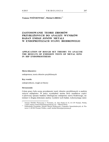 4-2015 TRIBOLOGIA 207 Tomasz WIŚNIEWSKI *, Michał LIBERA ** ZASTOSOWANIE TEORII ZBIORÓW PRZYBLIŻONYCH DO ANALIZY WYNIKÓW BADAŃ EMISJI JONÓW METALI W ENDOPROTEZACH STAWU BIODROWEGO APPLICATION OF ROUGH SET THEORY TO ANALYSE THE RESULTS OF EMISSION TESTS OF METAL IONS IN HIP ENDOPROSTHESIS Słowa kluczowe: endoproteza, teoria zbiorów przybliżonych Key words: endoprosthesis, rough set theory Streszczenie Celem pracy była ocena przydatności teorii zbiorów przybliżonych w analizie zużycia endoprotez. W pracy wyodrębnić można dwie zasadnicze części: w pierwszej opisano badania tribologiczne endoprotez stawu biodrowego, natomiast w drugiej dokonano analizy wyników tych badań, wykorzystując meto* ** Instytut Obróbki Plastycznej w Poznaniu, ul. Jana Pawła II 14, 61-139 Poznań, Polska, e-mail: [email protected], tel.: +48616570555. Politechnika Poznańska, Instytut Maszyn Roboczych i Pojazdów Samochodowych, ul. Piotrowo 3, 60-965 Poznań, Polska, e-mail: [email protected]. 208 TRIBOLOGIA 4-2015 dę generowania reguł decyzyjnych w oparciu o teorię zbiorów przybliżonych. W efekcie stwierdzono, że wygenerowane reguły decyzyjne nie są sprzeczne z aktualnym stanem wiedzy, a zaproponowana metoda analizy może być przydatna w analizie tego rodzaju zagadnień. WPROWADZENIE Schorzenia stawu biodrowego, takie jak choroba zwyrodnieniowa, zmiany destrukcyjne w wyniku chorób reumatycznych, jałowa martwica głowy kości udowej oraz urazy są przyczyną zniszczenia powierzchni stawowych. Zaawansowany proces destrukcji stawu biodrowego obniża jakość życia chorych, ograniczając ich zdolność do poruszania się [L. 1]. W większości przypadków jedyną skuteczną metodą leczenia jest zastosowanie endoprotezoplastyki stawu biodrowego [L. 2]. Dzięki tym zabiegom przywraca się ruchomość stawu i uwalnia się pacjenta od dolegliwości bólowych, umożliwiając operowanemu powrót do czynnego życia zawodowego i społecznego. Endoprotezoplastyka stawu biodrowego w ostatnich latach jest najczęściej wykonywaną procedurą ortopedyczną, polega ona na wymianie uszkodzonych elementów stawu (chrząstki stawowej i kości podchrzęstnej) na sztuczną endoprotezę. Z uwagi na budowę anatomiczną stawu, którego powierzchnia ma kształt zbliżony do sfery, implanty charakteryzują się w większości przypadków podobną konstrukcją, która odwzorowuje działanie kulistego stawu panewkowego. Implant stawu biodrowego składa się z panewki mocowanej w miednicy, trzpienia osadzanego w kanale szpikowym kości udowej oraz głowy osadzonej na trzpieniu pracującej w panewce (Rys. 1). Rys. 1. Endoproteza stawu biodrowego Fig. 1. Hip endoprosthesis 4-2015 TRIBOLOGIA 209 Implantom stawiane są coraz wyższe wymagania, w krajach wysokorozwiniętych wzrasta liczba pacjentów w stosunkowo młodym wieku, którzy oczekują, oprócz pozbycia się dolegliwości bólowych, utrzymania wysokiej aktywności fizycznej. Wymusza to na producentach implantów wdrażanie do praktyki klinicznej biomateriałów cechujących się coraz lepszą biokompatybilnością, trwałością oraz odpornością na zużycie. Stosowana w endoprotezoplastyce artykulacja metal–polietylen, w których metalowa głowa pracuje w polietylenowej panewce ma pewne ograniczenia z uwagi na podatność polietylenu na zużycie tribologiczne [L. 3]. W układzie tribologicznym metal–polietylen generowane są polietylenowe produkty zużycia o wysokim potencjale do pobudzania osteolizy wokół implantu, co prowadzi do jego obluzowania [L. 4]. Aseptyczne obluzowanie wiąże się z koniecznością przeprowadzenia operacji rewizyjnej, której wyniki kliniczne są gorsze w porównaniu z zabiegiem pierwotnym. W praktyce klinicznej stosowane są również artykulacje ceramika– –ceramika oraz metal–metal. Pierwszy rodzaj pary trącej produkowany jest z trójtlenku glinu (Al2O3), który cechuje się wysoką odpornością na zużycie, dobrą biokompatybilnością oraz wysokim odsetkiem dobrych wyników klinicznych [L. 5]. Jednak podatność ceramiki na kruche pękanie ogranicza jej stosowanie w określonych typach implantów, zwłaszcza dla młodych i aktywnych pacjentów. Artykulacja typu metal–metal stosowana jest w praktyce klinicznej od lat pięćdziesiątych. Po początkowych niepowodzeniach, których przyczynę upatrywano w wadach technologicznych, powrócono do tego typu implantów, wprowadzając implanty drugiej generacji. Badania kliniczne prowadzone na przestrzeni ponad 20 lat wykazały dużą odporność na zużycie endoprotez z artykulacją metal–metal, generowane produkty zużycia i uwalniane jony metali chromu, kobaltu i molibdenu nie powodują u pacjentów osteolizy oraz obluzowania endoprotez [L. 6–8]. Tego typu implanty można stosować u pacjentów aktywnych, stosuje się również głowy o dużej średnicy zmniejszające ryzyko zwichnięcia, które umożliwiają osiągnięcie większego zakresu ruchów w porównaniu ze standardowymi głowami o średnicy 28 mm. Niezależnie od doboru skojarzenia materiałowego implantu najistotniejszym czynnikiem ograniczającym trwałość endoprotez jest podatność na zużycie tribologiczne [L. 9]. Istnieje wiele publikacji, w których autorzy zwracają uwagę na wpływ osi osadzenia komponentów endoprotez na opory tarcia i mechanizmy zużycia, a w rezultacie na trwałość endoprotezy [L. 10]. Wzajemne ustawienie komponentów implantu wpływa na jego stabilność (prawdopodobieństwo zwichnięcia), zakres ruchomości oraz ilość wytwarzanych produktów zużycia. Podczas chodu w naturalnym stawie biodrowym człowieka występują obciążenia zależne od masy ciała. W poszczególnych fazach ruchu zmienia się 210 TRIBOLOGIA 4-2015 wartość obciążenia stawu biodrowego, osiągając czterokrotność masy ciała człowieka [L. 11]. System tribologiczny, jakim jest staw biodrowy doznaje rocznie ok. miliona obciążeń o charakterze udarowym. Współczynnik tarcia μ dla party