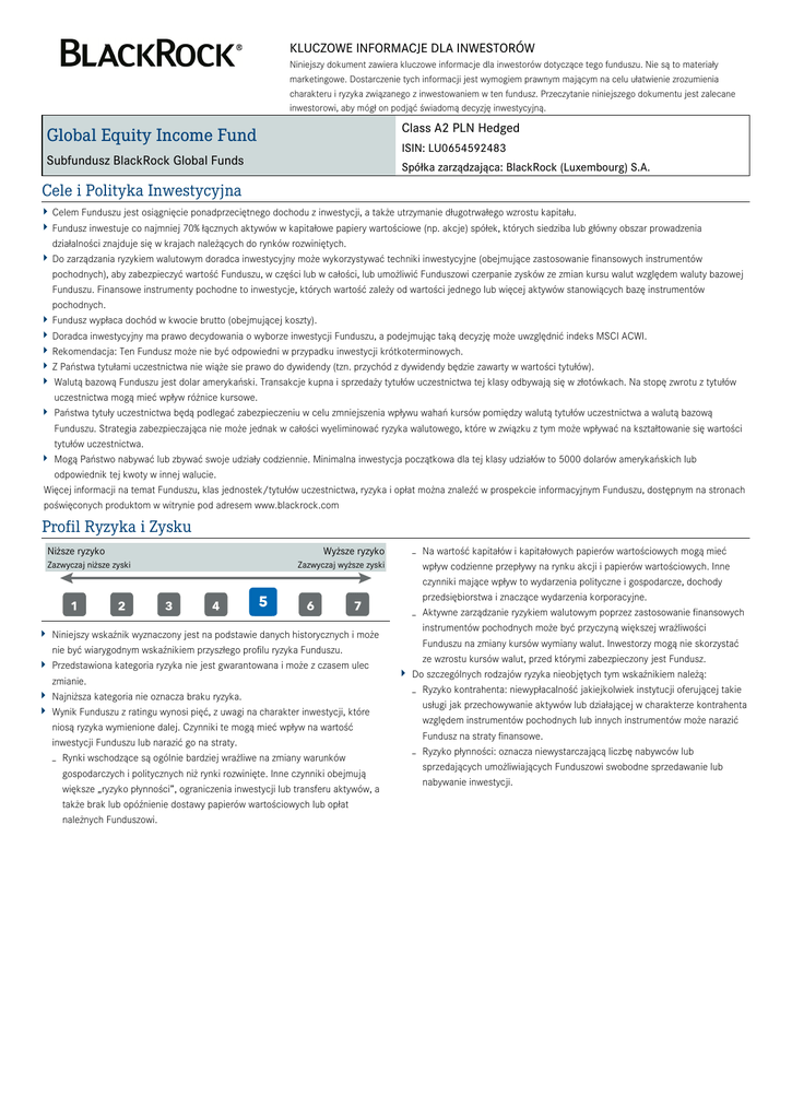 KLUCZOWE INFORMACJE DLA INWESTORÓW Niniejszy dokument zawiera kluczowe informacje dla inwestorów dotyczące tego funduszu. Nie są to materiały marketingowe. Dostarczenie tych informacji jest wymogiem prawnym mającym na celu ułatwienie zrozumienia charakteru i ryzyka związanego z inwestowaniem w ten fundusz. Przeczytanie niniejszego dokumentu jest zalecane inwestorowi, aby mógł on podjąć świadomą decyzję inwestycyjną. Class A2 PLN Hedged Global Equity Income Fund ISIN: LU0654592483 Subfundusz BlackRock Global Funds Spółka zarządzająca: BlackRock (Luxembourg) S.A. Cele i Polityka Inwestycyjna Celem Funduszu jest osiągnięcie ponadprzeciętnego dochodu z inwestycji, a także utrzymanie długotrwałego wzrostu kapitału. Fundusz inwestuje co najmniej 70% łącznych aktywów w kapitałowe papiery wartościowe (np. akcje) spółek, których siedziba lub główny obszar prowadzenia działalności znajduje się w krajach należących do rynków rozwiniętych. Do zarządzania ryzykiem walutowym doradca inwestycyjny może wykorzystywać techniki inwestycyjne (obejmujące zastosowanie finansowych instrumentów pochodnych), aby zabezpieczyć wartość Funduszu, w części lub w całości, lub umożliwić Funduszowi czerpanie zysków ze zmian kursu walut względem waluty bazowej Funduszu. Finansowe instrumenty pochodne to inwestycje, których wartość zależy od wartości jednego lub więcej aktywów stanowiących bazę instrumentów pochodnych. Fundusz wypłaca dochód w kwocie brutto (obejmującej koszty). Doradca inwestycyjny ma prawo decydowania o wyborze inwestycji Funduszu, a podejmując taką decyzję może uwzględnić indeks MSCI ACWI. Rekomendacja: Ten Fundusz może nie być odpowiedni w przypadku inwestycji krótkoterminowych. Z Państwa tytułami uczestnictwa nie wiąże sie prawo do dywidendy (tzn. przychód z dywidendy będzie zawarty w wartości tytułów). Walutą bazową Funduszu jest dolar amerykański. Transakcje kupna i sprzedaży tytułów uczestnictwa tej klasy odbywają się w złotówkach. Na stopę zwrotu z tytułów uczestnictwa mogą mieć wpływ różnice kursowe. Państwa tytuły uczestnictwa będą podlegać zabezpieczeniu w celu zmniejszenia wpływu wahań kursów pomiędzy walutą tytułów uczestnictwa a walutą bazową Funduszu. Strategia zabezpieczająca nie może jednak w całości wyeliminować ryzyka walutowego, które w związku z tym może wpływać na kształtowanie się wartości tytułów uczestnictwa. Mogą Państwo nabywać lub zbywać swoje udziały codziennie. Minimalna inwestycja początkowa dla tej klasy udziałów to 5000 dolarów amerykańskich lub odpowiednik tej kwoty w innej walucie. Więcej informacji na temat Funduszu, klas jednostek/tytułów uczestnictwa, ryzyka i opłat można znaleźć w prospekcie informacyjnym Funduszu, dostępnym na stronach poświęconych produktom w witrynie pod adresem www.blackrock.com Profil Ryzyka i Zysku Niższe ryzyko Zazwyczaj niższe zyski Wyższe ryzyko Zazwyczaj wyższe zyski Niniejszy wskaźnik wyznaczony jest na podstawie danych historycznych i może nie być wiarygodnym wskaźnikiem przyszłego profilu ryzyka Funduszu. Przedstawiona kategoria ryzyka nie jest gwarantowana i może z czasem ulec zmianie. Najniższa kategoria nie oznacza braku ryzyka. Wynik Funduszu z ratingu wynosi pięć, z uwagi na charakter inwestycji, które niosą ryzyka wymienione dalej. Czynniki te mogą mieć wpływ na wartość inwestycji Funduszu lub narazić go na straty. - Rynki wschodzące są ogólnie bardziej wrażliwe na zmiany warunków gospodarczych i politycznych niż rynki rozwinięte. Inne czynniki obejmują większe „ryzyko płynności”, ograniczenia inwestycji lub transferu aktywów, a także brak lub opóźnienie dostawy papierów wartościowych lub opłat należnych Funduszowi. Na wartość kapitałów i kapitałowych papierów wartościowych mogą mieć wpływ codzienne przepływy na rynku akcji i papierów wartościowych. Inne czynniki mające wpływ to wydarzenia polityczne i gospodarcze, dochody przedsiębiorstwa i znaczące wydarzenia korporacyjne. - Aktywne zarządzanie ryzykiem walutowym poprzez zastosowanie finansowych instrumentów pochodnych może być przyczyną większej wrażliwości Funduszu na zmiany kursów wymiany walut. Inwestorzy mogą nie skorzystać ze wzrostu kursów walut, przed którymi zabezpieczony jest Fundusz. Do szczególnych rodzajów ryzyka nieobjętych tym wskaźnikiem należą: - Ryzyko kontrahenta: niewypłacalność jakiejkolwiek instytucji oferującej takie usługi jak przechowywanie aktywów lub działającej w charakterze kontrahenta względem instrumentów pochodnych lub innych instrumentów może narazić Fundusz na straty finansowe. - Ryzyko płynności: oznacza niewystarczającą liczbę nabywców lub sprzedających umożliwiających Funduszowi swobodne sprzedawanie lub nabywanie inwestycji. - Opłaty Wnoszone opłaty służą pokryciu kosztów działania Funduszu, w tym kosztów marketingu i dystrybucji. Opłaty te zmniejszają potencjalny wzrost inwestycji. Podawana jest zawsze maksymalna wartość opłat za subskrypcję i umorzenie. W niektórych przypadkach możliwe jest zmniejszenie opłaty. Aby poznać dokładne wartości opłat za subskrypcję i umorzenie, prosimy skontaktować się z doradcą finansowym lub dystrybutorem. *Podlega opłacie w wysokości do 2%, wpłacanej do Funduszu, w którym menedżer podejrzewa nadmierny obrót ze strony inwestora. Wysokość opłat bieżących określana jest na podstawie wydatków za okres dwunastu miesięcy zakończony na dzień 31 grudnia 2016. Kwota ta może ulegać zmianie co roku. Wyłączenie stanowią koszty portfelowe związane z obrotem, z wyjątkiem kosztów opłat dla powiernika oraz kosztów opłat za subskrypcję/umorzenie realizowanych na rzecz odpowiedniego planu zbiorowego (jeśli istnieje). ** W zakresie, w jakim Fundusz podejmuje się pożyczania papierów wartościowych w celu redukcji kos