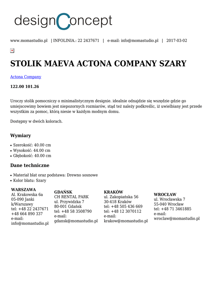 www.momastudio.pl | INFOLINIA.: 22 2437671 | e-mail: [email protected] | 2017-03-02 STOLIK MAEVA ACTONA COMPANY SZARY Actona Company 122.00 101.26 Uroczy stolik pomocniczy o minimalistycznym designie. idealnie odnajdzie się wszędzie gdzie go umiejscowimy bowiem jest niepozornych rozmiarów, stąd też należy podkreślic, iż uwielbiany jest przede wszystkim za pomoc, którą niesie w każdym modnym domu. Dostępny w dwóch kolorach. Wymiary ● ● ● Szerokość: 40.00 cm Wysokość: 44.00 cm Głębokość: 40.00 cm Dane techniczne ● ● Materiał blat oraz podstawa: Drewno sosnowe Kolor blatu: Szary WARSZAWA Al. Krakowska 6a 05-090 Janki k/Warszawy tel: +48 22 2437671 +48 664 890 337 e-mail: [email protected] GDAŃSK CH RENTAL PARK ul. Przywidzka 7 80-001 Gdańsk tel: +48 58 3508790 e-mail: [email protected] KRAKÓW ul. Zakopiańska 56 30-418 Kraków tel: +48 505 436 669 tel: +48 12 3070112 e-mail: [email protected] WROCŁAW ul. Wrocławska 7 55-040 Wrocław tel: +48 71 3461885 e-mail: [email protected]