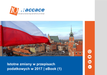 Istotne zmiany w przepisach podatkowych w 2017 | eBook (1) WSTĘP W najnowszym Tax Alercie chcielibyśmy przedstawić Państwu zmiany, jakie przynoszą nowelizacje przepisów podatkowych obowiązujących od 1 stycznia 2017r. Jeśli chcieliby Państwo szczegółowo przedyskutować i przeanalizować wpływ tych zmian na Państwa firmę, prosimy o kontakt z nami. 2 | Ważne zmiany w przepisach podatkowych w 2017 roku SPIS TREŚCI Podatek VAT .................................................................................................................................................................................................................... 4 Rozliczenie VAT kwartalne ........................................................................................................................................................................................... 4 Wprowadzenie sankcji VAT za nierzetelne rozliczenia ................................................................................................................................................. 4 Deklaracje elektroniczne ............................................................................................................................................................................................... 5 Podatek dochodowy od osób prawnych ...................................................................................................................................................................... 6 Obniżona stawka podatku ............................................................................................................................................................................................. 6 Niższy limit płatności gotówkowych między przedsiębiorcami ..................................................................................................................................... 7 3 | Ważne zmiany w przepisach podatkowych w 2017 roku PODATEK VAT Rozliczenie VAT kwartalne Począwszy od 1 stycznia 2017 r. rozliczeń kwartalnych w VAT może dokonywać jedynie „mały podatnik”, tj. podatnik, u którego wartość sprzedaży (wraz z kwotą podatku VAT) nie przekroczyła w poprzednim roku podatkowym wyrażonej w złotych kwoty odpowiadającej równowartości 1.200.000 Euro. Małym podatnikiem jest również podatnik rozpoczynający w trakcie roku podatkowego wykonywanie czynności podlegających opodatkowaniu podatkiem od towarów i usług, gdy przewidywana przez niego wartość sprzedaży nie przekroczy, w proporcji do okresu prowadzonej działalności gospodarczej ww. limitu. Wprowadzenie sankcji VAT za nierzetelne rozliczenia Ustawa ponownie wprowadza sankcje podatkowe w postaci dodatkowego zobowiązania w podatku VAT za nierzetelne rozliczanie tego podatku (poprzednio obowiązująca 30% sankcja VAT została usunięta z przepisów w 2008 r.). Jeżeli podatnik w złożonej deklaracji podatkowej wykazał: kwotę zobowiązania podatkowego niższą od kwoty należnej; 4 | Ważne zmiany w przepisach podatkowych w 2017 roku kwotę zwrotu różnicy podatku lub zwrotu podatku naliczonego wyższą od kwoty należnej; kwotę różnicy podatku, do obniżenia podatku należnego za następne okresy wyższą, od kwoty należnej; kwotę zwrotu różnicy podatku lub kwotę zwrotu podatku naliczonego, lub kwotę różnicy podatku do obniżenia podatku należnego za następne okresy, a powinien wykazać kwotę zobowiązania podatkowego podlegającą wpłacie do urzędu skarbowego, organ określi prawidłową wysokość tych kwot oraz ustali dodatkowe zobowiązanie podatkowe w wysokości odpowiadającej 30% kwoty zaniżenia zobowiązania podatkowego lub 30% kwoty zawyżenia zwrotu różnicy podatku, zwrotu podatku naliczonego lub różnicy podatku do obniżenia podatku należnego za następne okresy. Dodatkowe 30% zobowiązanie będzie ustalone również w sytuacji, gdy podatnik nie złoży deklaracji podatkowej oraz nie wpłaci podatku. Jeżeli po zakończeniu kontroli podatkowej lub w trakcie prowadzonego postępowania kontrolnego podatnik złoży korektę deklaracji i dokona zwrotu nienależnie uzyskanego zwrotu podatku to powyższa sankcja ulegnie zmniejszeniu do 20%. Dodatkowe zobowiązanie podatkowe nie będzie nakładane, gdy przed wszczęciem kontroli podatnik dokona samodzielnej korekty i wpłaty podatku oraz gdy zaniżenie zobowiązania lub zawyżenie zwrotu wynikało z błędów rachunkowych lub oczywistych omyłek. Natomiast w przypadkach świadomego uczestnictwa podatnika w oszustwach podatkowych i osiągania nieuprawnionych korzyści majątkowych kosztem budżetu państwa wysokość sankcji sięgnie odpowiednio 100% zaniżenia/zawyżenia. Deklaracje elektroniczne Mimo, że powszechny obowiązek składania deklaracji w formie elektronicznej wejdzie w życie od 1 stycznia 2018 r. to w odniesieniu do części podatników taki obowiązek wprowadzony jest od 1 stycznia 2017 r. Do składania deklaracji w tej formie obowiązani będą podatnicy VAT UE a także będący dostawcami towarów lub świadczącymi usługi, dla których podatnikiem jest nabywca i obowiązani do składania deklaracji, informacji oraz rocznego obliczenia podatku za pomocą środków komunikacji elektronicznej. 5 | Ważne zmiany w przepisach podatkowych w 2017 roku PODATEK DOCHODOWY OD OSÓB PRAWNYCH Obniżona stawka podatku Od 1 stycznia 2017 roku obowiązuje obniżona do 15% stawka podatku dochodowego od osób prawnych. Ze stawki tej mogą skorzystać (i) tzw. mali podatnicy, tj. podatnicy, u których wartość przychodu ze sprzedaży (wraz z kwotą VAT) nie przekroczyła w poprzednim roku podatkowym wyrażonej w złotych kwoty odpowiadającej równowartości 1.200.000 euro oraz (ii) podatnicy rozpoczynający działalność – w roku podatkowym, w którym rozpoczęli działalność. Jednocześnie ustawa wprowadza szereg wyłączeń spod 15% stawki, które obejmują m.in. podatkowe grupy kapitałowe, sporą grupę podatni