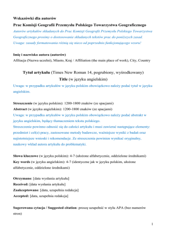 Wskazówki dla autorów Prac Komisji Geografii Przemysłu Polskiego Towarzystwa Geograficznego Autorów artykułów składanych do Prac Komisji Geografii Przemysłu Polskiego Towarzystwa Geograficznego prosimy o dostosowanie składanych tekstów prac do poniższych zasad. Uwaga: zasady formatowania różnią się nieco od poprzednio funkcjonującego wzoru! Imię i nazwisko autora (autorów) Afiliacja (Nazwa uczelni), Miasto, Kraj / Affiliation (the main place of work), City, Country Tytuł artykułu (Times New Roman 14, pogrubiony, wyśrodkowany) Title (w języku angielskim) Uwaga: w przypadku artykułów w języku polskim obowiązkowo należy podać tytuł w języku angielskim. Streszczenie (w języku polskim): 1200-1800 znaków (ze spacjami) Abstract (w języku angielskim): 1200-1800 znaków (ze spacjami) Uwaga: w przypadku artykułów w języku polskim obowiązkowo należy podać abstrakt w języku angielskim, będący tłumaczeniem tekstu polskiego. Streszczenie powinno odnosić się do całości artykułu i musi zawierać następujące elementy: przedmiot i cel(e) pracy, zastosowane metody badawcze, ważniejsze wyniki z badań oraz najistotniejsze wnioski i rekomendacje. Ze streszczenia powinien wynikać oryginalny, naukowy wkład autora artykułu do problematyki. Słowa kluczowe (w języku polskim): 4-7 (ułożone alfabetycznie, oddzielone średnikami) Key words (w języku angielskim): 4-7 (identyczne jak w języku polskim, ułożone alfabetycznie, oddzielone średnikami) Otrzymano: [data wysłania artykułu] Received: [data wysłania artykułu] Zaakceptowano: [data, uzupełnia redakcja] Accepted: [data, uzupełnia redakcja] Sugerowana cytacja / Suggested citation: proszę uzupełnić w stylu APA (bez numerów stron) 1 Tekst zasadniczy Proponujemy typowy podział artykułu na wprowadzenie (z przedmiotem, celem pracy, zakresem czasowym i przestrzennym, zastosowanymi metodami i źródłami danych w przypadku prac empirycznych), cześć zasadniczą (podzieloną na nienumerowane części ze śródtytułami) oraz zakończenie (w formie podsumowania bądź wniosków z dyskusją wyników). Preferowana długość artykułu 10-20 standardowych stron (razem z grafiką, tabelkami itp.), tj. 18000 – 36000 znaków (ze spacjami), marginesy strony A4: górny 2 cm, dolny 2 cm, lewy 1,5 cm, prawy 3,5 cm. Tekst publikacji należy składać stylem zasadniczym (standardowym; normalnym) w programie Microsoft Word i zapisywać w formatach: doc, docx lub rtf. Śródtytuły powinny być zaznaczone pogrubionym charakterem pisma, z odstępem 1 wiersza przed, bez numeracji. Nie stosować automatycznych list wyliczania i list punktorów. Niedopuszczalne jest stosowanie wcięć akapitowych przy pomocy klawiszy spacji i tabulatora. Nie należy używać innych stylów akapitowych i stylów znakowych. Numerację stron ciągła w prawym dolnym rogu. Przypisy dolne, numerowane ciągle (wstawiane automatycznie, w Wordzie funkcja: “Wstaw/Przypis”), tylko w sytuacjach absolutnie niezbędnych. Uwaga: przypisów nie należy używać jako odnośników do bibliografii. Tekst podstawowy pisany podstawowym krojem pisma Times New Roman, wielkość czcionki 12 punktów, odstępy między wierszami – 1,5 wiersza, bez dzielenia wyrazów, bez automatycznych wyróżnień i wyliczeń. Prosimy nie używać podkreśleń w tekście. W tekście można umieszczać tabele z wielkością czcionki 10 punktów. Tabele nie powinny przekraczać formatu kolumny czasopisma tj. 13x19 cm, w przeciwnym razie muszą być podzielone między 2 strony. Ryciny (schematy, rysunki itp.) prosimy dostosować do formatu kolumny czasopisma tj. 13x19 cm (uwaga: tekst w niniejszym wzorze formatowania ma szerokość 16 cm, a długość 25 cm!). Opisy na wykresach powinny być proporcjonalne do wielkości rysunku. Tytuły tabel, rycin i fotografie powinny być numerowane (Tab. 1, Tab. 2 itd., Ryc. 1, Ryc. 2 itd., Fot. 1, Fot. 2 itd.), normalnym krojem czcionki. Pod tabelami i rycinami powinno być podane źródło, także jeśli to jest opracowanie własne autorów. W przypadku opracowań graficznych bazujących na pracach innych autorów lub danych statystycznych proszę podać źródło, na podstawie którego autorzy opracowali rycinę. Cytaty powinny być opatrzone informacją bibliograficzną w tekście głównym (w nawiasie: autor, rok wydania: strona). W przypadku odwołań bez dosłownego cytatu nie ma obowiązku podawania stron (w nawiasie wystarczy: autor, rok wydania). W przypadku wielu 2 autorów o tym samym nazwisku prosimy użyć inicjału imienia, w przypadku wielu prac tego samego autora z tego samego roku kolejne prace oznaczamy literami przy dacie wydania a,b,c itd.). Prace różnych autorów oddzielamy średnikami. Prace zbiorowe pod redakcją, jeśli odwołanie dotyczy całej pozycji, a nie konkretnego jej fragmentu, który ma swój tytuł i autora, należy traktować jak autorską publikację książkową, ale w wykazie bibliografii na końcu należy oznaczyć ją (red.). Przykłady poprawnego zapisu odwołań bibliograficznych w tekście: (Nowak, 2000) (Nowak, 2000: 15) (Kowalski, 2000a) (Kowalski, 2000b) (Nowak, 2000, 2002; Długopolski, Kowalski, 2006; Michalski, 2007) (A. Kowalski, 2007; B. Kowalski, 2008) Grafika Obiekty graficzne (schematy, wykresy, zdjęcia) należy umieszczać w osobnych plikach (najlepiej w formie edytowalnej). Dane, na podstawie których są generowane wykresy, należy dostarczać w osobnych plikach w formie tabel (np. plik MS Excel). Pliki MS Excel powinny być również dostarczane osobno i zawierać jedynie 1 arkusz z danymi i 1 wykres. Grafika wektorowa – preferowane programy: CorelDraw i format CDR oraz Adobe Illustrator – i formaty Ai, EPS lub PDF (z możliwością edycji). Grafika wektorowa powinna być zapisana w trybie CMYK bez użycia kolorów dodatkowych (najlepiej czarno-biała lub stopnie szarości). Grafika bitmapowa – przy proporcji 1:1 rozdzielczość 300 ppi, tryb koloru s-RGB lub Adob