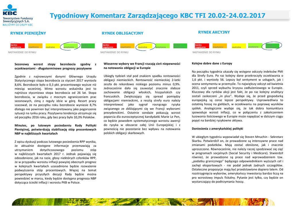 Tygodniowy Komentarz Zarządzającego KBC TFI 20.02-24.02.2017 RYNEK PIENIĘŻNY bardzo negatywne negatywne neutralne RYNEK AKCYJNY RYNEK OBLIGACYJNY pozytywne bardzo pozytywne NASTAWIENIE DO RYNKU bardzo negatywne negatywne neutralne pozytywne bardzo pozytywne NASTAWIENIE DO RYNKU Sezonowy wzrost stopy bezrobocia zgodny z oczekiwaniami - długoterminowe prognozy pozytywne Wiosenne wybory we Francji rzucają cień niepewności na notowania obligacji w Europie Zgodnie z najnowszymi danymi Głównego Urzędu Statystycznego stopa bezrobocia za styczeń 2017 wyniosła 8,6%. Bezrobocie było o 0,3 pkt. procentowego wyższe niż miesiąc wcześniej. Mimo wzrostu wskaźnika jest to najniższa styczniowa stopa bezrobocia od 26 lat. Stopa bezrobocia, w związku z mocnym ograniczeniem prac sezonowych, zimą z reguły idzie w górę. Resort pracy szacował, że na początku roku bezrobocie wyniesie 8,7% dlatego nie powinien być interpretowany jako pogorszenie sytuacji na rynku pracy. Pozytywna tendencja utrzymuje się od początku 2016 roku, gdy bez pracy było 10,3% Polaków. Ubiegły tydzień stał pod znakiem spadku rentowności obligacji niemieckich. Rentowność niemieckiej 2-latki zeszła do rekordowo niskiego poziomu minus 0,9%. Jednocześnie dało się zauważyć znacznie słabsze zachowanie obligacji włoskich, hiszpańskich czy francuskich. Zwiększający się spread pomiędzy obligacjami niemieckimi, a resztą strefy euro należy interpretować jako sygnał rosnącego ryzyka związanego ze zbliżającymi się we Francji wyborami prezydenckimi. Ostatnie sondaże pokazują wzrost poparcia dla eurosceptycznej kandydatki Marie Le Pen, co będzie powodem systematycznego wzrostu awersji do ryzyka w obszarze całej Unii Europejskiej i z pewnością nie pozostanie bez wpływu na notowania polskich obligacji skarbowych. Minutes, po lutowym posiedzeniu Rady Polityki Pieniężnej, potwierdzają stabilizację stóp procentowych NBP w najbliższych kwartałach Z opisu dyskusji podczas lutowego posiedzenia RPP wynika, że aktualnie dostępne informacje przemawiają za utrzymaniem dotychczasowego poziomu stóp w najbliższych kwartałach 2017 r. Jednak pojawiają się odosobnione, jak na razie, głosy niektórych członków RPP, że w przypadku wzrostu inflacji powyżej obecnych prognoz w kolejnych kwartałach uzasadnione będzie rozważenie podwyższenia stóp procentowych. Więcej na temat perspektywy przyszłych decyzji Rady będzie można powiedzieć w marcu, kiedy będzie dostępna prognoza NBP dotycząca ścieżki inflacji i wzrostu PKB w Polsce. bardzo negatywne negatywne neutralne pozytywne bardzo pozytywne NASTAWIENIE DO RYNKU Kolejne dobre dane z Europy Na początku tygodnia ukazały się wstępne odczyty indeksów PMI dla Strefy Euro. Po raz kolejny dane przekroczyły oczekiwania o 1,6 pkt. i wyniosły 56. Lepszy był sentyment w usługach, jak i ocena sentymentu w przemyśle. To największy odczyt od kwietnia 2011, czyli sprzed wybuchu kryzysu zadłużeniowego w Europie. Kluczowy dla rynków akcji jest fakt, że po raz kolejny analitycy zostali zaskoczeni „in plus”. Wydaje się, że przed gospodarką europejską są coraz lepsze perspektywy. Usprawiedliwia to ostatnią hossę na giełdach, w oczekiwaniu na poprawę wyników spółek. Analogicznie wydaje się, że tak dobra koniunktura spowoduje wzrost inflacji, co w połączeniu z zakończeniem luzowania ilościowego w Europie może napędzać w dalszym ciągu popyt na bardziej ryzykowne aktywa. Doniesienia z amerykańskiej polityki W ubiegłym tygodniu wypowiadał się Steven Mnuchin - Sekretarz Skarbu. Potwierdził on, że prowadzone są intensywne prace nad zmianami podatków. Mają zostać obniżone, jak i znacznie uproszczone. Równocześnie, nie należy raczej spodziewać się cięć w programach socjalnych (Social Security i Medicare). Stwierdził również, że prowadzone są prace nad wprowadzeniem tzw. „podatku granicznego” będącego odpowiednikiem wyższych ceł i zachęt eksportowych - nie podał jednak żadnych szczegółów. Ostateczne propozycje mają być przedstawione dopiero latem. Od rozstrzygnięcia wyborów, amerykańscy inwestorzy bardzo liczą na pro wzrostowy impuls fiskalny. Pytanie jest tylko, czy będzie on wystarczający do podtrzymania hossy. Tygodniowy Komentarz Zarządzającego KBC TFI 20.02-24.02.2017 Wydarzenia z rynku akcyjnego Wydarzenia z rynku obligacyjnego i pieniężnego Było: Artur Ratyński Zarządzający Portfelami Biuro Zarządzania Aktywami Było: • Dane z Polski: stopa bezrobocia 8,6% - zgodnie z oczekiwaniami • Dane makroekonomiczne z USA: indeksy PMI, sprzedaż nowych domów - poniżej oczekiwań, indeks zaufania konsumentów Uniwersytetu Michigan, sprzedaż domów na rynku wtórnym, nowo-zarejestrowani bezrobotni - powyżej prognoz • Dane z Europy: indeks zaufania konsumentów - poniżej oczekiwań, PMI przemysłu, PMI usług, Inflacja CPI - powyżej prognoz Będzie: • Wstępny odczyt PMI dla przemysłu oraz usług w USA poniżej oczekiwań • Kolejna porcja danych z amerykańskiego rynku nieruchomości – sprzedaż domów na rynku wtórnym i pierwotnym - pozytywnie, powyżej oczekiwań • Wskaźnik IFO w Niemczech - 104, nieznacznie powyżej oczekiwań, pozytywnie Jakub Bentke Zarządzający Portfelami Biuro Zarządzania Aktywami • Dane z Polski: Indeks PMI przemysłu, PKB za IV kw. 2016 r. • Dane makroekonomiczne z USA: Indeks Chicago PMI, indeks Conference Board, zamówienia na dobra trwałego użytku, Indeks ISM przemysłu oraz dla branż poza przemysłowych • Dane z Europy: stopa bezrobocia, Inflacja PPI, sprzedaż detaliczna Będzie: • Wystąpienie prezydenta Trumpa przed kongresem • Ostateczne odczyty PMI dla Europy • Drugi odczyt amerykańskiego PKB KBC Towarzystwo Funduszy Inwestycyjnych S.A. Ul. Chmielna 85/87; 00-805 Warszawa www.kbctfi.pl Infolinia: (22) 582 88 58 (opłata wg taryfy operatora) Dotyczy funduszy i produktów inwestycyjnych zarządzan