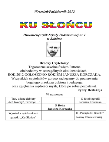 Wrzesień/Październik 2012 Dwumiesięcznik Szkoły Podstawowej nr 1 w Sobótce Drodzy Czytelnicy! Tegoroczne szkolne Święto Patrona obchodzimy w szczególnych okolicznościach ROK 2012 OGŁOSZONO ROKIEM JANUSZA KORCZAKA. Wszystkich czytelników gorąco zachęcamy do poznawania bogatego przekazu doktora i pedagoga oraz zgłębiania mądrości myśli, które po sobie pozostawił. życzy Redakcja W numerze: Trzy udane debiuty „Ach tworzyć, tworzyć…” O fotobiografii Janusza Korczaka O Roku Janusza Korczaka Wywiad z opiekunkami gazetki „Ku Słońcu” O „Pamiętniku Blumki” Joanny Chmielewskiej Ale to już było… Polski wrzesień W szkole zorganizowany został projekt „Polski wrzesień”. Dotyczył on wybuchu drugiej wojny światowej. Nasza klasa, podobnie jak pozostałe piąte i szóste, wzięła udział w lekcji historycznej, która odbyła się w bibliotece. Szukaliśmy informacji na temat Westerplatte oraz oglądaliśmy film „O honor żołnierza”. Następnie w klasie analizowaliśmy wiersz Konstantego Ildefonsa Gałczyńskiego „Pieśń o żołnierzach z Westerplatte”, a w domu przygotowaliśmy jego graficzną interpretację – plakaty. Prace te można było obejrzeć na wystawie wyeksponowanej na szkolnym korytarzu. 17 września udaliśmy się pod cokół, by zapalić znicz ku pamięci „tych, których los i historia rzuciły na te ziemie w poszukiwaniu domu i ojczyzny”. 27 września, na lekcji wychowawczej, odbył się apel, na który zostały zaproszone wdowy po kombatantach. Na początku dwoje uczniów z klasy VIa zaprezentowało literacki dialog ojca i córki. To było przejmujące. Dziewczynka wyrażała swoje obawy przed wojną. Pozostali szóstoklasiści recytowali wiersze i śpiewali żołnierskie piosenki przy akompaniamencie gitar. Na zakończenie, uczniowie młodszych klas wręczyli gościom kwiaty. Bogata scenografia nawiązywała do jesieni. Na podłodze leżały różnokolorowe liście, a na środku ustawione zostało ognisko. Obok niego siedział żołnierz. W tle było widać brzozy oraz bukiety wrzosów. Nie zbrakło również biało-czerwonej flagi oraz godła Polski. Zgromadzeni uczniowie dobrze się zachowywali, byli odpowiednio ubrani, a najważniejsze, że z uwagą wsłuchiwali się w treść programu. Panie, które gościły u nas w szkole, były wzruszone. Pamięć o bohaterach pozostanie. Kinga Pietraszek Okiem młodego odkrywcy Sprzątanie świata Akcja ,,Sprzątanie świata” wywodzi się z Australii. Po raz pierwszy została przeprowadzona w 1989 roku. Wtedy 40 tysięcy mieszkańców Sydney wzięło udział w akcji sprzątania terenów portu. Już rok później kampania objęła całą Australię, a liczba jej uczestników z roku na rok wzrastała. Poszerzył się także zakres terytorialny tego przedsięwzięcia. Dziś jest to akcja światowa, organizowana co roku we wrześniu. Funkcję międzynarodowego koordynatora pełni organizacja społeczna Clean up Australia. Hasło przewodnie na 2012 rok brzmi: „Kocham, lubię, szanuję… nie śmiecę”. Do tego szlachetnego czynu co rok przyłącza się nasza szkoła. Wiktoria Kuriata Pracowici czwartoklasiści 20 września, po lekcjach, uczniowie klasy 4B wraz z wychowawczynią, panią Małgorzatą Reszke, udali się na wycieczkę do Ślężańskiego Parku Krajobrazowego. Wszyscy mieli ze sobą rękawiczki i worki na śmieci. Uczniowie z zaangażowaniem zbierali odpady pozostawione przez innych ludzi. Gdy wrócili z długiej trzygodzinnej wycieczki, wszystkie śmieci posegregowali i wyrzucili do różnych kontenerów: osobno szkło białe, szkło kolorowe, papier, plastik. Młodzież była trochę zmęczona, ale bardzo zadowolona z efektów swej pracy. Zuzanna Cecot Znani i lubiani Łozo, czyli Wojciech Łozowski „Łozo”, czyli Wojciech Łozowski urodził się w 1984 roku. Jest wokalistą grupy „Afromental” oraz barwną osobowością telewizyjną. Występował jako uczestnik w Tańcu z gwiazdami, a od ponad roku pełni funkcję jurora w programie Must Be the Music. Program „Tylko muzyka” zapewnił mu sympatię szerokiej publiczności. Aktywnie brał udział w akcji promocyjnej „Mazury – cud natury”, wykonując utwór „Cudne Mazury”. Oprac. Red. Śmiech po zdrowie - Jasiu, dlaczego spóźniłeś się na lekcje? - chce wiedzieć pani wychowawczyni. - Bo jak szedłem do szkoły, to napadł mnie uzbrojony bandyta. - O Boże, dziecko, czy nic ci się nie stało?! - Owszem, zabrał mi zeszyt z wypracowaniem. Na lekcji geografii nauczyciel pyta Jasia: - Która rzeka jest dłuższa: Ren czy Missisipi? - Oczywiście, Missisipi. - Doskonale, a czy wiesz, o ile dłuższa? - Dokładnie o sześć liter. Każdy kęs ma swój sens Ryż preparowany z krówkami Składniki: ½ kg cukierków „Krówek” 1-2 opakowanie ryżu preparowanego (zależnie ile chcemy) kostka masła Sposób przygotowania: Do rondelka wrzuć kostkę masła i krówki. Podgrzej, mieszając, do powstania jednolitej masy. Ryż wsyp do miski i polej masą krówkową. Poczekaj, aż wystygnie (5-10 minut). Uformuj kulki. Gotowe! Proponuje i życzy smacznego – Wiktoria Kondracka Zespół redakcyjny numeru: Zuzanna Cecot (IVb), Weronika Chmielewska (Va), Wiktoria Kondracka (VIb), Wiktoria Kuriata (IVb), Nikola Machura (Va), Kinga Pietraszek (VIb), Natalia Tymińska (Va). Opiekunki: Justyna Drygalska, Ewa Dąbrowska. Ach tworzyć, tworzyć… Tomek na wojnie Tomek, gdy obejrzał film o żołnierzach, sam chciał się znaleźć na polu bitwy. Rozmyślał o tym cały wieczór, aż poczuł senność i poszedł spać. Nagle coś zaświeciło mu w oczy. Gdy je otworzył, był zaskoczony. Obudził się w ruinach własnego domu! Zauważył, że ludzie gdzieś uciekają, ale nie wiedział przed czym. Po chwili poczuł na sobie czyjś wzrok. Chłopiec został uderzony w głowę i zemdlał. (ciąg dalszy nastąpi) Weronika Chmielewska „Przygoda harcerzy” Zeszłego lata harcerze wybrali się na obóz. Dni spędzali