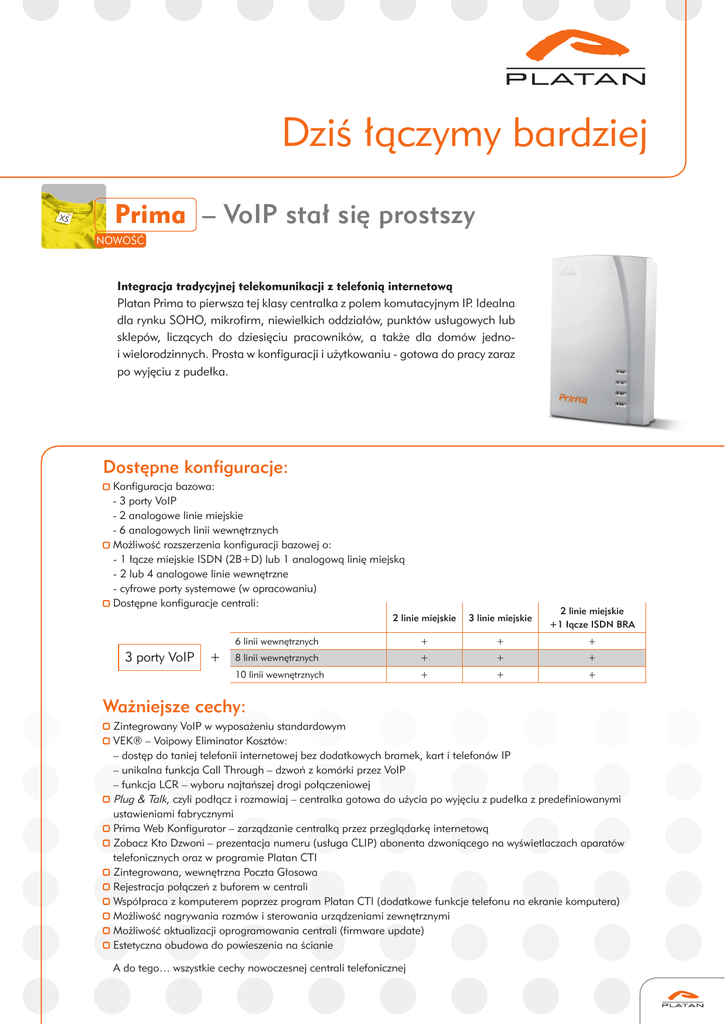 Dziś łączymy bardziej Prima – VoIP stał się prostszy NOWOŚĆ Integracja tradycyjnej telekomunikacji z telefonią internetową Platan Prima to pierwsza tej klasy centralka z polem komutacyjnym IP. Idealna dla rynku SOHO, mikrofirm, niewielkich oddziałów, punktów usługowych lub sklepów, liczących do dziesięciu pracowników, a także dla domów jednoi wielorodzinnych. Prosta w konfiguracji i użytkowaniu - gotowa do pracy zaraz po wyjęciu z pudełka. Dostępne konfiguracje: Konfiguracja bazowa: - 3 porty VoIP - 2 analogowe linie miejskie - 6 analogowych linii wewnętrznych Możliwość rozszerzenia konfiguracji bazowej o: -1 łącze miejskie ISDN (2B+D) lub 1 analogową linię miejską -2 lub 4 analogowe linie wewnętrzne -cyfrowe porty systemowe (w opracowaniu) Dostępne konfiguracje centrali: 3 porty VoIP + 2 linie miejskie 3 linie miejskie 2 linie miejskie +1 łącze ISDN BRA 6 linii wewnętrznych + + + 8 linii wewnętrznych + + + 10 linii wewnętrznych + + + Ważniejsze cechy: Zintegrowany VoIP w wyposażeniu standardowym VEK® – Voipowy Eliminator Kosztów: – dostęp do taniej telefonii internetowej bez dodatkowych bramek, kart i telefonów IP – unikalna funkcja Call Through – dzwoń z komórki przez VoIP – funkcja LCR – wyboru najtańszej drogi połączeniowej Plug & Talk, czyli podłącz i rozmawiaj – centralka gotowa do użycia po wyjęciu z pudełka z predefiniowanymi ustawieniami fabrycznymi Prima Web Konfigurator – zarządzanie centralką przez przeglądarkę internetową Zobacz Kto Dzwoni – prezentacja numeru (usługa CLIP) abonenta dzwoniącego na wyświetlaczach aparatów telefonicznych oraz w programie Platan CTI Zintegrowana, wewnętrzna Poczta Głosowa Rejestracja połączeń z buforem w centrali Współpraca z komputerem poprzez program Platan CTI (dodatkowe funkcje telefonu na ekranie komputera) Możliwość nagrywania rozmów i sterowania urządzeniami zewnętrznymi Możliwość aktualizacji oprogramowania centrali (firmware update) Estetyczna obudowa do powieszenia na ścianie A do tego… wszystkie cechy nowoczesnej centrali telefonicznej Funkcje i usługi Prima Wyposażenie Prima Porty abonenckie Obsługa trzech operatorów VoIP (SIP) + Wybór najtańszej drogi połączeniowej LCR + Numery DDI / MSN - dla ISDN oraz VoIP + CLIP (prezentacja numeru przychodzącego) + Call Through - automatyczne połączenia z telefonów komórkowych do sieci VoIP + Rejestracja połączeń + Poczta Głosowa + Łącznie max ilość linii miejskich: 7 Restrykcje połączeń wychodzących + Protokół VoIP: SIP 2.0 + Tablice numerów zabronionych/dozwolonych (ilość tablic) 2 Kodeki audio: G.711 µLaw, G.711 aLaw, ADPCM, G.726, GSM +/+/+/+/+ Numery skrócone + DISA – bezpośrednie wybieranie numerów wewn. + Ilość zapowiedzi głosowych 8 Dowolność numeracji wewnętrznej (ilość cyfr) 1-4 analogowe 6, 8 lub 10 systemowe* 2 Łącznie max ilość tel. wewn. 10 Wyposażenia miejskie analogowe 2 lub 3 ISDN (2B+D) 1 VoIP 3 Sygnalizacja połączenia oczekującego (oferowanie) + Włączanie się do trwającej rozmowy + Gorące linie (miejskie / wewnętrzne) + Automatyczna zmiana trybów pracy + Grupy wspólnego wywołania (numery grupowe) 2 Połączenie konferencyjne (max ilość abonentów) 8 Bufor rejestracji połączeń Zawieszenie połączenia HOLD + Odbiór identyfikacji numerów dzwoniących (CLIP): Przenoszenie wywołania + „Nie przeszkadzać” + Przechwytywanie wywołań + Przekazywanie połączeń na miasto + porty wewnętrzne + Zamawianie połączeń + wewnętrzne porty systemowe* + Komunikat głosowy dla zamówionych połączeń + Współpraca z bramofonem DB 07 + Redial (ponowne wybieranie numeru) + Sterowanie urządzeniami zewnętrznymi + Proste oddzwanianie + Budzenie + Podsłuch odległego pomieszczenia –„niańka” + Połączenie tranzytowe – wykonanie z zewnątrz rozmowy na koszt centrali w standardzie w opcji + Łączny czas pamięci głosowej** na Pocztę Głosową i zapowiedzi słowne 20 min. Melodie dla połączeń oczekujących 4 Pliki muzyczne .wav (wymagają karty SD**) + Obsługa kart pamięci SD** + Automatyczny transfer faksu + 5 000 z linii ISDN + z linii analogowych + z linii VoIP + Wysyłanie identyfikacji numerów (CLIP) na: Zasilanie rezerwowe UPS Interfejsy 1 USB Ethernet (LAN) 1 Zarządzanie przez przeglądarkę internetową + Program Platan CTI + Wymiary - wys. x szer. x gł. [mm] - masa [kg] * w opracowaniu ** po wprowadzeniu obsługi karty SD łączny czas pamięci głosowej przeznaczonej na Pocztę Głosową, zapowiedzi słowne wykorzystywane w funkcji DISA, nagrywanie rozmów oraz wgrywane pliki muzyczne będzie zależny od pojemności zastosowanej karty. 295x200x47 1,6 wydanie 2009 Producent Systemów Telekomunikacyjnych Platan Sp. z o.o., 81-855 Sopot, ul. Platanowa 2 tel. +48 58 555 88 00, fax +48 58 555 88 01, [email protected], www.platan.pl Certyfikat ISO 9001:2000 Niniejszy folder nie stanowi oferty w rozumieniu prawa handlowego. Zastrzegamy sobie możliwość wprowadzenia zmian