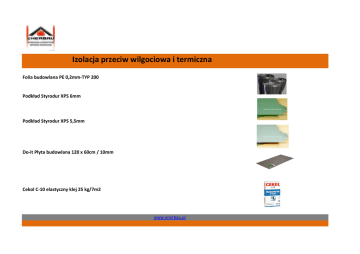 Izolacja przeciw wilgociowa i termiczna Folia budowlana PE 0,2mm-TYP 200 Podkład Styrodur XPS 6mm Podkład Styrodur XPS 5,5mm Do-it Płyta budowlana 120 x 60cm / 10mm Cekol C-10 elastyczny klej 25 kg/7m2 www.enerbau.pl