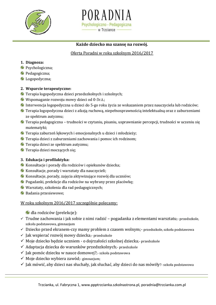 Każde dziecko ma szansę na rozwój. Oferta Poradni w roku szkolnym 2016/2017 1. Diagnoza: Psychologiczna; Pedagogiczna; Logopedyczna; 2. Wsparcie terapeutyczne: Terapia logopedyczna dzieci przedszkolnych i szkolnych; Wspomaganie rozwoju mowy dzieci od 0-3r.ż.; Interwencja logopedyczna u dzieci do 5-go roku życia ze wskazaniem przez nauczyciela lub rodziców; Terapia logopedyczna dzieci z afazją ruchową, niepełnosprawnością intelektualną oraz z zaburzeniami ze spektrum autyzmu; Terapia pedagogiczna – trudności w czytaniu, pisaniu, usprawnianie percepcji, trudności w uczeniu się matematyki; Terapia zaburzeń lękowych i emocjonalnych u dzieci i młodzieży; Terapia dzieci z zaburzeniami zachowania i pomoc ich rodzinom; Terapia dzieci ze spektrum autyzmu; Terapia dzieci moczących się; 3. Edukacja i profilaktyka: Konsultacje i porady dla rodziców i opiekunów dziecka; Konsultacje, porady i warsztaty dla nauczycieli; Konsultacje, porady, zajęcia aktywizujące rozwój dla uczniów; Pogadanki, prelekcje dla rodziców na wybrany przez placówkę; Warsztaty, szkolenia dla rad pedagogicznych; Badania przesiewowe; W roku szkolnym 2016/2017 szczególnie polecamy: dla rodziców (prelekcje): Trudne zachowania i jak sobie z nimi radzić – pogadanka z elementami warsztatu;- przedszkole, szkoła podstawowa, gimnazjum Dziecko przed ekranem-czy mamy problem z czasem wolnym;- przedszkole, szkoła podstawowa Jak wspierać rozwój mowy dziecka;- przedszkole Moje dziecko będzie uczniem - o dojrzałości szkolnej dziecka;- przedszkole Adaptacja dziecka do warunków przedszkolnych;- przedszkole Jak pomóc dziecku w nauce domowej?;- szkoła podstawowa Moje dziecko wybiera zawód;- gimnazjum; Jak mówić, aby dzieci nas słuchały, jak słuchać, aby dzieci do nas mówiły?- szkoła podstawowa Trzcianka, ul. Fabryczna 1, www.ppptrzcianka.szkolnastrona.pl, [email protected] Zaburzenia psychiczne dzieci i młodzieży- kiedy się martwić, a kiedy nie;- gimnazjum, szkoła ponadgimnazjalna Prawidłowości i kryzysy rozwojowe- kiedy szukać pomocy u specjalisty;- przedszkole, gimnazjum, szkoła ponadgimnazjalna Jak rozbudzić w dziecku ciekawość świata? - pogadanka z elementami warsztatu;- przedszkole Cyberprzemoc - komputerowy zawrót głowy;- szkoła podstawowa, gimnazjum, szkoła ponadgimnazjalna; Czy istnieją ponadczasowe wartości w wychowaniu, czyli od czułości do szacunku;- przedszkole, szkoła podstawowa gimnazjum,szkoła ponadgimnazjalna, dla nauczycieli ( warsztaty, prelekcje): Praca z dzieckiem z zaburzeniami zachowania - zespół Aspergera, Autyzm, ADHD; Warsztat z emisji głosu; Jak interpretować informacje zawarte w dokumentach wydawanych przez PPP?; Procedura „ Niebieskie karty” w placówce oświatowej; dla uczniów( warsztaty, prelekcje, pogadanki): Zajęcia wspierające młodzież w wyborze ścieżki kariery zawodowej; - dla uczniów gimnazjum Jak się skutecznie uczyć?;- dla uczniów szkół podstawowych, gimnazjów, szkół ponadgimnazjalnych Jak radzić sobie z trudnymi emocjami?; - zajęcia dla uczniów szkół podstawowych, gimnazjów, szkół ponadgimnazjalnych Twórcza godzina - zajęcia dla uczniów zdolnych; – na terenie PPP, dla uczniów szkół podstawowych Niepełnosprawni są wśród nas;- zajęcia warsztatowe dla uczniów szkół podstawowych, gimnazjów i szkół ponadgimnazjalnych; Zajęcia warsztatowe mające na celu przygotowanie zespołu klasowego do przyjęcia ucznia z autyzmem;- dla uczniów szkół podstawowych i gimnazjów, szkół ponadgimnazjalnych; Jak cię słyszą tak cię widzą;- zajęcia dla uczniów szkół podstawowych, gimnazjów, szkół ponadgimnazjalnych Stres-jak sobie z nim radzić; -zajęcia dla uczniów szkół podstawowych, gimnazjów, szkół ponadgimnazjalnych W miarę możliwości oferujemy przygotowanie innych form tematycznych odpowiadających na zapotrzebowanie placówek. 4. 5. 6. 7. 8. Doradztwo zawodowe dla uczniów gimnazjów i szkół ponadgimnazjalnych; Interwencje kryzysowe; Grupa wsparcia dla rodziców dzieci z zaburzeniami ze spektrum autyzmu; Wspomaganie szkół w ich rozwoju - jako organizacji uczących się; Prowadzenie sieci współpracy i doskonalenia dla pedagogów, psychologów szkolnych oraz logopedów; 9. Posiedzenia zespołów interdyscyplinarnych działających na rzecz dzieci; Ponadto: Współpraca z Biblioteką Pedagogiczną Filią CDN w Pile; Grupy wsparcia dla pedagogów szkolnych w formie sieci współpracy; Upowszechniamy wiedzę w środowisku o autyzmie - Dzień Świadomości Autyzmu; Współpraca z instytucjami z terenu MiG Trzcianka w ramach Ogólnopolskiego Tygodnia Pomocy Ofiarom Przestępstw; Zapraszamy! Trzcianka, ul. Fabryczna 1, www.ppptrzcianka.szkolnastrona.pl, [email protected]