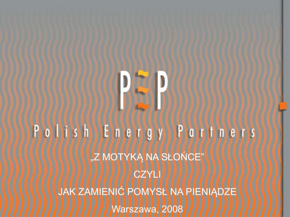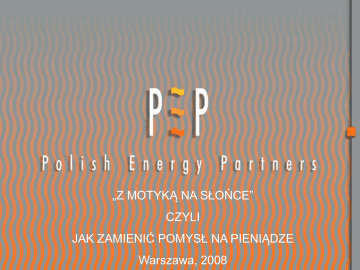 1 „Z MOTYKĄ NA SŁOŃCE” CZYLI JAK ZAMIENIĆ POMYSŁ NA PIENIĄDZE Warszawa, 2008 O czym będziemy mówić • Wstęp – czyli historia Polish Energy Partners S.A. – PEP dzisiaj – Powstanie i rozwój firmy 2 • Jak pozyskać kapitał na swój pomysł - przykład PEP – Dlaczego PEP zdobył inwestorów – Zasady współpracy z inwestorami – A o tym zazwyczaj się nie mówi… Wojciech P. Cetnarski dla CambridgePython Warszawa, marzec 2010 • Wstęp – czyli historia Polish Energy Partners S.A. – PEP dzisiaj – Powstanie i rozwój firmy 3 • Jak pozyskać kapitał na swój pomysł - przykład PEP – Dlaczego PEP zdobył inwestorów – Zasady współpracy z inwestorami – A o tym zazwyczaj się nie mówi… Wojciech P. Cetnarski dla CambridgePython Warszawa, marzec 2010 PEP Dzisiaj Wiodąca firma w outsourcingu usług energetycznych dla przemysłu Wybudowała i zarządza mocą ponad 700 MW Pionier i lider energetyki odnawialnej w Polsce Posiada aktywa warte ok. 500.000.000 PLN Zatrudnia 180 osób Spółka publiczna, obecna od 05/2005 na GPW 108.000.000 PLN sprzedaży i 46.000.000 PLN zysku w 2009 r. Wojciech P. Cetnarski dla CambridgePython Warszawa, marzec 2010 4 PEP Dzisiaj 5 Wojciech P. Cetnarski dla CambridgePython Warszawa, marzec 2010 Gdzie jest PEP? Spring 2006 Puck Wind Farm 22MWe Autumn 2006 May 2002 Mondi Mondi Paper Plant Paper Plant New Turbine Biomass CFB 33MWe Coal CHP 98MWe + 360MWt 6 January 2001 Metsa Tissue Paper Plant Coal CHP 6MWe + 95MWt October 2005 Mercury Coke Plant Coke gas power plant 8.3MWe Wojciech P. Cetnarski dla CambridgePython July 1999 Wizów Chemical Plant Gas CHP 4MWe + 42MWt October 2000 Zakrzów Whirpool Plant Gas CHP 3MWe + 36MWt Warszawa, marzec 2010 • Wstęp – czyli historia Polish Energy Partners S.A. – PEP dzisiaj – Powstanie i rozwój Firmy 7 • Jak pozyskać kapitał na swój pomysł - przykład PEP – Dlaczego PEP zdobył inwestorów – Zasady współpracy z inwestorami – A o tym zazwyczaj się nie mówi… Wojciech P. Cetnarski dla CambridgePython Warszawa, marzec 2010 Jak powstał PEP – Grupa specjalistów (4 osoby) świadcząca usługi konsultingowe dla sektora energetycznego, przygotowała „business plan” dla pierwszego polskiego przedsiębiorstwa typu „IPP” (niezależny producent energii) – Opracowany plan ukazywał możliwości wykreowania w określonym czasie przedsiębiorstwa o znaczącej wartości rynkowej. – Analiza istniejącego rynku energetycznego przekonywująco wskazywała na istnienie miejsca dla takiego przedsiębiorstwa – Połączone wiedza, doświadczenia i umiejętności grupy zarządzającej pozwalały na realizację proponowanego planu. Wojciech P. Cetnarski dla CambridgePython Warszawa, marzec 2010 8 Opis Firmy • Udziałowcy: 3 amerykańskie fundusze inwestycyjne, zarządzane przez Enterprise Investors i Grupa Menedżerska • Kapitał początkowy: 15.000.000 USD, co pozwoli wybudować obiekty o łącznej mocy ok. 100 MWe • Własny zespół inżynierów i analityków współpracuje z najlepszymi amerykańskimi i europejskimi firmami inżynierskimi i deweloperskimi Wojciech P. Cetnarski dla CambridgePython Warszawa, marzec 2010 9 Misja Firmy Polish Energy Partners jako niezależny producent energii oferuje dostawy energii elektrycznej i cieplnej dla odbiorców przemysłowych i komunalnych, samodzielnie finansując budowę lub modernizację jej źródeł Wykorzystywana przez nas gospodarka skojarzona pozwala zaopatrywać naszych odbiorców w energię w sposób najefektywniejszy ekonomicznie i przyjazny dla środowiska naturalnego Wojciech P. Cetnarski dla CambridgePython Warszawa, marzec 2010 10 Zasady Funkcjonowania PEP - Model biznesowy 11 Zakład Energet. zasilanie awaryjne opłaty Odbiorca Energii energia cieplna energia elektryczna Wojciech P. Cetnarski dla CambridgePython inwestycja paliwo ochrona środowiska remonty modernizacje zatrudnienie Warszawa, marzec 2010 Poszukiwanie przewagi konkurencyjnej - Technologia • Większość zakładów przemysłowych w Polsce, nie wykorzystuje kogeneracji energii elektrycznej i ciepła, lecz produkuje wyłącznie ciepło, a energię el. kupuje w elektrowniach • Zastosowanie kogeneracji powinno zaowocować spadkiem kosztów pozyskania energii dla zakładu Wojciech P. Cetnarski dla CambridgePython 12 Warszawa, marzec 2010 Początki - Elektrociepłownia „Wizów” Elektrociepłownia przemysłowa - kompletny nowy obiekt zbudowany, sfinansowany i eksploatowany przez PEP Turbina Centaur 50 o mocy nominalnej 4,4 MWe (ISO) Kocioł odzysknicowy parowy o wydajności 10,5 t/h Dwa dodatkowe kotły parowe, gazowo - olejowe o wydajności 14,5 t/h każdy Wojciech P. Cetnarski dla CambridgePython Warszawa, marzec 2010 13 Rozwój PEP 1997-2003 14 Wojciech P. Cetnarski dla CambridgePython Warszawa, marzec 2010 Elektrociepłownia „Saturn” • Zakup i przejęcie do eksploatacji przez PEP elektrociepłowni Mondi Paper w Świeciu - 100/320 MW • Budowa nowego kotła CFB o wartości 40 mln. EUR • Budowa nowej turbiny parowej o mocy 33 MWe Wojciech P. Cetnarski dla CambridgePython Warszawa, marzec 2010 15 Elektrociepłownia „Saturn Wojciech P. Cetnarski dla CambridgePython • PEP wybudował w Świeciu największy w Europie, dwupaliwowy kocioł CFB • Kocioł spala, w dowolnych proporcjach, węgiel i biomasę • 6,500 m3 betonu, 2,200 t. stali, 1,500 urządzeń, 600,000 godzin pracy • Wydajność kotła - 234 tony pary na godz., sprawność 90,8% Warszawa, marzec 2010 16 Zmiana strategii rozwoju - 2003 • Po wygraniu przetargu i przejęciu elektrociepłowni Mondi w Świeciu (projekt Saturn), stało się jasne, że strategia rozwoju PEP musi się zmienić. • Relacje cenowe gazu i energii elektrycznej nabrały niekorzystnych trendów - stary model biznesowy przestał się sprawdzać. Nowy model biznesowy, to outsourcing • Dalszy rozwój firmy wymagał zewnętrznego kapitału, gdyż projekt Saturn pochłonął wszystkie dostępne