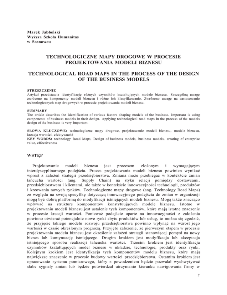 Marek Jabłoński Wyższa Szkoła Humanitas w Sosnowcu TECHNOLOGICZNE MAPY DROGOWE W PROCESIE PROJEKTOWANIA MODELI BIZNESU TECHNOLOGICAL ROAD MAPS IN THE PROCESS OF THE DESIGN OF THE BUSINESS MODELS STRESZCZENIE Artykuł przedstawia identyfikację różnych czynników kształtujących modele biznesu. Szczególną uwagę zwrócono na komponenty modeli biznesu i różne ich klasyfikowanie. Zwrócono uwagę na zastosowanie technologicznych map drogowych w procesie projektowania modeli biznesu. SUMMARY The article describes the identification of various factors shaping models of the business. Important is using components of business models in their design. Applying technological road maps in the process of the models design of the business is very important. SŁOWA KLUCZOWE: technologiczne mapy drogowe, projektowanie modeli biznesu, modele biznesu, kreacja wartości, efektywność KEY WORDS: technology Road Maps, Design of business models, business models, creating of enterprise value, effectiveness WSTĘP Projektowanie modeli biznesu jest procesem złożonym i wymagającym interdyscyplinarnego podejścia. Proces projektowania modeli biznesu powinien wynikać wprost z założeń strategii przedsiębiorstwa. Zmiana może przebiegać w kontekście zmian łańcucha wartości (ang. Supply Chain) na styku relacji pomiędzy dostawcami, przedsiębiorstwem i klientami, ale także w kontekście innowacyjności technologii, produktów i kreowania nowych rynków. Technologiczne mapy drogowe (ang. Technology Road Maps) ze względu na swoją specyfikę dotyczącą innowacyjnego podejścia do zmian w organizacji mogą być dobrą platformą do modyfikacji istniejących modeli biznesu. Mogą także znacząco wpływać na strukturę komponentów konstytuujących modele biznesu. Istotne w projektowaniu modeli biznesu jest ustalenie tych komponentów, które mają istotne znaczenie w procesie kreacji wartości. Ponieważ podejście oparte na innowacyjności z założenia powinno otwierać potencjalnie nowe rynki zbytu produktów lub usług, to można się zgodzić, że przyjęcie takiego modelu rozwoju przedsiębiorstwa powinno wpłynąć na wzrost jego wartości w czasie określonym prognozą. Przyjęto założenie, że pierwszym etapem w procesie projektowania modelu biznesu jest określenie założeń strategii stanowiącej pomysł na nowy biznes lub kontynuację istniejącego. Drugim krokiem jest modyfikacja lub akceptacja istniejącego sposobu realizacji łańcucha wartości. Trzecim krokiem jest identyfikacja czynników kształtujących model biznesu w układzie, technologie, produkty oraz rynki. Kolejnym krokiem jest identyfikacja tych komponentów modelu biznesu, które mają największe znaczenie w procesie budowy wartości przedsiębiorstwa. Ostatnim krokiem jest opracowanie systemu pomiarowego, który z powodzeniem będzie pozwalał wychwytywać słabe sygnały zmian lub będzie potwierdzał utrzymanie kierunku nawigowania firmy w 7 kierunku wzrostu wartości. Tak zinterpretowany dynamiczny proces powinien stanowić możliwość dynamicznego kształtowania modeli biznesu zorientowanych na wzrost wartości przedsiębiorstw. KOMPONENTY MODELI BIZNESU - RÓŻNE PODEJŚCIA Model biznesu stanowi konfigurację czynników materialnych i niematerialnych, których właściwa konfiguracja powinna służyć kreacji wartości przedsiębiorstwa. Jak pisze H. Chesbrough, firmy koncentrują nowe idee i technologie za pomocą swoich modeli biznesu. Zwraca on także uwagę na podejście do mapowania modeli biznesu, które mają charakter praktyczny i mogą służyć wprowadzaniu zmian, w tym szczególnie o charakterze innowacyjnym1. Nawiązując do jednej z amerykańskich prac doktorskich, przedstawia on model składający się z dziewięciu elementów konstytuujących innowacyjny model biznesu (rys. 1). Rys. 1. Dziewięcioelementowy model biznesu Osterwaldera Źródło: H. Chesbrough, Business Model Innovation: Oportunities and Bariers, Long Range Planning 43 (2010), s. 359 Zarządzanie poprzez zmianę konfiguracji modeli biznesu pozwala odpowiedzieć na pytanie: Czy inne niż obecnie stosowana konfiguracja modelu biznesu zwiększy wartość spółki? Zatem należy myśleć stale o sprawności i efektywności modelu biznesu. Ten sam autor jako jeden z pierwszych autorów literatury przedmiotu, który rozpoczął dyskusję na temat modeli biznesu, wraz z R.S. Rosenbloomem zdefiniował sześć funkcji modelu biznesu, mianowicie: 1. Wyartykułowanie propozycji wartości dla klientów. 2. Identyfikacja segmentu rynku. 3. Zdefiniowanie struktury łańcucha wytwórczego produktów lub usług. 4. Ocena struktury kosztów i potencjalnych zysków. 5. Opisanie pozycji firmy w sieci wartości obejmującej dostawców i klientów włącznie z identyfikacją potencjalnych konkurentów i dostawców usług komplementarnych. 6. Formułowanie strategii konkurencyjnych, dzięki którym innowacyjne firmy osiągną zyski oraz przewagę nad rywalami2 1 H. Chesbrough, Business Model Innovation: Opportunities and Barriers, Long Range Planning 43 (2010), s. 359. 2 H. Chesbrought, R.S. Rosenbloom, The role of the business of the capturing value from innovation: evidence from Xerox Corporation's technology spin-off companies, Industrial and Corporate Change, Volume 11, Number 3, s. 533-534. 8 Autor w tym aspekcie wskazuje na te elementy, które z punktu widzenia firmy innowacyjnej mają najbardziej istotne znaczenie. Z kolei S.M. Shafer, H.I. Smith i I.C. Linder zdefiniowali cztery kluczowe komponenty modeli biznesu: 1. Strategiczne wybory związane z klientami (cele i zakres rynku), propozycje wartości, zdolności, kompetencje, dochody i polityka cenowa, konkurenci, propozycja oferty rynkowej, strategia, brand, odróżnianie się, misja. 2. Sieć wartości związana z dostawcami, informacją o klientach, relacjami z klientami, przepływ informacji, przepływ produktów/usług. 3. Kreacja wartości związana z zasobami i aktywami, procesa