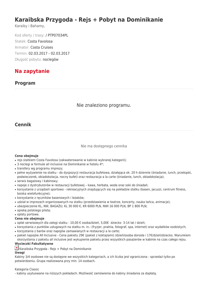 Karaibska Przygoda - Rejs + Pobyt na Dominikanie Karaiby i Bahamy, Kod oferty / trasy: / PTP07034PL Statek: Costa Favolosa Armator: Costa Cruises Termin: 02.03.2017 - 02.03.2017 Długość pobytu: noclegów Na zapytanie Program Nie znaleziono programu. Cennik Nie ma dostępnego cennika Cena obejmuje rejs statkiem Costa Favolosa (zakwaterowanie w kabinie wybranej kategorii); 3 noclegi w formule all inclusive na Dominikanie w hotelu 4*; transfery wg programu imprezy; pełne wyżywienie na statku - do dyspozycji restauracja bufetowa, działająca ok. 20 h dziennie (śniadanie, lunch, przekąski, podwieczorek, obiadokolacja, nocny bufet) oraz restauracja a la carte (śniadanie, lunch, obiadokolacja); serwis bagażowy i kabinowy; napoje z dystrybutorów w restauracji bufetowej – kawa, herbata, woda oraz soki do śniadań; korzystanie z urządzeń sportowo - rekreacyjnych znajdujących się na pokładzie statku (basen, jacuzzi, centrum fitness, boiska wielofunkcyjne); korzystanie z ręczników basenowych i leżaków; udział w imprezach organizowanych na statku (przedstawienia w teatrze, koncerty, nauka tańca, animacje); ubezpieczenie KL, NW, BAGAŻU; KL 30 000 €, KR 6000 PLN, NWI 16 000 PLN, BP 1 800 PLN; opiekę polskiego pilota; opłaty portowe. Cena nie obejmuje opłat serwisowych dla załogi statku - 10,00 € osoba/dzień, 5,00€ dziecko 3-14 lat / dzień; korzystania z punktów usługowych na statku m. in.: (fryzjer, pralnia, fotograf, spa, internet) oraz wydatków osobistych; korzystania z barów oraz napojów zamawianych w restauracji a la carte; pakiet napojów All Inclusive - Cena pakietu 29€ (pakiet z koktajlami) /dzień/osoba dorosła i 17€/dzień/dziecko. Warunkiem skorzystania z pakietu all inclusive jest wykupienie pakietu przez wszystkich pasażerów w kabinie na czas całego rejsu. Wycieczki Fakultatywne ● ● ● ● ● ● ● ● ● ● ● ● ● ● ● ● Karaibska Przygoda - Rejs + Pobyt na Dominikanie Uwagi Kabiny 3/4 osobowe nie są dostępne we wszystkich kategoriach, a ich liczba jest ograniczona - sprzedaż tylko po potwierdzeniu. Grupa realizowana przy min. 14 osobach. Kategoria Classic - kabiny usytuowane na niższych pokładach. Możliwość zamówienia do kabiny śniadania za dopłatą. Kategoria Premium - kabiny usytuowane na wyższych pokładach, - bezpłatne śniadanie kontynentalne do kabiny, - możliwość wyboru tury kolacji oraz restauracji. Transport Przejazd autokarem: W przypadku oferty przejazdu autokarem wyjazd następuje z Katowic dzień wcześniej, natomiast przyjazd do Katowic dzień później. Wyjątek stanowią rejsy z portów: Hamburg, Warnemunde i Kilonia, przy których wyjazd i powrót do kraju są dokładnie dniem rozpoczęcia i zakończenia rejsu. Dla chętnych możliwość skorzystania z antenek do miejsca wyjazdu autokaru: z Krakowa 25€/osoba/dwie strony z Wrocławia 30€/osoba/dwie strony Przelot samolotem: Wylot w dniu rozpoczęcia rejsu, powrót wieczorny w dniu zakończenia rejsu, wyjątek stanowią rejsy z noclegiem przed lub po rejsie. W cenie zawarte transfery lotnisko/port/lotnisko. Przy wylotach z Warszawy dla chętnych możliwość skorzystania z transferu na lotnisko w Warszawie (opcjonalnie) - cena 50€/os. w dwie strony * * miejsca wsiadania: Kraków, Katowice, Żory, Rybnik, Częstochowa. Możliwy transfer z Wrocławia przy minimum 6 osobach. Opublikowane informacje nie stanowią oferty handlowej w rozumieniu kodeksu cywilnego