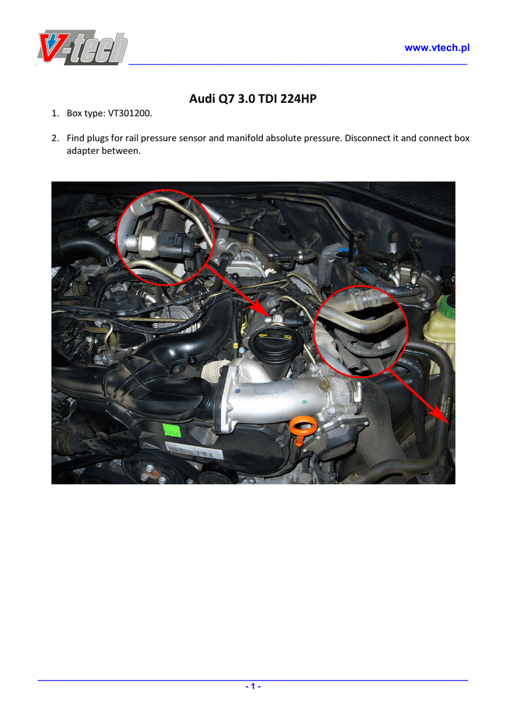 www.vtech.pl ____________________________________________________________________________ Audi Q7 3.0 TDI 224HP 1. Box type: VT301200. 2. Find plugs for rail pressure sensor and manifold absolute pressure. Disconnect it and connect box adapter between. ___________________________________________________________________________________________ -1-