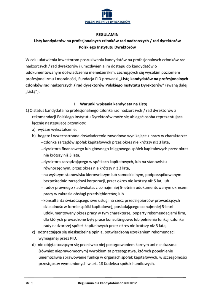 REGULAMIN Listy kandydatów na profesjonalnych członków rad nadzorczych / rad dyrektorów Polskiego Instytutu Dyrektorów W celu ułatwienia inwestorom poszukiwania kandydatów na profesjonalnych członków rad nadzorczych / rad dyrektorów i umożliwienia im dostępu do kandydatów o udokumentowanym doświadczeniu menedżerskim, cechujących się wysokim poziomem profesjonalizmu i moralności, Fundacja PID prowadzi „Listę kandydatów na profesjonalnych członków rad nadzorczych / rad dyrektorów Polskiego Instytutu Dyrektorów” (zwaną dalej „Listą”). I. Warunki wpisania kandydata na Listę 1) O status kandydata na profesjonalnego członka rad nadzorczych / rad dyrektorów z rekomendacji Polskiego Instytutu Dyrektorów może się ubiegać osoba reprezentująca łącznie następujące przymioty: a) wyższe wykształcenie; b) bogate i wszechstronne doświadczenie zawodowe wynikające z pracy w charakterze: członka zarządów spółek kapitałowych przez okres nie krótszy niż 3 lata, dyrektora finansowego lub głównego księgowego spółek kapitałowych przez okres nie krótszy niż 3 lata, dyrektora zarządzającego w spółkach kapitałowych, lub na stanowisku równorzędnym, przez okres nie krótszy niż 3 lata, na wyższym stanowisku kierowniczym lub samodzielnym, podporządkowanym bezpośrednio zarządowi korporacji, przez okres nie krótszy niż 5 lat, lub radcy prawnego / adwokata, z co najmniej 5-letnim udokumentowanym okresem pracy w zakresie obsługi przedsiębiorców; lub konsultanta świadczącego swe usługi na rzecz przedsiębiorców prowadzących działalność w formie spółki kapitałowej, posiadającego co najmniej 5-letni udokumentowany okres pracy w tym charakterze, poparty rekomendacjami firm, dla których prowadzone były prace konsultingowe; lub pełnienia funkcji członka rady nadzorczej spółek kapitałowych przez okres nie krótszy niż 3 lata, c) odznaczająca się nieskazitelną opinią, potwierdzoną uzyskaniem rekomendacji wymaganej przez PID, d) nie objęta toczącym się przeciwko niej postępowaniem karnym ani nie skazana (również nieprawomocnym) wyrokiem za przestępstwa, których popełnienie uniemożliwia sprawowanie funkcji w organach spółek kapitałowych, w szczególności przestępstw wymienionych w art. 18 Kodeksu spółek handlowych. str. 1 Regulamin dla kandydatów do RN 2012 2) Podstawą ubiegania się o status kandydata na profesjonalnego członka rad nadzorczych PID jest: a) złożenie wypełnionej i podpisanej „Ankiety kandydata na profesjonalnego członka rad nadzorczych / rad dyrektorów Polskiego Instytutu Dyrektorów” w wersji papierowej, z podpisami osób rekomendujących kandydata, b) dobrowolne ujawnienie ankiety prezentującej kwalifikacje zawodowe i osiągnięcia kandydata ubiegającego się o wpisanie na Listę, poprzez umieszczenie jej na stronie internetowej PID, c) wyrażenie zgody na publikację danych personalnych kandydata na stronie internetowej PID po wpisaniu na Listę, d) uzyskanie rekomendacji od dwóch członków organów statutowych Polskiego Instytutu Dyrektorów (Zarządu, Rady Programowej, Rady Fundatorów, Zgromadzenia Uczestników Forum Corporate Governance PID), potwierdzonej własnoręcznymi ich podpisami w przeznaczonej do tego rubryce „Ankiety kandydata na profesjonalnego członka rad nadzorczych / rad dyrektorów Polskiego Instytutu Dyrektorów” w wersji papierowej. II. Zasady prowadzenia listy 3) Polski Instytut Dyrektorów prowadzi Listę i podaje ją do powszechnej wiadomości poprzez umieszczenie jej na stronie internetowej PID (www.pid.org.pl). 4) Status kandydata na profesjonalnego członka rad nadzorczych / rad dyrektorów Polskiego Instytutu Dyrektorów nadaje Rada Programowa na okres 5 lat wyłącznie tym kandydatom, którzy spełnili warunki określone w rozdziale I, pkt 1 i 2 niniejszego Regulaminu. Nadanie statusu oznacza wpisanie na Listę. Po upływie tego okresu kandydat może ubiegać się o powtórne wpisanie na Listę. 5) Wpisu nowych kandydatów na Listę, na podstawie decyzji Rady Programowej, dokonuje Zarząd PID. 6) Kandydatowi, któremu Rada Programowa odmówiła wydania decyzji w przedmiocie nadania statusu kandydata na profesjonalnego członka rad nadzorczych / rad dyrektorów Polskiego Instytutu Dyrektorów i tym samym wpisania przez Zarząd PID na Listę, przysługuje prawo złożenia odwołania do Rady Fundatorów PID. 7) Kandydat, któremu nadano status kandydata na profesjonalnego członka rad nadzorczych / rad dyrektorów Polskiego Instytutu Dyrektorów, jest zobowiązany do aktualizowania danych podanych w Ankiecie złożonej w PID co najmniej raz w roku kalendarzowym, a w przypadku istotnych zmian, w szczególności określonych w punkcie 1 ustęp 4 Rozdziału I niniejszego Regulaminu – niezwłocznie po ich zaistnieniu, pod rygorem utraty statusu kandydata na profesjonalnego członka rad nadzorczych Polskiego Instytutu Dyrektorów. 8) Kandydat jest zobowiązany do podania w ankiecie informacji zgodnych z prawdą. W przypadku podania nieprawdziwych informacji PID będzie uprawniony do odebrania str. 2 Regulamin dla kandydatów do RN 2012 nadanego statusu kandydata na profesjonalnego członka rad nadzorczych / rad dyrektorów Polskiego Instytutu Dyrektorów i wykreślenia z Listy. 9) Kandydat, któremu nadano status profesjonalnego kandydata na członka rad nadzorczych / rad dyrektorów Polskiego Instytutu Dyrektorów, jest zobowiązany do wyrażenia zgody na przetwarzanie, weryfikację i udostępnianie jego danych osobowych przez PID w celu stworzenia i aktualizacji danych o profesjonalnych kandydatach na członków rad nadzorczych / rad dyrektorów PID. PID zostaje tym samym upoważniony do udostępniania tych danych podmiotom poszukującym kandydatów na niezależnych i profesjonalnych członków rad nadzorczych / rad dyrektorów. Nie wyłącza to prawa członka PID do weryfikacji, przeglądania, poprawiania oraz żądania usunięcia tych danych 