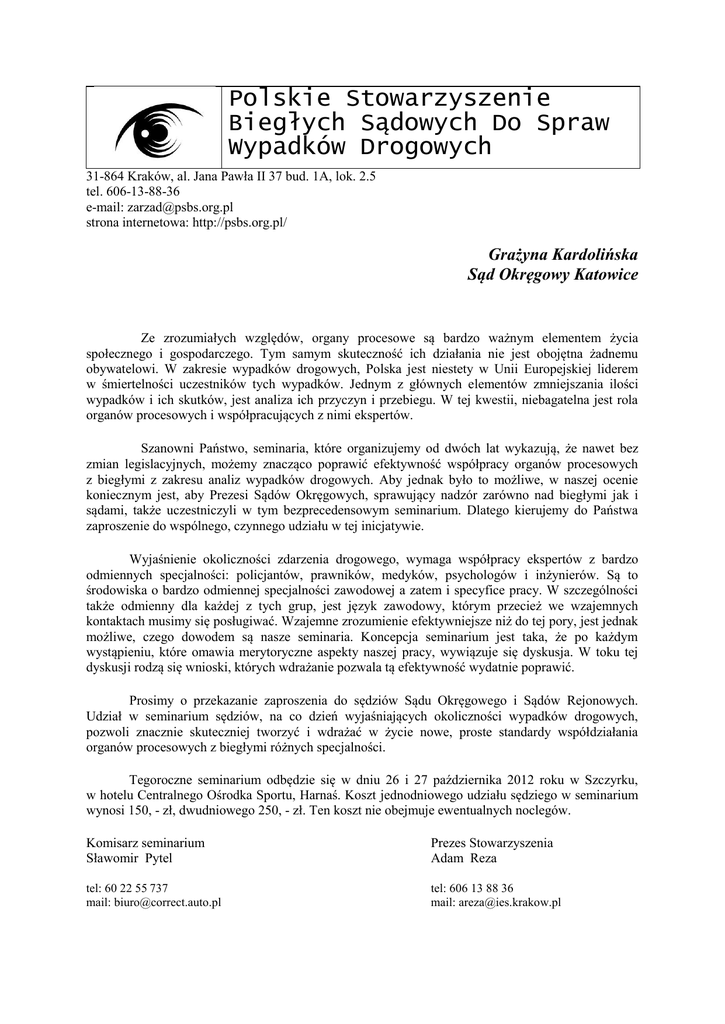 Polskie Stowarzyszenie Biegłych Sądowych Do Spraw Wypadków Drogowych 31-864 Kraków, al. Jana Pawła II 37 bud. 1A, lok. 2.5 tel. 606-13-88-36 e-mail: [email protected] strona internetowa: http://psbs.org.pl/ Grażyna Kardolińska Sąd Okręgowy Katowice Ze zrozumiałych względów, organy procesowe są bardzo ważnym elementem życia społecznego i gospodarczego. Tym samym skuteczność ich działania nie jest obojętna żadnemu obywatelowi. W zakresie wypadków drogowych, Polska jest niestety w Unii Europejskiej liderem w śmiertelności uczestników tych wypadków. Jednym z głównych elementów zmniejszania ilości wypadków i ich skutków, jest analiza ich przyczyn i przebiegu. W tej kwestii, niebagatelna jest rola organów procesowych i współpracujących z nimi ekspertów. Szanowni Państwo, seminaria, które organizujemy od dwóch lat wykazują, że nawet bez zmian legislacyjnych, możemy znacząco poprawić efektywność współpracy organów procesowych z biegłymi z zakresu analiz wypadków drogowych. Aby jednak było to możliwe, w naszej ocenie koniecznym jest, aby Prezesi Sądów Okręgowych, sprawujący nadzór zarówno nad biegłymi jak i sądami, także uczestniczyli w tym bezprecedensowym seminarium. Dlatego kierujemy do Państwa zaproszenie do wspólnego, czynnego udziału w tej inicjatywie. Wyjaśnienie okoliczności zdarzenia drogowego, wymaga współpracy ekspertów z bardzo odmiennych specjalności: policjantów, prawników, medyków, psychologów i inżynierów. Są to środowiska o bardzo odmiennej specjalności zawodowej a zatem i specyfice pracy. W szczególności także odmienny dla każdej z tych grup, jest język zawodowy, którym przecież we wzajemnych kontaktach musimy się posługiwać. Wzajemne zrozumienie efektywniejsze niż do tej pory, jest jednak możliwe, czego dowodem są nasze seminaria. Koncepcja seminarium jest taka, że po każdym wystąpieniu, które omawia merytoryczne aspekty naszej pracy, wywiązuje się dyskusja. W toku tej dyskusji rodzą się wnioski, których wdrażanie pozwala tą efektywność wydatnie poprawić. Prosimy o przekazanie zaproszenia do sędziów Sądu Okręgowego i Sądów Rejonowych. Udział w seminarium sędziów, na co dzień wyjaśniających okoliczności wypadków drogowych, pozwoli znacznie skuteczniej tworzyć i wdrażać w życie nowe, proste standardy współdziałania organów procesowych z biegłymi różnych specjalności. Tegoroczne seminarium odbędzie się w dniu 26 i 27 października 2012 roku w Szczyrku, w hotelu Centralnego Ośrodka Sportu, Harnaś. Koszt jednodniowego udziału sędziego w seminarium wynosi 150, - zł, dwudniowego 250, - zł. Ten koszt nie obejmuje ewentualnych noclegów. Komisarz seminarium Sławomir Pytel Prezes Stowarzyszenia Adam Reza tel: 60 22 55 737 mail: [email protected] tel: 606 13 88 36 mail: [email protected]