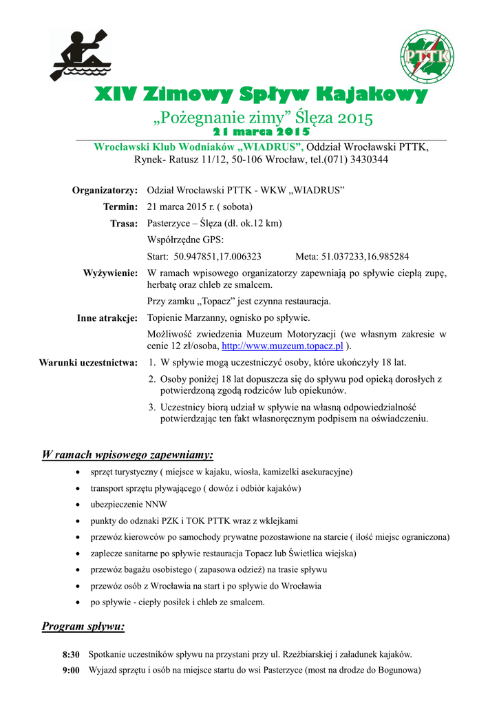 XIV Zimowy Spływ Kajakowy „Pożegnanie zimy” Ślęza 2015 21 marca 2015 Wrocławski Klub Wodniaków „WIADRUS”, Oddział Wrocławski PTTK, Rynek- Ratusz 11/12, 50-106 Wrocław, tel.(071) 3430344 Organizatorzy: Odział Wrocławski PTTK - WKW „WIADRUS” Termin: 21 marca 2015 r. ( sobota) Trasa: Pasterzyce – Ślęza (dł. ok.12 km) Współrzędne GPS: Start: 50.947851,17.006323 Meta: 51.037233,16.985284 Wyżywienie: W ramach wpisowego organizatorzy zapewniają po spływie ciepłą zupę, herbatę oraz chleb ze smalcem. Przy zamku „Topacz” jest czynna restauracja. Inne atrakcje: Topienie Marzanny, ognisko po spływie. Możliwość zwiedzenia Muzeum Motoryzacji (we własnym zakresie w cenie 12 zł/osoba, http://www.muzeum.topacz.pl ). Warunki uczestnictwa: 1. W spływie mogą uczestniczyć osoby, które ukończyły 18 lat. 2. Osoby poniżej 18 lat dopuszcza się do spływu pod opieką dorosłych z potwierdzoną zgodą rodziców lub opiekunów. 3. Uczestnicy biorą udział w spływie na własną odpowiedzialność potwierdzając ten fakt własnoręcznym podpisem na oświadczeniu. W ramach wpisowego zapewniamy: sprzęt turystyczny ( miejsce w kajaku, wiosła, kamizelki asekuracyjne) transport sprzętu pływającego ( dowóz i odbiór kajaków) ubezpieczenie NNW punkty do odznaki PZK i TOK PTTK wraz z wklejkami przewóz kierowców po samochody prywatne pozostawione na starcie ( ilość miejsc ograniczona) zaplecze sanitarne po spływie restauracja Topacz lub Świetlica wiejska) przewóz bagażu osobistego ( zapasowa odzież) na trasie spływu przewóz osób z Wrocławia na start i po spływie do Wrocławia po spływie - ciepły posiłek i chleb ze smalcem. Program spływu: 8:30 Spotkanie uczestników spływu na przystani przy ul. Rzeźbiarskiej i załadunek kajaków. 9:00 Wyjazd sprzętu i osób na miejsce startu do wsi Pasterzyce (most na drodze do Bogunowa) 10:00 Przygotowanie kajaków do wodowania na miejscu startu 10:15 Wyjazd samochodów prywatnych na metę w Ślęzy. 11:00 Uroczyste otwarcie spływu i start do etapu na trasie Pasterzyce – Ślęza. 14:00 Planowane przypłyniecie na metę (wieś Ślęza, most przy wodowskazie), wydawanie ciepłego posiłku (zupa, herbata, chleb ze smalcem), ognisko, topienie Marzanny, spotkanie wodniackie. 15:30 Zwiedzanie muzeum (bilety we własnym zakresie). 16:30 Uroczyste zakończenie spływu. 17:00 Wyjazd autokaru do Wrocławia Wpisowe (od osoby): 60,- na sprzęcie organizatora z dowozem sprzętu i osób 45,- członkowie klubu Wiadrus oraz osoby płynące na sprzęcie własnym z dowozem sprzętu i osób Osoby płynące na sprzęcie własnym, z własnym dowozem osób i sprzętu. 25,- Osoby towarzyszące korzystające wyłącznie z wyżywienia. Termin zgłoszeń i wpłat: do 17.03.2015 r. pod adresem: Oddział Wrocławski PTTK – Wrocławski Klub Wodniaków „Wiadrus” Rynek – Ratusz 11/1, 50106 Wrocław ( spotkania we wtorek 24.02 i 10.03 w klubie turysty w godz. 18-19), lub na przystani kajakowej przy ul. Rzeźbiarskiej 6 ( we wtorek 17.03 w godz 16.30-18.30), lub mailem na adres: [email protected] wpłaty wpisowego na konto: 19 1090 2398 0000 0006 0827 5667 z dopiskiem „Pożegnanie zimy” Podczas zapisów proszę korzystać z tabeli (lub podawać dane zapisywanych uczestników) wg poniższego wzoru: Lp. Imię i nazwisko Wpisowe ***k Adres zamieszkania Pesel. 1 2 3 Uwaga: W rubryce wpisowe należy wpisać kwotę wpłaconego wpisowego, oraz literę „K” w przypadku kierowcy prywatnego samochodu, którego będzie trzeba przewieźć na start po odprowadzeniu samochodów prywatnych na metę spływu. Kierownictwo spływu: Komandor: Bożena Siczek (tel. 504 028 040) Piloci: początkowy: Zygmunt Mizgalski, zamykający: Andrzej Pawlak Ratownik: Adam Korablewski Informacje dodatkowe: 1. Na trasie jaz w okolicach Żórawiny, Rzeplina i Ślęzy– obowiązkowa przenoska i ew. postój. 2. Osoby dojeżdżające własnymi samochodami - po rozpakowaniu sprzętu przed spływem ich samochody zostaną odwiezione na metę a następnie kierowcy zostaną przewiezieni na start spływu (liczba miejsc ograniczona – proszę w zgłoszeniach podawać kierowcę). 3. Zakończenie spływu planowane jest w nowych wiatach ustawionych na lewym brzegu rzeki a w przypadku bardzo złych warunków atmosferycznych na terenie świetlicy wiejskiej w Ślęzie. 4. W przypadku niekorzystnych warunków atmosferycznych program spływu może ulec zmianom. 5. Uczestnicy mają obowiązek zabrać rzeczy na przebranie do kajaka oraz drugi zestaw odzieży do przebrania, który przewożony będzie busami i autokarem. 6. Liczba uczestników płynąca w kajakach organizatora jest ograniczona – decyduje kolejność zgłoszeń! Serdecznie zapraszamy !