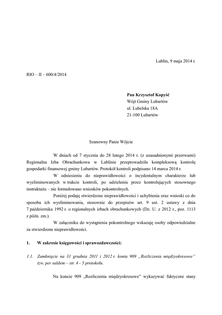 Lublin, 9 maja 2014 r. RIO – II – 600/4/2014 Pan Krzysztof Kopyść Wójt Gminy Lubartów ul. Lubelska 18A 21-100 Lubartów Szanowny Panie Wójcie W dniach od 7 stycznia do 28 lutego 2014 r. (z uzasadnionymi przerwami) Regionalna Izba Obrachunkowa w Lublinie przeprowadziła kompleksową kontrolę gospodarki finansowej gminy Lubartów. Protokół kontroli podpisano 14 marca 2014 r. W odniesieniu do nieprawidłowości o incydentalnym charakterze lub wyeliminowanych w trakcie kontroli, po udzieleniu przez kontrolujących stosownego instruktażu – nie formułowano wniosków pokontrolnych. Poniżej podaję stwierdzone nieprawidłowości i uchybienia oraz wnioski co do sposobu ich wyeliminowania, stosownie do przepisów art. 9 ust. 2 ustawy z dnia 7 października 1992 r. o regionalnych izbach obrachunkowych (Dz. U. z 2012 r., poz. 1113 z późn. zm.). W załączniku do wystąpienia pokontrolnego wskazuję osoby odpowiedzialne za stwierdzone nieprawidłowości. 1. W zakresie księgowości i sprawozdawczości: 1.1. Zamknięcie na 31 grudnia 2011 i 2012 r. konta 909 „Rozliczenia międzyokresowe” tzw. per saldem – str. 4 - 5 protokołu. Na koncie 909 „Rozliczenia międzyokresowe” wykazywać faktyczne stany 2 rozliczeń międzyokresowych, zgodnie z zasadami funkcjonowania tego konta, określonymi w załączniku Nr 2 do rozporządzenia Ministra Finansów z dnia 5 lipca 2010 r. w sprawie szczególnych zasad rachunkowości oraz planów kont dla budżetu państwa, budżetów jednostek samorządu terytorialnego, jednostek budżetowych, samorządowych zakładów budżetowych, państwowych funduszy celowych oraz państwowych jednostek budżetowych mających siedzibę poza granicami Rzeczypospolitej Polskiej (Dz. U. z 2013 r. poz. 289), powoływanego w dalszej części tego wystąpienia jako „rozporządzenie Ministra Finansów z 5 lipca 2010 r.”. 1.2. Nieewidencjonowanie dotacji udzielonych instytucji kultury i zakładowi budżetowemu na cele inwestycyjne na koncie 224 „Rozliczenie dotacji budżetowych oraz płatności z budżetu środków europejskich” oraz uznawanie dotacji (odpowiednio podmiotowych i przedmiotowych) udzielonych tym jednostkom za rozliczone w dacie ich przekazania – str. 5 - 6 protokołu. Zapisów o zdarzeniach dokonywać na kontach księgi głównej w ujęciu systematycznym, w związku z przepisami art. 15 ust. 1 ustawy z dnia 29 września 1994 r. o rachunkowości (Dz. U. z 2013 r., poz.330 z późn. zm.), w szczególności operacje związane z przekazaniem dotacji (podmiotowych, przedmiotowych i celowych), a następnie uznaniem ich za wykorzystane i rozliczone ujmować w korespondencji z kontem 224 „Rozliczenie dotacji budżetowych oraz płatności z budżetu środków europejskich”, stosownie do zasad funkcjonowania tych kont, określonych w załączniku Nr 3 do rozporządzenia Ministra Finansów z dnia 5 lipca 2010 r., mając na uwadze, że uznanie dotacji za rozliczoną nie może nastąpić w tym samym dniu, w którym nastąpiło jej przekazanie, w związku z przepisami art. 126 ustawy z dnia 27 sierpnia 2009 r. o finansach publicznych (Dz.U. z 2013 r., poz. 885 z późn.zm.). 1.3. Przypadki dokonania zapisów na koncie 133/O „Rachunek budżetu” niezgodnie z księgowością banku – str. 6 - 7 protokołu. Zapisów na koncie 133 „Rachunek budżetu” dokonywać wyłącznie na podstawie dokumentów bankowych, zachowując pełną zgodność zapisów między jednostką a bankiem, zgodnie z zasadami funkcjonowania tego konta, określonymi w załączniku Nr 2 do rozporządzenia Ministra Finansów z dnia 5 lipca 2010 r. 1.4. Prowadzenie ewidencji analitycznej do kont 222 „Rozliczenie dochodów budżetowych” i 223 „Rozliczenie wydatków budżetowych” w sposób uniemożliwiający ustalenie stanu rozliczeń z poszczególnymi jednostkami oświatowymi i z jednostką prowadzącą ich 3 obsługę księgową – str. 7 protokołu. Do kont 222 „Rozliczenie dochodów budżetowych” i 223 „Rozliczenie wydatków budżetowych” prowadzić ewidencję szczegółową w sposób umożliwiający ustalenie stanu rozliczeń z poszczególnymi jednostkami budżetowymi z tytułu zrealizowanych przez nie dochodów budżetowych i przekazanych na ich rachunki środków pieniężnych przeznaczonych na pokrycie realizowanych przez nie wydatków budżetowych, zgodnie z zasadami funkcjonowania tych kont określonymi w załączniku Nr 2 do rozporządzenia Ministra Finansów z dnia 5 lipca 2010 r. 1.5. Zwiększenie wartości początkowej środków trwałych w związku z dokonaniem ich wyceny przez rzeczoznawcę majątkowego – str. 8 protokołu. Na koncie 011 „Środki trwałe” ujmować środki trwałe w prawidłowo ustalonej wartości początkowej, zgodnie z przepisami art. 28 ust. 1 pkt 1 i ust. 2 ustawy o rachunkowości i zasadami funkcjonowania tego konta określonymi w załączniku nr 3 do rozporządzenia Ministra Finansów z dnia 5 lipca 2010 r., mając na uwadze, że przepisy § 6 ust. 5 tego rozporządzenia nie dotyczą wyceny środków trwałych, dokonanej przez rzeczoznawcę majątkowego w celu ich sprzedaży. 1.6. Niewykazanie w jednostkowym sprawozdaniu Rb-N za 2012 r. pozostałych należności w kwocie 2.005,59 zł – str. 14 - 15 protokołu. Jednostkowe sprawozdanie Rb-N „Kwartalne sprawozdanie o stanie należności oraz wybranych aktywów finansowych” sporządzać na podstawie ksiąg rachunkowych oraz innych dokumentów dotyczących jednostki, zgodnie z przepisami § 4 ust. 1 pkt 1 rozporządzenia Ministra Finansów z dnia 4 marca 2010 r. w sprawie sprawozdań jednostek sektora finansów publicznych w zakresie operacji finansowych (Dz. U. Nr 43, poz. 247 z późn. zm.), w sposób określony w przepisach „Instrukcji sporządzania sprawozdań”, stanowiącej załącznik nr 9 do tego rozporządzenia. 2. W zakresie dochodów: 2.1. Zawyżenie wykazanych w sprawozdaniu Rb - PDP za 2012 r. skutków: - obniżenia górnych stawek w podatku od nieruchomo