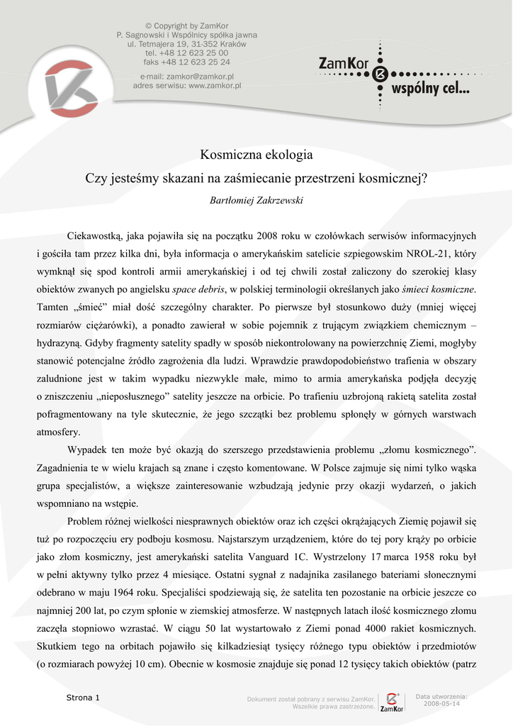 Kosmiczna ekologia Czy jesteśmy skazani na zaśmiecanie przestrzeni kosmicznej? Bartłomiej Zakrzewski Ciekawostką, jaka pojawiła się na początku 2008 roku w czołówkach serwisów informacyjnych i gościła tam przez kilka dni, była informacja o amerykańskim satelicie szpiegowskim NROL-21, który wymknął się spod kontroli armii amerykańskiej i od tej chwili został zaliczony do szerokiej klasy obiektów zwanych po angielsku space debris, w polskiej terminologii określanych jako śmieci kosmiczne. Tamten „śmieć” miał dość szczególny charakter. Po pierwsze był stosunkowo duŜy (mniej więcej rozmiarów cięŜarówki), a ponadto zawierał w sobie pojemnik z trującym związkiem chemicznym – hydrazyną. Gdyby fragmenty satelity spadły w sposób niekontrolowany na powierzchnię Ziemi, mogłyby stanowić potencjalne źródło zagroŜenia dla ludzi. Wprawdzie prawdopodobieństwo trafienia w obszary zaludnione jest w takim wypadku niezwykle małe, mimo to armia amerykańska podjęła decyzję o zniszczeniu „nieposłusznego” satelity jeszcze na orbicie. Po trafieniu uzbrojoną rakietą satelita został pofragmentowany na tyle skutecznie, Ŝe jego szczątki bez problemu spłonęły w górnych warstwach atmosfery. Wypadek ten moŜe być okazją do szerszego przedstawienia problemu „złomu kosmicznego”. Zagadnienia te w wielu krajach są znane i często komentowane. W Polsce zajmuje się nimi tylko wąska grupa specjalistów, a większe zainteresowanie wzbudzają jedynie przy okazji wydarzeń, o jakich wspomniano na wstępie. Problem róŜnej wielkości niesprawnych obiektów oraz ich części okrąŜających Ziemię pojawił się tuŜ po rozpoczęciu ery podboju kosmosu. Najstarszym urządzeniem, które do tej pory krąŜy po orbicie jako złom kosmiczny, jest amerykański satelita Vanguard 1C. Wystrzelony 17 marca 1958 roku był w pełni aktywny tylko przez 4 miesiące. Ostatni sygnał z nadajnika zasilanego bateriami słonecznymi odebrano w maju 1964 roku. Specjaliści spodziewają się, Ŝe satelita ten pozostanie na orbicie jeszcze co najmniej 200 lat, po czym spłonie w ziemskiej atmosferze. W następnych latach ilość kosmicznego złomu zaczęła stopniowo wzrastać. W ciągu 50 lat wystartowało z Ziemi ponad 4000 rakiet kosmicznych. Skutkiem tego na orbitach pojawiło się kilkadziesiąt tysięcy róŜnego typu obiektów i przedmiotów (o rozmiarach powyŜej 10 cm). Obecnie w kosmosie znajduje się ponad 12 tysięcy takich obiektów (patrz Strona 1 Data utworzenia: 2008-05-14 rys. 1.). Spośród nich tylko 7% to aktywne satelity, pozostałe orbitujące przedmioty są klasyfikowane jako róŜnego typu odpadki. Całkowita masa wszystkich elementów konstrukcyjnych i ich fragmentów (o rozmiarach powyŜej 10 cm i o masie powyŜej 1 kg) obejmuje 99,95% masy wszystkich śmieci orbitalnych. Łączną liczbę zanieczyszczeń o rozmiarach powyŜej 0,1 mm szacuje się na około 10 mln. Rys. 1. Rozkład przestrzenny satelitów, a co za tym idzie – takŜe kosmicznego złomu, nie jest jednorodny. Robiąc szczegółowe pomiary liczby obiektów w zaleŜności od odległości od Ziemi, otrzymano dwa wyraźne maksima. Pierwszy wyraźny wzrost gęstości przestrzennej pojawia się na wysokości kilkuset kilometrów i osiąga maksimum na około 1000 km, a związany jest z umieszczonymi w tamtym rejonie satelitami krótkookresowymi, w tym stacjami kosmicznymi przystosowanymi do przebywania w nich ludzi. Drugie maksimum koncentracji znajduje się w odległości około 35876 km. Strona 2 Data utworzenia: 2008-05-14 Rozmieszczenie obiektów na tej wysokości jest znacznie zróŜnicowane. Większość z nich znajduje się wokół wąskiego pierścienia nad równikiem ziemskim. Skupisko to tworzą satelity umieszczone na orbicie geostacjonarnej. W kaŜdej z wymienionych grup, oprócz czynnych satelitów, gromadzą się w większym natęŜeniu urządzenia niesprawne oraz ich pozostałości. Zjawisko to prezentuje rozkład punktów na rys. 2. Źródło: NASA Rys. 2. Ilościową zaleŜność gęstości kosmicznych odpadów o rozmiarach powyŜej 1 mm (w szt./km3) od wysokości nad powierzchnią Ziemi prezentuje rys. 3. Strona 3 Data utworzenia: 2008-05-14 Śmieci kosmiczne w przestrzeni wokółziemskiej 10-3 3 Gęstość [1/km ] 10-4 10-5 10-6 10-7 10-8 300 1000 10000 GEO Wysokość [km] Opracowano na podstawie: Federico Morello, „AN ASSESSMENT OF THE SPACE DEBRIS THREAT IN THE CONTEXT OF FUTURE SPACE TOURISM ACTIVITIES”. Rys. 3. Szczególna sytuacja ma miejsce w pierwszej z omawianych grup. Bezpośrednim producentem odpadów na tej wysokości są takŜe ludzie, którzy przebywając na kolejnych stacjach orbitalnych, pozbywają się swoich śmieci, usuwając je wprost w przestrzeń kosmiczną. Obecność człowieka na stacjach jest źródłem tylko niewielkiej części kosmicznych śmieci. NajwaŜniejsze źródła, „zasilające” kosmiczny śmietnik, to elementy członów rakiet kosmicznych uŜywane w końcowych fazach lotu (najniŜsze człony rakiet spadają w sposób kontrolowany na powierzchnię Ziemi) oraz róŜnej wielkości elementy powstałe w wyniku eksplozji satelitów (a częściej róŜnych elementów ich wyposaŜenia) lub zderzeń róŜnej wielkości obiektów orbitalnych. Jeden taki wybuch potrafi być źródłem nawet setek tysięcy elementów. Przykładem jednego z największych tego typu zajść była eksplozja amerykańskiej rakiety Pegaz w 1996 roku, wskutek której powstało ponad 300 tys. fragmentów o wymiarach ponad 4 mm. Jedna z większych kolizji miała natomiast miejsce w lipcu Strona 4 Data utworzenia: 2008-05-14 1996 roku. Wtedy doszło do zderzenia fragmentu rakiety Ariane oraz francuskiego satelity CERISE. Spośród powstałych w ten sposób fragmentów około 500 największych zostało skatalogowanych. Osobnym problemem jest testowanie broni rakietowej, podczas którego zuŜyte satelity słuŜą jako „tarcze”. Na przykład w wyniku trafieni