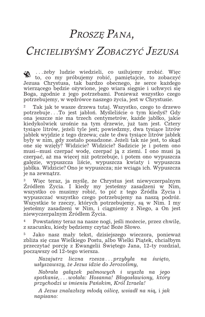 PROSZĘ PA NA, C HCIELIBYŚM Y ZOBACZYĆ JEZUSA …żeby ludzie wiedzieli, co usiłujemy zrobić. Więc to, co my próbujemy robić, pamiętajcie, to zobaczyć Jezusa Chrystusa, tak bardzo obecnego, że serce każdego wierzącego będzie ożywione, jego wiara sięgnie i uchwyci się Boga, zgodnie z jego potrzebami. Ponieważ wszystko czego potrzebujemy, w wędrówce naszego życia, jest w Chrystusie. 2 Tak jak te wasze drzewa tutaj. Wszystko, czego to drzewo potrzebuje…To jest jabłoń. Myśleliście o tym kiedyś? Gdy ona jeszcze nie ma trzech centymetrów, każde jabłko, jakie kiedykolwiek urośnie na tym drzewie, już tam jest. Cztery tysiące litrów, jeżeli tyle jest; powiedzmy, dwa tysiące litrów jabłek wyjdzie z tego drzewa; całe te dwa tysiące litrów jabłek były w nim, gdy zostało posadzone. Jeżeli tak nie jest, to skąd one się wzięły? Widzicie? Widzicie? Sadzicie je i potem ono musi—musi czerpać wodę, czerpać ją z ziemi. I ono musi ją czerpać, aż ma więcej niż potrzebuje, i potem ono wypuszcza gałęzie, wypuszcza liście, wypuszcza kwiaty i wypuszcza jabłka. Widzicie? Ono je wypuszcza; nie wciąga ich. Wypuszcza je na zewnątrz. 3 Więc teraz, ja myślę, że Chrystus jest niewyczerpalnym Źródłem Życia. I kiedy my jesteśmy zasadzeni w Nim, wszystko co musimy robić, to pić z tego Źródła Życia i wypuszczać wszystko czego potrzebujemy na naszą podróż. Wszystkie te rzeczy, których potrzebujemy, są w Nim. I my jesteśmy zasadzeni w Nim, i ciągniemy z Niego, a On jest niewyczerpalnym Źródłem Życia. 4 Powstańmy teraz na nasze nogi, jeśli możecie, przez chwilę, z szacunku, kiedy będziemy czytać Boże Słowo. 5 Jako nasz mały tekst, dzisiejszego wieczora, ponieważ zbliża się czas Wielkiego Postu, albo Wielki Piątek, chciałbym przeczytać porcję z Ewangelii Świętego Jana, 12-ty rozdział, począwszy od 12-tego wiersza. Nazajutrz liczna rzesza…przybyła na święto, usłyszawszy, że Jezus idzie do Jerozolimy, Nabrała gałązek palmowych i wyszła na jego spotkanie,…wołała: Hosanna! Błogosławiony, który przychodzi w imieniu Pańskim, Król Izraela! A Jezus znalazłszy młodą oślicę, wsiadł na nią, i jak napisano: 2 MÓWIONE SŁOWO Nie bójcie się, córki syjońskie! Oto Król twój przychodzi, do was, siedząc na—na źrebięciu oślicy. Tego początkowo nie zrozumieli uczniowie jego… lecz gdy Jezus został uwielbiony…oni sobie przypomnieli, że to było o nim napisane i że to uczynili dla niego. I świadczyła o nim rzesza, która z nim była, gdy Łazarza wywołał…z martwych. Dlatego lud wyszedł na jego spotkanie, ponieważ… usłyszeli, że On dokonał tego cudu. Tedy mówili faryzeusze między sobą: Widzicie, że nic nie wskóracie, oto cały świat poszedł za nim. A byli niektórzy Grecy wśród tych, którzy przyszli, aby się modlić w święto. Ci tedy podeszli do Filipa, który był z Betsaidy… Galilei,…z prośbą, mówiąc: Proszę pana, chcielibyśmy zobaczyć Jezusa. Poszedł Filip i powiedział Andrzejowi, Andrzej zaś i Filip powiedzieli Jezusowi. 6 Hebrajczyków 13:8 mówi: „Jezus Chrystus jest ten sam wczoraj, dzisiaj, i na wieki.” 7 Pochylmy teraz nasze głowy, kiedy będziemy się modlić. Teraz, w tej uroczystej chwili, kiedy nasze głowy są pochylone, po przeczytaniu Słowa, czy jest tutaj ktoś, kto chciałby, żebyśmy pamiętali o nim w modlitwie i chciałbyś żeby Bóg coś dla ciebie zrobił, w czasie tego nabożeństwa, albo podczas tego wieczoru? Chciałbyś dać o tym znać, przez podniesienie ręki? On będzie wiedział co jest pod tą ręką. 8 Ojcze nasz Niebieski, spotykamy się teraz z Twoim Słowem. Przychodzimy z szacunkiem i z modlitwą, z pochylonymi głowami, i z pochylonymi sercami, ponieważ wiemy, że Ty zawsze jesteś wierny temu Słowu. Modlimy się teraz, żebyś oddzielił nas od rzeczy i trosk tego świata, abyśmy mogli służyć Tobie czystymi i nie skażonymi sercami, obmytymi we Krwi Baranka. 9 Pytamy Cię Panie, czy to jest ta godzina, w której mogłoby wybuchnąć wielkie przebudzenie, tutaj, w tej części kraju? Jeżeli tak jest, Panie, jesteśmy tutaj aby Ci służyć w jakikolwiek sposób możemy i po prostu powierzamy się Tobie na to nabożeństwo. I niechby coś się stało, Panie, co poruszyłoby serca tych ludzi. I może tak być, że to nabożeństwo jest po to, żeby zebrało się kilka osób, które żyją w rozproszeniu, i może ostatni członek Ciała Chrystusa zostanie dodany właśnie tutaj, w Louisianie, a potem drzwi zostaną zamknięte. My tego po prostu nie wiemy, Panie, my się po prostu poruszamy ostrożnie, uważając na każdym kroku. PROSZĘ PANA, CHCIELIBYŚMY ZOBACZYĆ JEZUSA 3 I my się modlimy, Ojcze Niebieski, żebyś uzdrowił wszystkich chorych i cierpiących. Kiedy tak patrzę jak tutaj leży biedne, chore dziecko, wokół leżą ludzie, chorzy i potrzebujący. Boże, niechby oni spojrzeli poza swoje choroby, dzisiejszego wieczora i przez ten nadchodzący tydzień, i niechby nie było słabej osoby pomiędzy nami pod koniec tego spotkania. 11 Błogosław usługujących, Panie, i ich wspaniałą współpracę, i te rzeczy, które oni czynią, żeby się zebrać razem. Niechby ludzie zdali sobie z tego sprawę, że zawdzięczają to sercu ich—ich pastora, który pragnie to wszystko zgromadzić, każdy dar, wszystko co może, to jest na Bożą chwałę, żeby dzięki temu ich zgromadzenie mogło widzieć, wierzyć i rosnąć. Spraw to, Ojcze. 12 Przebacz nam nasze przewinienia. Spełnij każdą prośbę, która była pod tymi rękoma, dzisiejszego wieczora. Panie, moja ręka jest podniesiona, Ty znasz moje serce; to jest—to jest modlitwa za ludzi. Niechby Jezus został rozpoznany pomiędzy nami, Ojcze. Daj nam wielkie wylanie Jego błogosławieństw. 13 I kiedy stąd wyjdziemy, dzisiejszego wieczora, obyśmy byli w stanie powiedzieć tak jak tamci, którzy wracali z Emmaus, tamtego dnia, po zmartwyc