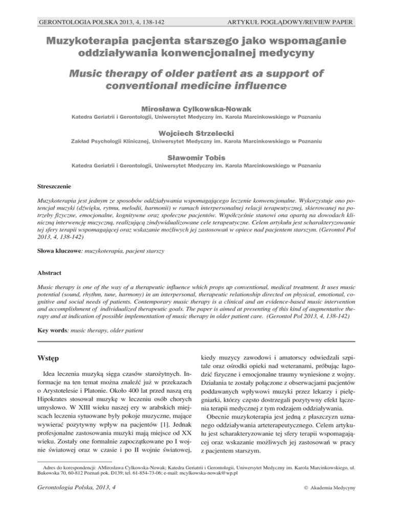 GERONTOLOGIA 2013, 4, 138-142 ARTYKUŁ POGLĄDOWY/REVIEW PAPER 138 MIROSŁAWAPOLSKA CYLKOWSKA-NOWAK, WOJCIECH STRZELECKI, SŁAWOMIR TOBIS Muzykoterapia pacjenta starszego jako wspomaganie oddziaływania konwencjonalnej medycyny Music therapy of older patient as a support of conventional medicine influence Mirosława Cylkowska-Nowak Katedra Geriatrii i Gerontologii, Uniwersytet Medyczny im. Karola Marcinkowskiego w Poznaniu Wojciech Strzelecki Zakład Psychologii Klinicznej, Uniwersytet Medyczny im. Karola Marcinkowskiego w Poznaniu Sławomir Tobis Katedra Geriatrii i Gerontologii, Uniwersytet Medyczny im. Karola Marcinkowskiego w Poznaniu Streszczenie Muzykoterapia jest jednym ze sposobów oddziaływania wspomagającego leczenie konwencjonalne. Wykorzystuje ono potencjał muzyki (dźwięku, rytmu, melodii, harmonii) w ramach interpersonalnej relacji terapeutycznej, skierowanej na potrzeby fizyczne, emocjonalne, kognitywne oraz społeczne pacjentów. Współcześnie stanowi ona opartą na dowodach kliniczną interwencję muzyczną, realizującą zindywidualizowane cele terapeutyczne. Celem artykułu jest scharakteryzowanie tej sfery terapii wspomagającej oraz wskazanie możliwych jej zastosowań w opiece nad pacjentem starszym. (Gerontol Pol 2013, 4, 138-142) Słowa kluczowe: muzykoterapia, pacjent starszy Abstract Music therapy is one of the way of a therapeutic influence which props up conventional, medical treatment. It uses music potential (sound, rhythm, tune, harmony) in an interpersonal, therapeutic relationship directed on physical, emotional, cognitive and social needs of patients. Contemporary music therapy is a clinical and an evidence-based music intervention and accomplishment of individualized therapeutic goals. The paper is aimed at presenting of this kind of augmentative therapy and at indication of possible implementation of music therapy in older patient care. (Gerontol Pol 2013, 4, 138-142) Key words: music therapy, older patient Wstęp Idea leczenia muzyką sięga czasów starożytnych. Informacje na ten temat można znaleźć już w przekazach o Arystotelesie i Platonie. Około 400 lat przed naszą erą Hipokrates stosował muzykę w leczeniu osób chorych umysłowo. W XIII wieku naszej ery w arabskich miejscach leczenia sytuowane były pokoje muzyczne, mające wywierać pozytywny wpływ na pacjentów [1]. Jednak profesjonalne zastosowania muzyki mają miejsce od XX wieku. Zostały one formalnie zapoczątkowane po I wojnie światowej oraz w czasie i po II wojnie światowej, kiedy muzycy zawodowi i amatorscy odwiedzali szpitale oraz ośrodki opieki nad weteranami, próbując łagodzić fizyczne i emocjonalne traumy wyniesione z wojny. Działania te zostały połączone z obserwacjami pacjentów poddawanych wpływowi muzyki przez lekarzy i pielęgniarki, którzy często dostrzegali pozytywny efekt łączenia terapii medycznej z tym rodzajem oddziaływania. Obecnie muzykoterapia jest jedną z płaszczyzn uznanego oddziaływania arteterapeutycznego. Celem artykułu jest scharakteryzowanie tej sfery terapii wspomagającej oraz wskazanie możliwych jej zastosowań w pracy z pacjentem starszym. Adres do korespondencji: AMirosława Cylkowska-Nowak; Katedra Geriatrii i Gerontologii, Uniwersytet Medyczny im. Karola Marcinkowskiego, ul. Bukowska 70, 60-812 Poznań pok. D139; tel. 61-854-73-06; e-mail: [email protected] Gerontologia Polska, 2013, 4 Ó Akademia Medycyny MUZYKOTERAPIA PACJENTA STARSZEGO ... Wczesne badania terapeutycznego wpływu muzykoterapii Wczesną publikacją o wpływie terapeutycznym muzyki był artykuł pt. Music physically considered, opublikowany w czasopiśmie „Columbian Magazine” w 1789 roku. W 1804 roku przedstawiona została i obroniona pierwsza dysertacja autorstwa Edwina Atlee, a w 1806 roku druga, Samuela Mathewsa, studentów dr Benjamina Rusha, znanego amerykańskiego psychiatry, który był entuzjastą wspomagania konwencjonalnego leczenia chorób psychicznych innymi formami oddziaływania terapeutycznego, w tym także muzyką [2]. Również w XIX wieku udokumentowana została w Stanach Zjednoczonych pierwsza interwencja muzykoterapeutyczna przeprowadzona w warunkach instytucjonalnych (na Blackwell’s Island w Nowym Jorku), jak również pierwszy systematyczny eksperyment (w 1899 roku neurolog, James Leonard Corning użył muzyki do wywierania wpływu na sen podczas terapii pacjentów z zaburzeniami tego rodzaju) [3]. Natomiast w Europie, w Londynie w 1891 roku powołana została Gildia Św. Cecylii, której członkowie – muzycy i śpiewacy – odbywali systematyczne sesje muzyczne dla pacjentów szpitali w celu podniesienia ich sił witalnych w stanie choroby [4]. W XX wieku znacząco wzrosło zainteresowanie potencjalnymi możliwościami i zastosowaniami różnych terapii wspomagających zasadnicze leczenie medyczne różnych grup pacjentów. Od lat 60-tych praktyka stosowania muzykoterapii często łączona była z prowadzeniem badań jej wpływu lub oceny jej skuteczności. Wiele wczesnych interwencji i badań prowadzonych było w odniesieniu do dzieci niepełnosprawnych oraz autystycznych. Pionierami tych terapii i badań byli między innymi: Nordoff i Robbins, Saperston, Alvin oraz Stevens i Clark. Wykazali oni, że „aplikowanie” muzyki prowadzi do zniesienia deficytów klinicznych u dzieci z autyzmem [5]. Wśród deficytów kluczowymi były jakościowe opóźnienia i zaburzenia komunikacji werbalnej oraz pozawerbalnej, brak reaktywności emocjonalnej i społecznej, zaburzenia w sferze behawioralnej (stereotypie ruchowe, zachowania obsesyjne, nietypowe reakcje na stymulacje sensoryczne itp.). W latach 70. Rickets opisał terapię intonacji melodycznej (MIT – Melodic Intonation Therapy) w pracy z dwoma chłopcami z niepełnosprawnością intelektualną – czterolatkiem i dziewięciolatkiem. Czterolatek nie utrzymywał kontaktu wzrokowego, reprezentował schematyzm w zachowaniu, manipulował długotrwale jednym przedmiotem. Po 3