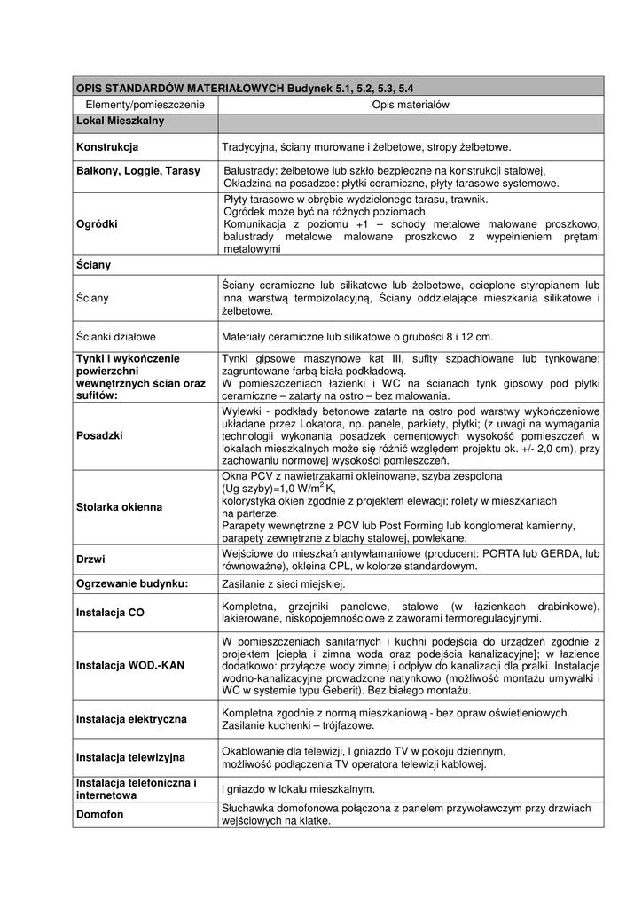 OPIS STANDARDÓW MATERIAŁOWYCH Budynek 5.1, 5.2, 5.3, 5.4 Elementy/pomieszczenie Opis materiałów Lokal Mieszkalny Konstrukcja Tradycyjna, ściany murowane i żelbetowe, stropy żelbetowe. Balkony, Loggie, Tarasy Balustrady: żelbetowe lub szkło bezpieczne na konstrukcji stalowej, Okładzina na posadzce: płytki ceramiczne, płyty tarasowe systemowe. Płyty tarasowe w obrębie wydzielonego tarasu, trawnik. Ogródek może być na różnych poziomach. Komunikacja z poziomu +1 – schody metalowe malowane proszkowo, balustrady metalowe malowane proszkowo z wypełnieniem prętami metalowymi Ogródki Ściany Ściany Ściany ceramiczne lub silikatowe lub żelbetowe, ocieplone styropianem lub inna warstwą termoizolacyjną, Ściany oddzielające mieszkania silikatowe i żelbetowe. Ścianki działowe Materiały ceramiczne lub silikatowe o grubości 8 i 12 cm. Tynki i wykończenie powierzchni wewnętrznych ścian oraz sufitów: Tynki gipsowe maszynowe kat III, sufity szpachlowane lub tynkowane; zagruntowane farbą biała podkładową. W pomieszczeniach łazienki i WC na ścianach tynk gipsowy pod płytki ceramiczne – zatarty na ostro – bez malowania. Wylewki - podkłady betonowe zatarte na ostro pod warstwy wykończeniowe układane przez Lokatora, np. panele, parkiety, płytki; (z uwagi na wymagania technologii wykonania posadzek cementowych wysokość pomieszczeń w lokalach mieszkalnych może się różnić względem projektu ok. +/- 2,0 cm), przy zachowaniu normowej wysokości pomieszczeń. Okna PCV z nawietrzakami okleinowane, szyba zespolona 2 (Ug szyby)=1,0 W/m K, kolorystyka okien zgodnie z projektem elewacji; rolety w mieszkaniach na parterze. Parapety wewnętrzne z PCV lub Post Forming lub konglomerat kamienny, parapety zewnętrzne z blachy stalowej, powlekane. Wejściowe do mieszkań antywłamaniowe (producent: PORTA lub GERDA, lub równoważne), okleina CPL, w kolorze standardowym. Posadzki Stolarka okienna Drzwi Ogrzewanie budynku: Zasilanie z sieci miejskiej. Instalacja CO Kompletna, grzejniki panelowe, stalowe (w łazienkach drabinkowe), lakierowane, niskopojemnościowe z zaworami termoregulacyjnymi. Instalacja WOD.-KAN W pomieszczeniach sanitarnych i kuchni podejścia do urządzeń zgodnie z projektem [ciepła i zimna woda oraz podejścia kanalizacyjne]; w łazience dodatkowo: przyłącze wody zimnej i odpływ do kanalizacji dla pralki. Instalacje wodno-kanalizacyjne prowadzone natynkowo (możliwość montażu umywalki i WC w systemie typu Geberit). Bez białego montażu. Instalacja elektryczna Kompletna zgodnie z normą mieszkaniową - bez opraw oświetleniowych. Zasilanie kuchenki – trójfazowe. Instalacja telewizyjna Okablowanie dla telewizji, l gniazdo TV w pokoju dziennym, możliwość podłączenia TV operatora telewizji kablowej. Instalacja telefoniczna i internetowa l gniazdo w lokalu mieszkalnym. Domofon Słuchawka domofonowa połączona z panelem przywoławczym przy drzwiach wejściowych na klatkę. Parkingi wielostanowiskowe – w poziomie parteru oraz podziemny – poziom -1 Betonowy, wyłożony kostką typu „Polbruk”. Dwa oddzielne wjazdami w budynku nr 5.1, 5.2, 5.3, 5.4. Garaż podziemny Wjazdy do garaży (poziom -1) wjazd/wyjazd od strony zachodniej. Garaż w poziomie parteru wjazd/wyjazd od strony wschodniej. Miejsca postojowe Wydzielone linią poziomą wymalowaną na posadzce. Wykończenie ścian wewnętrznych Beton lub tynk kat.II. Brama wjazdowa Stalowa sterowana pilotem. Wykończenie posadzki Posadzka betonowa utwardzona powierzchniowo. Części Wspólne Strefa wejściowa Wykończenie ścian wewnętrznych i sufitów Tynk maszynowy gipsowy kat. III malowany farbą akrylową w kolorze według projektu; elementy okładziny kamiennej i/lub ceramiczne. Wykończenie posadzki Okładziny ceramiczne. Instalacja elektryczna Oświetleniowa kompletna. Skrzynki pocztowe Stalowe. Klatka schodowa i korytarze Wykończenie ścian wewnętrznych i sufitów Tynk maszynowy gipsowy kat. III malowany farbą akrylową w kolorze według projektu; sufity - beton malowany farbą akrylową lub tynk gipsowy maszynowy. Wykończenie posadzki Płytki ceramiczne. Balustrady wewnętrzne Metalowe, malowane proszkowo. Instalacja elektryczna Kompletna z oprawami oświetleniowymi. Instalacja CO Kompletna. Windy W każdej klatce od najniższego poziomu parkingu podziemnego do najwyższej kondygnacji mieszkalnej. Elewacja Okładziny ścian Tynk strukturalny na warstwie izolacyjnej (technologia wykonania metodą lekką mokrą) zgodny z kolorystyką wg projektu. Elementy/kraty stalowe dla roślin pnących. Elementy drewniane i/lub okładziny elewacyjne drewnopodobne zgodnie z kolorystyką wg projektu. Balustrady zewnętrzne Żelbetowe lub szkło bezpieczne na konstrukcji stalowej Elementy przeszkleń na klatkach schodowych oraz wejścia do klatek schodowych – ślusarka aluminiowa. Zagospodarowanie terenu osiedla Stolarka i ślusarka Chodniki i placyki Kostka betonowa typu „Polbruk” lub ażurowa. Parkingi Ogólnodostępne miejsca postojowe na terenie osiedla. Oświetlenie terenu Lampy wolnostojące typu parkowego i uliczne. Pozostała przestrzeń zewnętrzna Trawniki, kompozycje roślinne, elementy małej architektury.