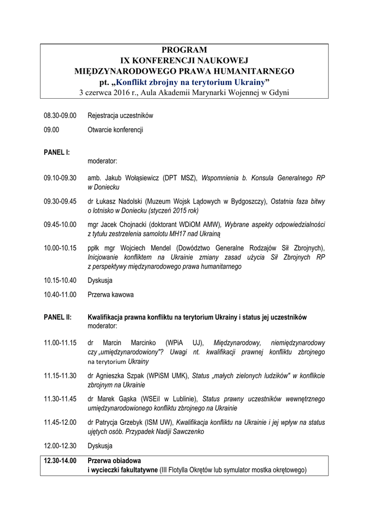PROGRAM IX KONFERENCJI NAUKOWEJ MIĘDZYNARODOWEGO PRAWA HUMANITARNEGO pt. „Konflikt zbrojny na terytorium Ukrainy” 3 czerwca 2016 r., Aula Akademii Marynarki Wojennej w Gdyni 08.30-09.00 Rejestracja uczestników 09.00 Otwarcie konferencji PANEL I: moderator: 09.10-09.30 amb. Jakub Wołąsiewicz (DPT MSZ), Wspomnienia b. Konsula Generalnego RP w Doniecku 09.30-09.45 dr Łukasz Nadolski (Muzeum Wojsk Lądowych w Bydgoszczy), Ostatnia faza bitwy o lotnisko w Doniecku (styczeń 2015 rok) 09.45-10.00 mgr Jacek Chojnacki (doktorant WDiOM AMW), Wybrane aspekty odpowiedzialności z tytułu zestrzelenia samolotu MH17 nad Ukrainą 10.00-10.15 ppłk mgr Wojciech Mendel (Dowództwo Generalne Rodzajów Sił Zbrojnych), Inicjowanie konfliktem na Ukrainie zmiany zasad użycia Sił Zbrojnych RP z perspektywy międzynarodowego prawa humanitarnego 10.15-10.40 Dyskusja 10.40-11.00 Przerwa kawowa PANEL II: Kwalifikacja prawna konfliktu na terytorium Ukrainy i status jej uczestników moderator: 11.00-11.15 dr Marcin Marcinko (WPiA UJ), Międzynarodowy, niemiędzynarodowy czy „umiędzynarodowiony"? Uwagi nt. kwalifikacji prawnej konfliktu zbrojnego na terytorium Ukrainy 11.15-11.30 dr Agnieszka Szpak (WPiSM UMK), Status „małych zielonych ludzików" w konflikcie zbrojnym na Ukrainie 11.30-11.45 dr Marek Gąska (WSEiI w Lublinie), Status prawny uczestników wewnętrznego umiędzynarodowionego konfliktu zbrojnego na Ukrainie 11.45-12.00 dr Patrycja Grzebyk (ISM UW), Kwalifikacja konfliktu na Ukrainie i jej wpływ na status ujętych osób. Przypadek Nadiji Sawczenko 12.00-12.30 Dyskusja 12.30-14.00 Przerwa obiadowa i wycieczki fakultatywne (III Flotylla Okrętów lub symulator mostka okrętowego) PANEL III: Konflikt zbrojny na Ukrainie a koncepcja „wojny hybrydowej” moderator: 14.15-14.30 gen. bryg. rez. Krzysztof Parulski (prof. wiz. AON), Wojna hybrydowa w świetle prawa międzynarodowego ze szczególnym uwzględnieniem MPH. Konflikt zbrojny na Ukrainie jako główne stadium przypadku 14.30-14.45 prof. dr hab. Krzysztof Kubiak (Uniwersytet Jana Kochanowskiego), O nędzy konceptu „wojny hybrydowej” 14.45-15.00 dr Radosław Tyślewicz (WDiOM AMW), Działania hybrydowe Federacji Rosyjskiej na Ukrainie – atak czy obrona? 15.00-15.15 mgr Dariusz Paździur (DKSW Kraków), Rosyjskie działania i zagrożenia hybrydowe a międzynarodowe prawo humanitarne konfliktów zbrojnych 15.15-15.30 Jarosław Krysiński (12 bdow 12 DZ, doktorant w Instytucie Politologii i Europeistyki USz), Konflikt ukraiński i jego implikacje dla Polski 15.30-16.00 Dyskusja 16.00-16.15 Przerwa kawowa PANEL IV: Przestrzeganie prawa międzynarodowego w konflikcie zbrojnym na Ukrainie moderator: 16.15-16.30 mgr Mateusz Piątkowski (doktorant WPiA UŁ), Użycie sił powietrznych oraz nieprecyzyjnych środków artyleryjskich podczas konfliktu na Ukrainie w świetle MPH 16.30-16.45 dr Piotr Łubiński (IBiEO UP w Krakowie), Dziennikarze wojenni we współczesnych konfliktach zbrojnych na przykładzie Ukrainy 16.45-17.00 dr Katarzyna Góralczyk (WNoB Krakowska Akademia im. A. Frycza-Modrzewskiego), Ochrona dóbr kultury podczas konfliktu zbrojnego na Ukrainie 17.00-17.15 dr Julia Kapelańska-Pręgowska (WPiA UMK), Problem odpowiedzialności za naruszenia Europejskiej Konwencji Praw Człowieka w trakcie konfliktu zbrojnego na Krymie i w Dombasie 17.15-17.30 mar. Agata Guziel (44. Baza Lotnictwa Morskiego, doktorantka WPiA UG), Prawa człowieka na tle konfliktu zbrojnego na Ukrainie 17.30-17.45 mgr (doktorantka) Milena Stenka (Sąd Rejonowy Gdańsk-Północ), Wojna na Ukrainie jako przykład naruszenia normy ius cogens i początek nowych wyzwań dla bezpieczeństwa międzynarodowego 17.45-18.15 Dyskusja ok. 18.15 Zakończenie konferencji