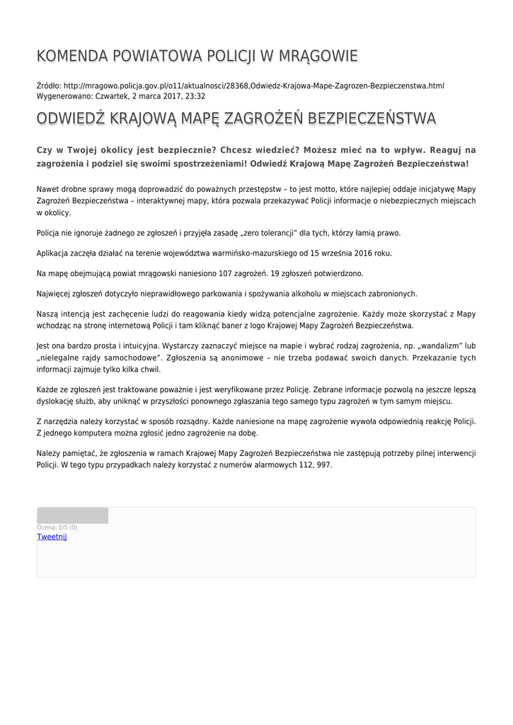 KOMENDA POWIATOWA POLICJI W MRĄGOWIE Źródło: http://mragowo.policja.gov.pl/o11/aktualnosci/28368,Odwiedz-Krajowa-Mape-Zagrozen-Bezpieczenstwa.html Wygenerowano: Czwartek, 2 marca 2017, 23:32 ODWIEDŹ KRAJOWĄ MAPĘ ZAGROŻEŃ BEZPIECZEŃSTWA Czy w Twojej okolicy jest bezpiecznie? Chcesz wiedzieć? Możesz mieć na to wpływ. Reaguj na zagrożenia i podziel się swoimi spostrzeżeniami! Odwiedź Krajową Mapę Zagrożeń Bezpieczeństwa! Nawet drobne sprawy mogą doprowadzić do poważnych przestępstw – to jest motto, które najlepiej oddaje inicjatywę Mapy Zagrożeń Bezpieczeństwa – interaktywnej mapy, która pozwala przekazywać Policji informacje o niebezpiecznych miejscach w okolicy. Policja nie ignoruje żadnego ze zgłoszeń i przyjęła zasadę „zero tolerancji” dla tych, którzy łamią prawo. Aplikacja zaczęła działać na terenie województwa warmińsko-mazurskiego od 15 września 2016 roku. Na mapę obejmującą powiat mrągowski naniesiono 107 zagrożeń. 19 zgłoszeń potwierdzono. Najwięcej zgłoszeń dotyczyło nieprawidłowego parkowania i spożywania alkoholu w miejscach zabronionych. Naszą intencją jest zachęcenie ludzi do reagowania kiedy widzą potencjalne zagrożenie. Każdy może skorzystać z Mapy wchodząc na stronę internetową Policji i tam kliknąć baner z logo Krajowej Mapy Zagrożeń Bezpieczeństwa. Jest ona bardzo prosta i intuicyjna. Wystarczy zaznaczyć miejsce na mapie i wybrać rodzaj zagrożenia, np. „wandalizm” lub „nielegalne rajdy samochodowe”. Zgłoszenia są anonimowe – nie trzeba podawać swoich danych. Przekazanie tych informacji zajmuje tylko kilka chwil. Każde ze zgłoszeń jest traktowane poważnie i jest weryfikowane przez Policję. Zebrane informacje pozwolą na jeszcze lepszą dyslokację służb, aby uniknąć w przyszłości ponownego zgłaszania tego samego typu zagrożeń w tym samym miejscu. Z narzędzia należy korzystać w sposób rozsądny. Każde naniesione na mapę zagrożenie wywoła odpowiednią reakcję Policji. Z jednego komputera można zgłosić jedno zagrożenie na dobę. Należy pamiętać, że zgłoszenia w ramach Krajowej Mapy Zagrożeń Bezpieczeństwa nie zastępują potrzeby pilnej interwencji Policji. W tego typu przypadkach należy korzystać z numerów alarmowych 112, 997. Ocena: 0/5 (0) Tweetnij