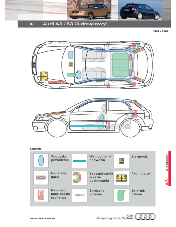 • Audi A3 Modell / S3 (3-drzwiowy) 1996 – 2003 Wzmocnienie nadwozia Sterownik Generator gazu Zabezpieczenie w razie dachowania Akumulator Napinacz pasa bezpieczeństwa Sprężyna gazowa Zbiornik paliwa Stan na: 08/2013, Audi AG A3 Poduszka powietrzna +S3 (3-drzwiowy) Legenda