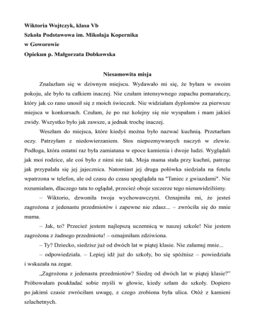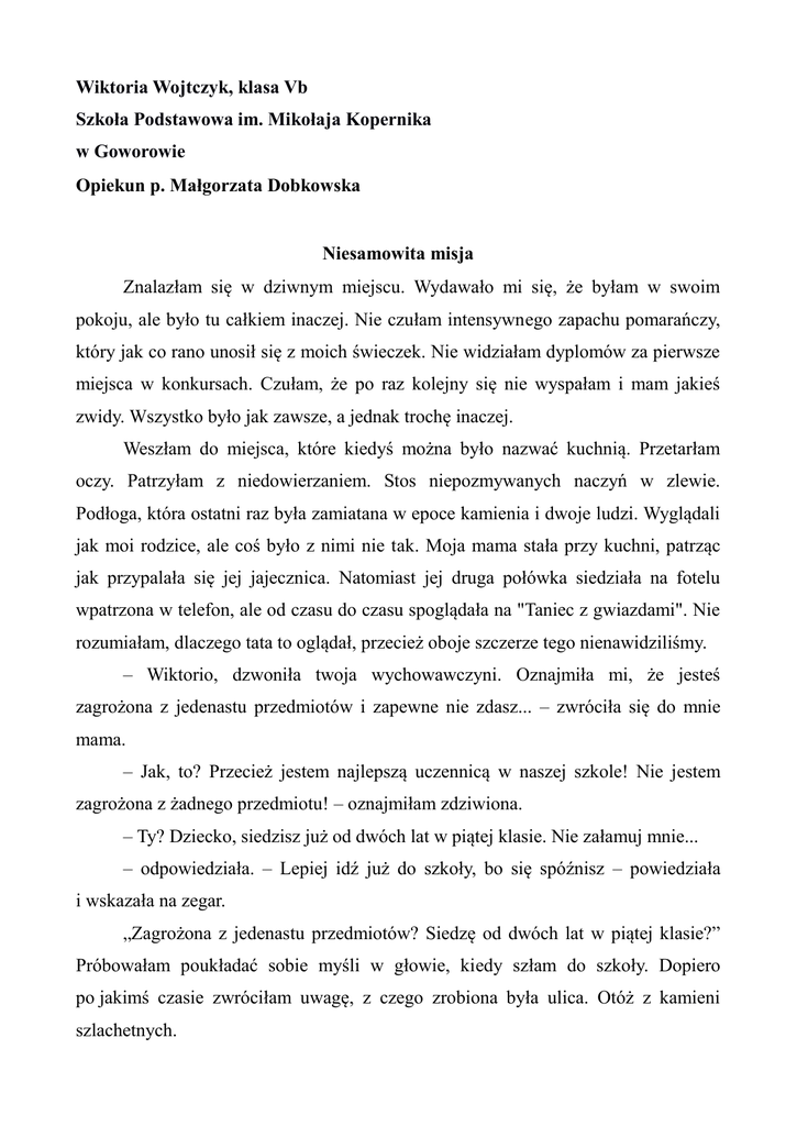 Wiktoria Wojtczyk, klasa Vb Szkoła Podstawowa im. Mikołaja Kopernika w Goworowie Opiekun p. Małgorzata Dobkowska Niesamowita misja Znalazłam się w dziwnym miejscu. Wydawało mi się, że byłam w swoim pokoju, ale było tu całkiem inaczej. Nie czułam intensywnego zapachu pomarańczy, który jak co rano unosił się z moich świeczek. Nie widziałam dyplomów za pierwsze miejsca w konkursach. Czułam, że po raz kolejny się nie wyspałam i mam jakieś zwidy. Wszystko było jak zawsze, a jednak trochę inaczej. Weszłam do miejsca, które kiedyś można było nazwać kuchnią. Przetarłam oczy. Patrzyłam z niedowierzaniem. Stos niepozmywanych naczyń w zlewie. Podłoga, która ostatni raz była zamiatana w epoce kamienia i dwoje ludzi. Wyglądali jak moi rodzice, ale coś było z nimi nie tak. Moja mama stała przy kuchni, patrząc jak przypalała się jej jajecznica. Natomiast jej druga połówka siedziała na fotelu wpatrzona w telefon, ale od czasu do czasu spoglądała na "Taniec z gwiazdami". Nie rozumiałam, dlaczego tata to oglądał, przecież oboje szczerze tego nienawidziliśmy. – Wiktorio, dzwoniła twoja wychowawczyni. Oznajmiła mi, że jesteś zagrożona z jedenastu przedmiotów i zapewne nie zdasz... – zwróciła się do mnie mama. – Jak, to? Przecież jestem najlepszą uczennicą w naszej szkole! Nie jestem zagrożona z żadnego przedmiotu! – oznajmiłam zdziwiona. – Ty? Dziecko, siedzisz już od dwóch lat w piątej klasie. Nie załamuj mnie... – odpowiedziała. – Lepiej idź już do szkoły, bo się spóźnisz – powiedziała i wskazała na zegar. „Zagrożona z jedenastu przedmiotów? Siedzę od dwóch lat w piątej klasie?” Próbowałam poukładać sobie myśli w głowie, kiedy szłam do szkoły. Dopiero po jakimś czasie zwróciłam uwagę, z czego zrobiona była ulica. Otóż z kamieni szlachetnych. Pierwsza lekcja, którą miałam tego dnia, to język angielski. Rozejrzałam się po klasie. Wszyscy i wszystko wydawało się takie inne. Dziewczyny, które zazwyczaj były ubrane w jasne, pastelowe kolory miały na sobie czarne, skórzane kurtki i mocny makijaż. Natomiast nie najlepsi uczniowie naszej klasy siedzieli z nosami w książkach, co było do nich niepodobne. Najnormalniejsza wydała mi się moja przyjaciółka Olka. Dziewczyna szeptała mi coś do ucha. Zrozumiałam tylko to, że wytłumaczy mi wszystko po szkole... Kiedy wracałyśmy do domu, wypytywałam Olkę o to, co stało się z naszym światem, z ludźmi, ze szkołą i ze wszystkim. Dziewczyna kazała mi popatrzeć w górę. Przeraziłam się. Miejsce, gdzie kiedyś o tej porze można było zobaczyć chmury i błękitne niebo, zastąpiła galaktyka. Ciemność, gwiazdy i planety?! Nie potrafiłam uwierzyć w to, co się działo. Usiadłam na chodniku i patrzyłam w górę z niedowierzaniem. Nie potrafiłam pozbierać myśli w głowie. "Czy zbliża się koniec świata?!" - pomyślałam. – Wiktorio, czy to naprawdę ty? – zapytała koleżanka. – Olka, co ty mówisz? To chyba oczywiste, że ja.. O co chodzi! – zapytałam zdziwiona. – Czy to ty? Wiktoria, najlepsza uczennica szkoły, pogodna i miła osoba, która niesie bezinteresowną pomoc każdemu, kto jej potrzebuje? – ciągnęła dalej Ola. – No ja, a kto? – rzekłam. – Teraz wyznam ci całą prawdę. Czekałam na ten moment od pięciu tysięcy lat. Tak naprawdę nazywam się Ari de Lune. Witaj na Nepluftunie! Ziemia i Neplufutun przeniknęły się. Ty żyłaś na Ziemi jako mądra, inteligentna dziewczyna. Teraz jesteś zupełnym przeciwieństwem siebie. Tak samo jest z każdym, ale ty zostałaś wybrana. Musisz przeprowadzić badania, które wykażą, który świat jest lepszy. Jeden z nich będzie zniszczony. Masz 24 godziny, aby je zrobić. Jeżeli się nie wywiążesz, obie planety przestaną istnieć. Przemyślałam to, co powiedziała i wzięłam się do pracy. Opisywałam korę drzew z dokładnością, każdy liść, każde źdźbło trawy. Sprawdzałam ilość rzek na całym świecie. Patrzyłam na populację ludzi we wszystkich krajach. Starałam się zrobić wszystko z jak największą dokładnością. Czas mijał bardzo powoli, tak jakby te 24 godziny zamieniły się w wieczność. Nagle poczułam się dziwnie. Jakaś nadprzyrodzona siła zamknęła mój notes. Poczułam, że tracę kontrolę nad swoim ciałem. Nie wiem, jak to się stało, ale gdy otworzyłam oczy, ujrzałam swój dawny pokój. Byłam już u siebie! Udało mi się! W dłoni ściskałam kartkę z notesu, na której było napisane: "Zostało ci niewiele czasu, nie zawiedź nas!" Uśmiechnęłam się szeroko i wyszłam z pokoju... To był cudowny dzień!