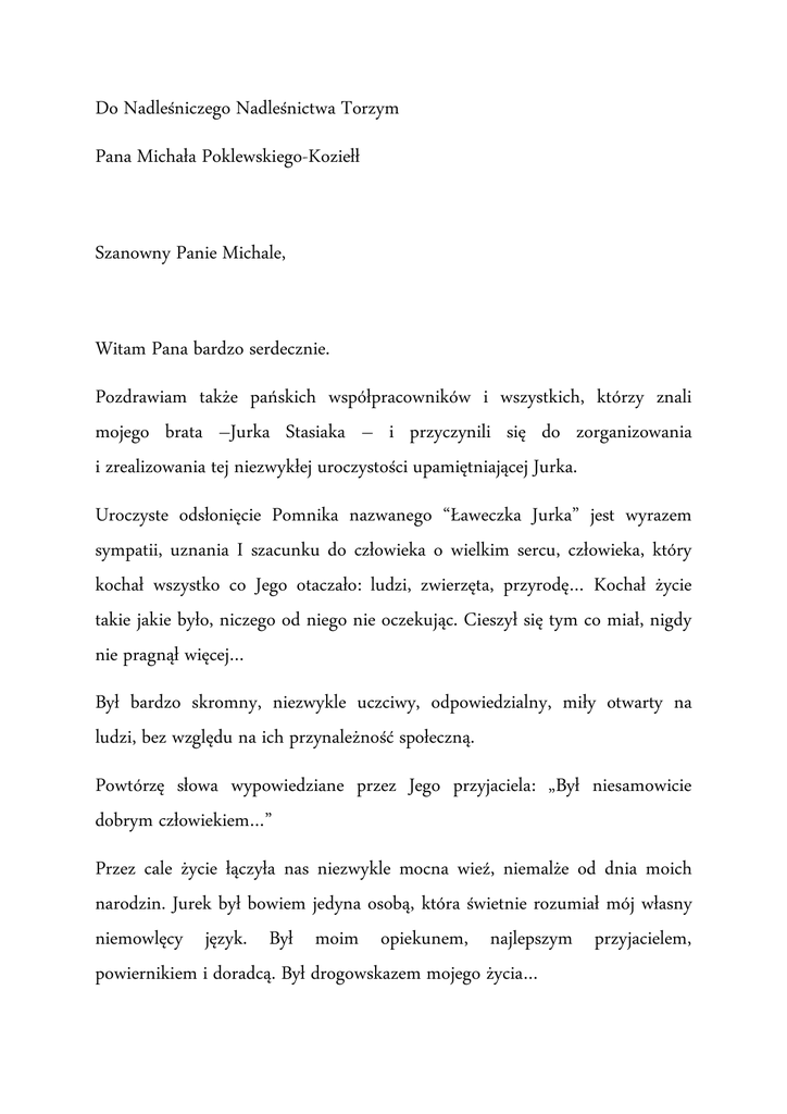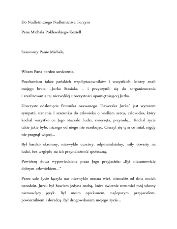 Do Nadleśniczego Nadleśnictwa Torzym Pana Michała Poklewskiego-Koziełł Szanowny Panie Michale, Witam Pana bardzo serdecznie. Pozdrawiam także pańskich współpracowników i wszystkich, którzy znali mojego brata –Jurka Stasiaka – i przyczynili się do zorganizowania i zrealizowania tej niezwykłej uroczystości upamiętniającej Jurka. Uroczyste odsłonięcie Pomnika nazwanego “Ławeczka Jurka” jest wyrazem sympatii, uznania I szacunku do człowieka o wielkim sercu, człowieka, który kochał wszystko co Jego otaczało: ludzi, zwierzęta, przyrodę… Kochał życie takie jakie było, niczego od niego nie oczekując. Cieszył się tym co miał, nigdy nie pragnął więcej… Był bardzo skromny, niezwykle uczciwy, odpowiedzialny, miły otwarty na ludzi, bez względu na ich przynależność społeczną. Powtórzę słowa wypowiedziane przez Jego przyjaciela: „Był niesamowicie dobrym człowiekiem…” Przez cale życie łączyła nas niezwykle mocna wieź, niemalże od dnia moich narodzin. Jurek był bowiem jedyna osobą, która świetnie rozumiał mój własny niemowlęcy język. Był moim opiekunem, najlepszym przyjacielem, powiernikiem i doradcą. Był drogowskazem mojego życia… Bardzo kochał rodzinę, opiekując się Nią i poświęcając jej większość swojego czasu. Nigdy nie odmawiał nikomu pomocy. Był dla mnie absolutnym wzorem, moim Idolem i pozostanie nim do końca mojego życia. Bardzo chciałam przylecieć na te uroczystość, niestety mój stan zdrowia zniweczył te plany. Nie mogę wiec osobiście podziękować wszystkim, którzy przyczynili się do zorganizowania tej uroczystości i jej uczestnikom. W imieniu całej mojej rodziny a zwłaszcza mojej mamy i moim własnym bardzo serdecznie dziękuje przede wszystkim Panu Nadleśniczemu Nadleśnictwa Torzym Michałowi Poklewskiemu-Koziełł, Dyrektorowi Generalnemu Lasów Państwowych Marianowi Piganowi, Dyrektorowi Regionalnej Dyrekcji LP w Zielonej Górze Leszkowi Banachowi, Ks.Kan. Mirosławowi Donabidowiczowi, Burmistrzowi Torzymia Ryszardowi Stanulewiczowi, władzom miasta, dyrektorowi Andrzejowi Radeckiemu i Jerzemu Zielińskiemu a także wszystkim pomysłodawcom i wykonawcom tego pięknego daru dla Jurka – pomnika Ławeczki oraz poprowadzenia tej wzruszającej uroczystości. Bardzo przepraszam jeśli kogoś pominęłam, ale nie mam listy organizatorów tego pięknego przedsięwzięcia. Życzę wszystkim zebranym dużo zdrowia i wszystkiego co najlepsze. Dziękuje Jolanta Kucharska (Stasiak) z Rodziną ***** ”Tu Ciebie nie ma, lecz jesteś przecież I pozostaniesz w Jasnym Świecie Jest cos, co mrokom się opiera Jest pamięć. A ona nie umiera…..”