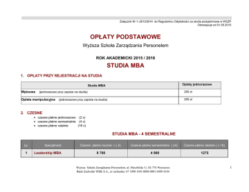 Załącznik Nr 1–2013/2014 do Regulaminu Odpłatności za studia podyplomowe w WSZP Obowiązuje od 01.05 2015 OPŁATY PODSTAWOWE Wyższa Szkoła Zarządzania Personelem ROK AKADEMICKI 2015 / 2016 STUDIA MBA 1. OPŁATY PRZY REJESTRACJI NA STUDIA Opłaty jednorazowe Studia MBA Wpisowe 200 zł (jednorazowo przy zapisie na studia) Opłata manipulacyjna 200 zł (jednorazowo przy zapisie na studia) 2. CZESNE • czesne płatne jednorazowo (2 x) • czesne płatne semestralnie (4 x) • czesne płatne ratalnie (16 x) STUDIA MBA - 4 SEMESTRALNE Lp. 1 Specjalność Leadership MBA Czesne płatne rocznie ( x 2) Czesne płatne semestralnie ( x4) Czesne płatne ratalnie ( x 16) 9 700 4 900 1275 Wyższa Szkoła Zarządzania Personelem, ul. Hirszfelda 11, 02-776 Warszawa Bank Zachodni WBK S.A., nr rachunku: 67 1090 1043 0000 0001 0489 4184 1 3. PROMOCJE Z TYTUŁU WPŁAT JEDONORAZOWYCH a) Przy zapisach na studia i wpłacie z góry za I rok studiów słuchacz nie płaci wpisowego i opłaty manipulacyjnej b) Przy zapisach na studia i wpłacie z góry za I semestr studiów, słuchacz nie płaci wpisowego 4. PROMOCJE DLA ZAPISÓW GRUPOWYCH przy zapisie minimum 2 osób z tej samej instytucji, każda otrzyma 5 % rabatu od kwoty czesnego za całe studia, pod warunkiem uiszczania jednorazowych opłat rocznych. 6. TERMINY I ZASADY PŁATNOŚCI 1) TERMINY PŁATNOŚCI a) b) opłata roczna do 15 października (dla rozpoczynających studia w październiku) lub do 15 marca (dla rozpoczynających studia marcu), opłata semestralna do 15 października za semestr zimowy i do 15 marca za semestr letni, c) opłata ratalna (system 16 rat): dla rozpoczynających studia w semestrze zimowym (październik): dla rozpoczynających studia w semestrze letnim (marzec) I rata do 15 października I rata do 15 marca II rata do 15 listopada II rata do 15 kwietnia III rata do 15 grudnia III rata do 15 maja IV rata do 15 stycznia IV rata do 15 czerwca V rata do 15 marca V rata do 15 października VI rata do 15 kwietnia VI rata do 15 listopada VII rata do 15 maja VII rata do 15 grudnia VIII rata do 15 czerwca VIII rata do 15 stycznia Wyższa Szkoła Zarządzania Personelem, ul. Hirszfelda 11, 02-776 Warszawa Bank Zachodni WBK S.A., nr rachunku: 67 1090 1043 0000 0001 0489 4184 2 2) WYBÓR FORM PŁATNOŚCI W terminie do 15 października słuchacz ma prawo do zmiany, w formie pisemnej, systemu płatności czesnego określonego w podpisanej umowie o świadczenie usług edukacyjnych, w ramach systemów płatności obowiązujących na Uczelni. b) Zmiana systemu płatności po 15 października jest dopuszczona w wyjątkowych przypadkach i jest możliwa pod warunkiem zgłoszenia zmiany w formie pisemnej z uzasadnieniem oraz uregulowaniem ewentualnej różnicy powstałej w związku z tą zmianą. Terminem granicznym zmiany systemu płatności jest 15 grudnia c) Zmiana systemu płatności dla słuchaczy rozpoczynających studia od semestru letniego następuje analogicznie jak w punktach 2 i 3, z tym są terminami granicznymi są odpowiednio 15 marca i 15 maja. d) Z tytułu nieterminowego opłacania czesnego Uczelnia nalicza odsetki ustawowe. a) UWAGA: • • Jeźeli studia nie zostają uruchomione z przyczyn organizacyjnych leżących po ze stronie Szkoły, to Szkoła zwraca opłatę z tytułu wpisowego, wpłacone czesne i opłatę manipulacyjną. Jeżeli kandydat zrezygnuje w okresie krótszym niż miesiąc od daty rozpoczęcia zajęć, to Szkoła nie zwraca żadnych opłat, za wyjątkiem wpłaconego czesnego. Wyższa Szkoła Zarządzania Personelem, ul. Hirszfelda 11, 02-776 Warszawa Bank Zachodni WBK S.A., nr rachunku: 67 1090 1043 0000 0001 0489 4184 3
