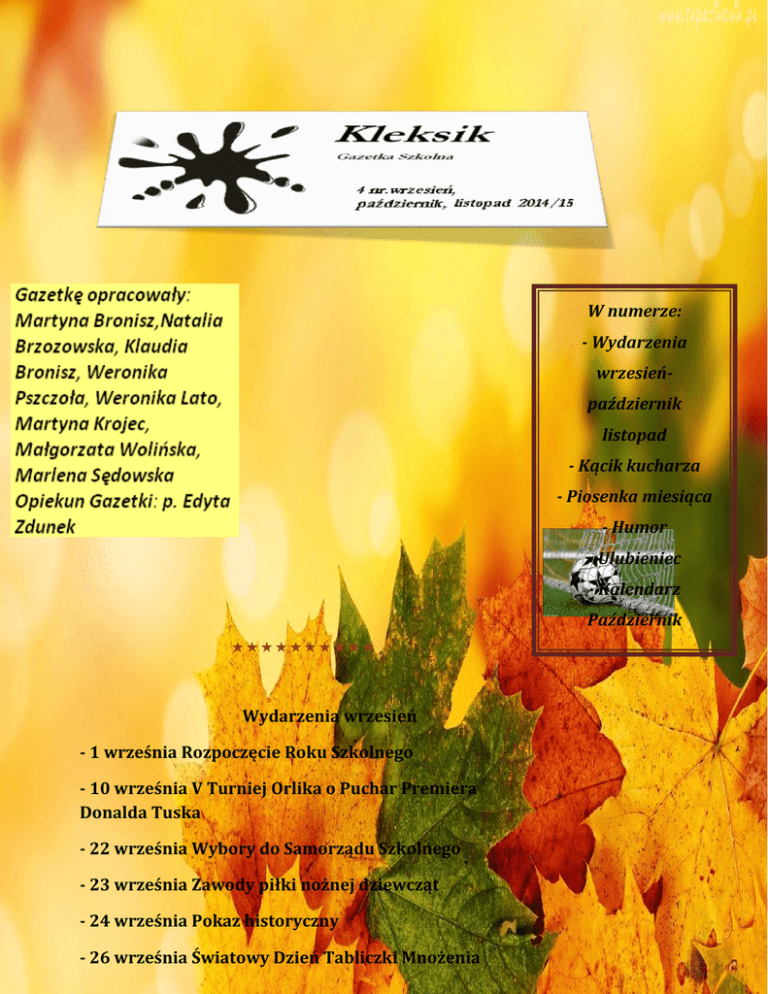W numerze: - Wydarzenia wrzesieńpaździernik listopad - Kącik kucharza - Piosenka miesiąca - Humor - Ulubieniec - Kalendarz Październik Wydarzenia wrzesień - 1 września Rozpoczęcie Roku Szkolnego - 10 września V Turniej Orlika o Puchar Premiera Donalda Tuska - 22 września Wybory do Samorządu Szkolnego - 23 września Zawody piłki nożnej dziewcząt - 24 września Pokaz historyczny - 26 września Światowy Dzień Tabliczki Mnożenia Wydarzenia październik - 12 października Dzień Papieski - 14 października Dzień Edukacji Narodowej - 26 października Zmiana czasu z letniego na zimowy SKO Prosimy o wpłacanie pieniędzy na SKO. Wszystkie oszczędności prosimy oddawać do p. Marzeny Roli. Martyna Bronisz Wydarzenia listopad - 5 listopada Turniej tenisa stołowego i III Przegląd Piosenki Patriotycznej - 11 listopada - ŚWIĘTO ODZYSKANIA NIEPODLEGŁOŚCI - 21 listopada Wycieczka do fabryki bombek choinkowych w Nowej Dębie - 25 listopada Andrzejki - 26 listopada Gminny Konkurs Recytatorski Turniej tenisa stołowego Dnia 05.11.2014r w Szkole Podstawowej w Łucce odbył się turniej tenisa stołowego. Na zawody pojechali: Agnieszka Wójtowicz, Martyna Krojec, Małgorzta Wolińska, Marlena Sędowska, Alicja Pietrzela, Adam Wójtowicz, Maksymilian Włosek, Martyna Jędryszka, Krystian Malesa, Jakub Dziewulski pod opieką Pani Moniki Bronisz. Wszystkim zawodnikom poszło świetnie. Najlepsze miejsca zajęli: Agnieszka Wójtowicz II miejsce, Martyna Krojec III miejsce, Małgorzata Wolińska IV miejsce, Adam Wójtowicz IV miejsce. Wymienione osoby zakwalifikowały się do szczebla powiatowego. III Przegląd Piosenki Patriotycznej w naszej szkole Dnia 05.11.2014r. w naszej szkole odbył się III Przegląd Piosenki Patriotycznej. Do Jury zostali zaproszeni: p.Anna Kozak, p. Beata Wilczyńska oraz p. Andrzej Zaręba. Wszystkie występy były cudowne na swój sposób. Po długiej naradzie zostały ogłoszone wyniki. Naszą szkołę reprezentowały: W kategorii Przedszkole kl.0 Klaudia Kapusta-1 miejsce I-III Laura Jędryszka- 2 miejsce IV-VI Kinga Kożuch- 1 miejsce - 11 LISTOPADA - SWIĘTO ODZYSKANIA NIEPODLEGŁOSCI Odzyskanie niepodległości przez Polskę to ważne wydarzenie w dziejach naszego kraju. Z tej okazji uczniowie klas starszych ze Szkoły Podstawowej w Brzezinach przygotowali okolicznościowy apel. Wiersze o tematyce niepodległościowej , wojennej oraz liryczne pieśni patriotyczne czy pełne mocy hymny, jak „ Rota”, „ Żeby Polska…..” swoją wymową skłaniały do refleksji i wzruszeń. Wspaniałe głosy uczestników i piękne recytacje zostały docenione przez widzów gromkimi brawami. Oprawę muzyczną , razem dziewczętami z koła gitarowego, przygotowała p. K. Ogrodowska. Nad całością występu czuwała p. M. Rola. Uczniowie swój kunszt artystyczny zaprezentowali również podczas mszy św. 11.11.2014 r. w kaplicy w Brzezinach oraz w kościele p.w. Wniebowstąpienia Pańskiego. Występu wysłuchały także 12.11.2014 r. mieszkanki Domu Pomocy Społecznej w Jadwinowie. Wycieczka do fabryki bombek choinkowych w Nowej Dębie Dnia 21 listopada 2014 roku uczniowie Szkoły Podstawowej w Brzezinach odwiedzili fabrykę bombek w Nowej Dębie. Podczas zwiedzania zakładowego muzeum i wszystkich działów produkcyjnych uczestnicy wycieczki zapoznali się ze sposobem wytwarzania bombek choinkowych. Dowiedzieli się również, że w zakładzie zgodnie z wieloletnią tradycją, unikatowe ozdoby świąteczne wytwarzane są w całości ręcznie. Przewodnik opowiedział uczniom także, że bombki z fabryki pana Janusz a Bilińskiego są produktem rozpoznawalnym przez koneserów szklanych ozdób choinkowych na całym świecie oraz o tym, że Firma Biliński ma na swoim koncie kolekcje bombek wykonaną dla duńskiej Fundacji Andersenowskiej. Zwiedziliśmy również wystawę bombek, które produkowane są w tym zakładzie. W programie wycieczki znalazły się także warsztaty plastyczne, podczas których dzieci mogły wykazać się talentem i pomysłowością w zdobieniu bombek. Na zakończenie każdy z uczestników otrzymał pamiątkową bombkę z własnym imieniem. Na zakończenie uczestnicy wycieczki udali się na obiad do McDonald's. Pobyt w McDonald's przysporzył uczniom wiele radości. Smaczny obiad dodał im sił i sprawił, że ten dzień był jeszcze przyjemniejszy. Wycieczka dostarczyła wszystkim niezapomnianych wrażeń i wprowadziła w atmosferę świąt. Opiekę nad uczniami sprawowały panie Marzena Rola i Edyta Zdunek. ANDRZEJKI We wtorek 25 listopada 2014 roku odbyła się w naszej szkole dyskoteka andrzejkowa. Były konkursy i wróżby. Wszystkim przepowiadano wspaniałą przyszłość, co wprawiło nas w jeszcze weselszy nastrój. Cała sala brała udział w licznych konkursach, a ich zwycięzcy otrzymali drobne upominki. W krótkiej przerwie mogliśmy się posilić i ruszyć do dalszej zabawy. Poczęstunek przygotowali nasi wspaniali Rodzice. Ale zabawa nie byłaby tak kolorowa i świetlista, gdyby nie nasz kolega z klasy V – Wojtek. Świeciły i mrugały nam kolorowe lampki. Podczas zabawy zostali wybrani króloiwie i królowe balu andrzejkowego. W kat. przedszkola zwyciężyli: Cyprian Baran i Nikola Puła, w kat. 0 - Kuba Barczak i Monika Włosek, w kat. I- III wyróżnieni zostali Maja Guz i Adrian Sowa oraz w kat. IV-VI Martyna Bronisz i Szymon Michalik. Nagrodzone zostały także mamy, które sie przebrały, a były to: Małgorzata Włosek i Katarzyna Włosek. Gminny Konkurs Recytatorski W dn. 26 XI 2014r. odbył się kolejny –j już XI Gminny Konkurs Recytatorski. Naszą szkołę reprezentowały uczennice: 1) Blanka Bronisz- kl. 0 2) Maja Guz- kl.I 3) Marysia Michalik- kl. II 4) Laura Jędryszka- kl. III Wszystkie uczestniczki bardzo ładnie wyrecytowały swoje wiersze, a Blanka Bronisz i Laura Jędryszka zdobyły III miejsce, każda w swojej kategorii. W nagrodę otrzymały piękne książki i aniołki. Maja Guz i Marysia Michalik również 