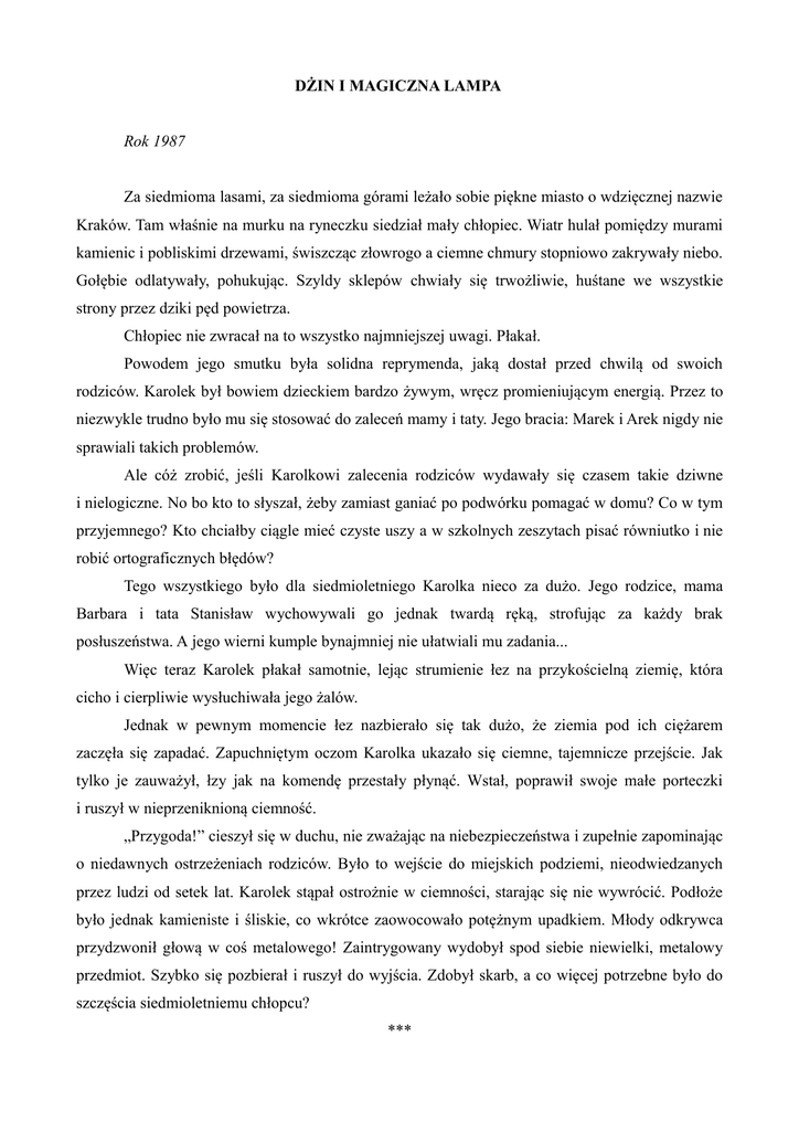 DŻIN I MAGICZNA LAMPA Rok 1987 Za siedmioma lasami, za siedmioma górami leżało sobie piękne miasto o wdzięcznej nazwie Kraków. Tam właśnie na murku na ryneczku siedział mały chłopiec. Wiatr hulał pomiędzy murami kamienic i pobliskimi drzewami, świszcząc złowrogo a ciemne chmury stopniowo zakrywały niebo. Gołębie odlatywały, pohukując. Szyldy sklepów chwiały się trwożliwie, huśtane we wszystkie strony przez dziki pęd powietrza. Chłopiec nie zwracał na to wszystko najmniejszej uwagi. Płakał. Powodem jego smutku była solidna reprymenda, jaką dostał przed chwilą od swoich rodziców. Karolek był bowiem dzieckiem bardzo żywym, wręcz promieniującym energią. Przez to niezwykle trudno było mu się stosować do zaleceń mamy i taty. Jego bracia: Marek i Arek nigdy nie sprawiali takich problemów. Ale cóż zrobić, jeśli Karolkowi zalecenia rodziców wydawały się czasem takie dziwne i nielogiczne. No bo kto to słyszał, żeby zamiast ganiać po podwórku pomagać w domu? Co w tym przyjemnego? Kto chciałby ciągle mieć czyste uszy a w szkolnych zeszytach pisać równiutko i nie robić ortograficznych błędów? Tego wszystkiego było dla siedmioletniego Karolka nieco za dużo. Jego rodzice, mama Barbara i tata Stanisław wychowywali go jednak twardą ręką, strofując za każdy brak posłuszeństwa. A jego wierni kumple bynajmniej nie ułatwiali mu zadania... Więc teraz Karolek płakał samotnie, lejąc strumienie łez na przykościelną ziemię, która cicho i cierpliwie wysłuchiwała jego żalów. Jednak w pewnym momencie łez nazbierało się tak dużo, że ziemia pod ich ciężarem zaczęła się zapadać. Zapuchniętym oczom Karolka ukazało się ciemne, tajemnicze przejście. Jak tylko je zauważył, łzy jak na komendę przestały płynąć. Wstał, poprawił swoje małe porteczki i ruszył w nieprzeniknioną ciemność. „Przygoda!” cieszył się w duchu, nie zważając na niebezpieczeństwa i zupełnie zapominając o niedawnych ostrzeżeniach rodziców. Było to wejście do miejskich podziemi, nieodwiedzanych przez ludzi od setek lat. Karolek stąpał ostrożnie w ciemności, starając się nie wywrócić. Podłoże było jednak kamieniste i śliskie, co wkrótce zaowocowało potężnym upadkiem. Młody odkrywca przydzwonił głową w coś metalowego! Zaintrygowany wydobył spod siebie niewielki, metalowy przedmiot. Szybko się pozbierał i ruszył do wyjścia. Zdobył skarb, a co więcej potrzebne było do szczęścia siedmioletniemu chłopcu? *** Sześcioletnia Kasia mieszkała w Łodzi. W przeciwieństwie do Andrzejka od razu zauważyła kumulujące się na niebie ciemne chmury. Mimo, że oddaleni byli od siebie o prawie 100 km, pogoda była u nich tak samo kapryśna. Kasia patrzała jednak na niebo jak na zbawienie. Deszcz! To najlepsze, co może zdarzyć się sześciolatce! Wystawiła swoje małe rączki, czekając na pierwsze krople. I rzeczywiście, po chwili z nieba zaczął kapać rzęsisty deszcz, zamieniając na chwilę jej Łódź w jeden wielki park wodny. Kasia niemal oszalała ze szczęścia a wraz z nią oszalały jej koleżanki. Nie dajmy się jednak zwieść chwilowemu szaleństwu. Kasię jeszcze jedno różniło od Karolka – była bardzo grzecznym dzieckiem. No, może w liceum trochę sobie wagarowała, doprowadzając tym do rozpaczy swoją mamę Grażynę, ale nie wyprzedzajmy faktów! Póki co, miała sześć lat, aparycję aniołka i wszystkie wakacje spędzała u babci na wsi. I nie miała pojęcia, czym zaskoczy ją los za pięć, dziesięć czy piętnaście lat. Tak naprawdę w ogóle o tym nie myślała! *** – Tu jest jakiś napis! – wyszeptał do siebie zafascynowany Karolek, oglądając ze skupieniem przedmiot, który wyniósł z tajemniczej jaskini. Była to stara, zardzewiała lampa. Dla osoby dorosłej nie przedstawiałaby ona pewnie żadnej większej wartości, tak jak i guz na czole wielkości brzoskwini. Karolek jednak czcił obie te rzeczy niczym święte relikwie. Napis, który dostrzegł na boku lampy, wzbudził w nim dodatkowy entuzjazm. Zerwał z głowy czapkę z daszkiem i energicznie potarł pociemniały metal, żeby odczytać niewyraźne słowa. W tym momencie lampa zadrżała i wypadła chłopcu z rąk. Z jej dzióbka zaczął wydobywać się niebieskawy dym! Karolek wstrzymał oddech. Oddech wstrzymał też grubawy dżin, który usiłował przecisnąć swoje nienawykłe do wysiłku fizycznego ciało przez wąską gardziel lampy. Nasapał się przy tym solidnie. Kiedy wreszcie mu się udało i cały lewitował dumnie nad leżącą w piasku lampą, w ogóle nie zwrócił uwagi na chłopca, który z otwartą buzią i wytrzeszczonymi oczami obserwował każdy jego ruch. Karolek dostał jednak z emocji czkawki i to ona właśnie sprawiła, że oczy ducha zwróciły się w jego stronę. - Jestem dżinnem lampy, mogę spełnić twoje trzy życzenia, mój panie... – dżin wypowiedział swoją formułkę poważnym, głębokim głosem i dyskretnie ziewnął. To było takie nudne! Od tysięcy lat wykonywał tą samą, przewidywalną robotę. Ktoś pocierał lampę, on spełniał trzy życzenia i wracał do jej wnętrza, śpiąc kilka, kilkanaście a nawet kilkaset lat. I tak w kółko! Karolek jednak nie czuł znużenia. Czuł narastającą ekscytację. Ten grubawy stwór mógł spełnić jego trzy życzenia! - Uważaj jednak, panie, na to, czego sobie życzysz! Życzenia mogą przywołać tu złe moce, a tego byśmy na pewno nie chcieli! - przemówił ostrzegawczo dżin, z pewną nieśmiałością spoglądając na swój brzuszek i próbując nie myśleć o tym, ile to minęło już wieków od czasu, w którym walczył z siłami zła. - Eee... Dobra. To ja bym chciał... - Karolek jąkał się i przeciągał, bo to tak naprawdę nie było takie proste. Było tyle rzeczy, których by chciał! - Czekoladę! Mnóstwo czekolady, zawsze! Pod ręką! Niekończące się morze czekolady...! - Tak się st