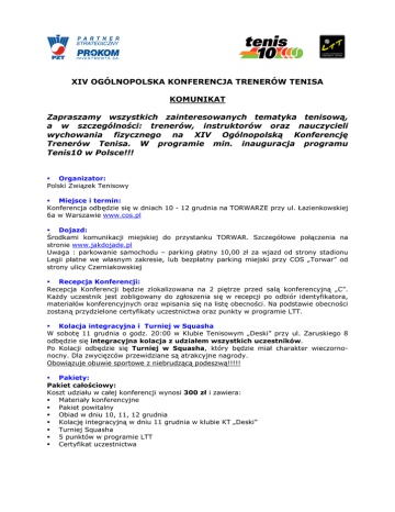 XIV OGÓLNOPOLSKA KONFERENCJA TRENERÓW TENISA KOMUNIKAT Zapraszamy wszystkich zainteresowanych tematyka tenisową, a w szczególności: trenerów, instruktorów oraz nauczycieli wychowania fizycznego na XIV Ogólnopolską Konferencję Trenerów Tenisa. W programie min. inauguracja programu Tenis10 w Polsce!!! Organizator: Polski Związek Tenisowy Miejsce i termin: Konferencja odbędzie się w dniach 10 - 12 grudnia na TORWARZE przy ul. Łazienkowskiej 6a w Warszawie www.cos.pl Dojazd: Środkami komunikacji miejskiej do przystanku TORWAR. Szczegółowe połączenia na stronie www.jakdojade.pl Uwaga : parkowanie samochodu – parking płatny 10,00 zł za wjazd od strony stadionu Legii płatne we własnym zakresie, lub bezpłatny parking miejski przy COS „Torwar” od strony ulicy Czerniakowskiej Recepcja Konferencji: Recepcja Konferencji będzie zlokalizowana na 2 piętrze przed salą konferencyjną „C”. Każdy uczestnik jest zobligowany do zgłoszenia się w recepcji po odbiór identyfikatora, materiałów konferencyjnych oraz wpisania się na listę obecności. Na podstawie obecności zostaną przydzielone certyfikaty uczestnictwa oraz punkty w programie LTT. Kolacja integracyjna i Turniej w Squasha W sobotę 11 grudnia o godz. 20:00 w Klubie Tenisowym „Deski” przy ul. Zaruskiego 8 odbędzie się integracyjna kolacja z udziałem wszystkich uczestników. Po Kolacji odbędzie się Turniej w Squasha, który będzie miał charakter wieczornonocny. Dla zwycięzców przewidziane są atrakcyjne nagrody. Obowiązuje obuwie sportowe z niebrudzącą podeszwą!!!!! Pakiety: Pakiet całościowy: Koszt udziału w całej konferencji wynosi 300 zł i zawiera: Materiały konferencyjne Pakiet powitalny Obiad w dniu 10, 11, 12 grudnia Kolację integracyjną w dniu 11 grudnia w klubie KT „Deski” Turniej Squasha 5 punktów w programie LTT Certyfikat uczestnictwa Pakiet jednodniowy - piątek 10 grudnia Koszt udziału wynosi 120 zł i zawiera: Materiały konferencyjne Pakiet powitalny Obiad Bufet kawowy 1 punkt w programie LTT Certyfikat uczestnictwa Pakiet jednodniowy - sobota 11 grudnia Koszt udziału wynosi 150 zł i zawiera: Materiały konferencyjne Pakiet powitalny Obiad Bufet kawowy Kolacja integracyjna Turniej Squasha 1 punkt w programie LTT Certyfikat uczestnictwa Pakiet jednodniowy - niedziela 12 grudnia Koszt udziału wynosi 100 zł i zawiera: Materiały konferencyjne Pakiet powitalny Obiad Bufet kawowy 1 punkt w programie LTT Certyfikat uczestnictwa Zniżki W ramach programu LTT trenerzy i instruktorzy posiadający licencję PZT otrzymają 50% zniżki za udział w całej konferencji bądź pojedynczym bloku. Studenci AWFów za okazaniem legitymacji studenckiej otrzymają 25% zniżki za udział w całej konferencji bądź pojedynczym bloku. Uczestnicy bez zniżek Trenerzy LTT - 50% zniżki Pakiet całościowy - 300 zł Piątek - 120 zł Sobota - 150 zł Niedziela - 100 zł Zniżki nie obejmują rezerwacji w Hotelu 150 zł 60 zł 75 zł 50 zł Etap. Studenci AWF - 25 % zniżki 225 zł 90 zł 112,50 zł 75 zł Nocleg Istnieje możliwość rezerwacji noclegu przez PZT w Hotelu Etap www.orbis.pl Cena ze zniżką dla PZT: 90 zł śniadaniem 1 osoba/1 doba w pokoju dwuosobowym Ilość pokoi ograniczona. W przypadku zainteresowania prosimy o kontakt z Katarzyną Posłuszny Zgłoszenia: Zgłoszenia na osobnym formularzu zgłoszeniowym wraz z potwierdzeniem wpłaty na dany pakiet i ew. nocleg prosimy przesyłać: Fax: 22 621 80 01 lub Email: [email protected] Kontakt: Katarzyna Posłuszny tel. 22 629 26 21 wew.111 Termin zgłoszeń: 30 listopada 2010r. Zgłoszenia po terminie dodatkowo +25% ceny.