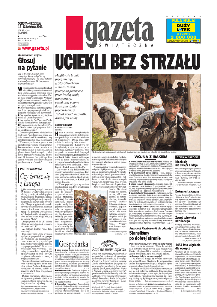 12-04-2.qxd 2003-04-11 21:27 Page 1 R NAKŁAD 481 TYS. 2 K L A M A PULA HULA! SOBOTA–NIEDZIELA 12–13 kwietnia 2003 NR 87. 4298 E ____ zł _____ zł W TYM 7% VAT W SOBOTĘ 3 000 000 REDAKTOR PROWADZĄCY ŁUKASZ RAMLAU PRZEWIDYWANA PULA NA WYGRANE I STOPNIA WYDAJE AGORA SA 12995155 NUMER INDEKSU ______ www.gazeta.pl Już w Wielki Czwartek Sejm zdecyduje, kiedy odbędzie się referendum unijne i na jakie pytanie w nim odpowiemy. Możesz o tym współdecydować Ceny „Gazety Wyborczej”: A – 1,09 ¤; B – 1,3 ¤; CZ – 25 CZK; D – 1,55 ¤; DK – 10 DKK; GB – 1,1 GBP; GR – 1,32 ¤; LT – 4 LTL; S – 16 SEK; CDN – 2,3 CAD+GST; USA – 1,5 USD; SK – 30 SKK; IT – 1,45 ¤; H – 390 HUF; CRO – 12 KN; SLO – 290 SIT czoraj minister ds. europejskich Lech Nikolski w porozumieniu z marszałW kiem Sejmu Markiem Borowskim ogłosił sondaż na temat pytań w referendum. Każdy może wziąć w nim udział. Wystarczy wejść na stronę internetową kancelarii premiera (http://kprm.gov.pl) i wybrać jedno z proponowanych pytań: Ú Czy wyrażasz zgodę na ratyfikację traktatu dotyczącego przystąpienia Rzeczypospolitej Polskiej do Unii Europejskiej? Ú Czy wyrażasz zgodę na przystąpienie Polski do Unii Europejskiej? Ú Czy zgadza się Pan/Pani, aby Polska została członkiem Unii Europejskiej? Ú Czy zgadzasz się, aby Prezydent RP ratyfikował traktat o przystąpieniu Polski do Unii Europejskiej? Zbieranie opinii potrwa od niedzieli do środy. Min. Nikolski przekaże wyniki sondażu marszałkowi Borowskiemu, który przedstawi je posłom przed głosowaniem. W naszym portalu www.gazeta.pl możesz głosować i wyrazić opinię już teraz! Do wyszukiwarki wpisz „pytania w referendum-sondaż” i zagłosuj. Zabierz głos na forum. Opinie naszych czytelników i internautów przekażemy do Biura ds. Referendum Europejskiego Kancelarii Premiera. Najciekawsze głosy przedstawimy w „Gazecie”. KID PIOTR PACEWICZ Czy żenisz się z Europą N ieczęsto mamy okazję kształtować historię. W referendum owszem – każdy poczuje, jak pod długopisem przepływają mu dzieje kraju, sięgając daleko dalej niż życie twoje czy moje, dalej niż życie naszych dzieci czy wnuków. Dlatego w pytaniu nie zawadzi odrobina uroczystego tonu. Z czterech propozycji wolę więc „czy wyrażasz zgodę” niż potoczne „czy zgadzasz się”. Tak jak lepiej brzmi „czy bierzesz sobie za żonę tę oto Alicję” niż „czy się żenisz z Alicją”. „Przystąpienie RP do UE” trafniej oddaje powagę chwili niż „zostawanie członkiem UE”. Ale żadnych skrótów. Pełne, dumne nazwy! Proponuję więc: „Czy wyrażasz zgodę na przystąpienie Rzeczypospolitej Polskiej do Unii Europejskiej?”. A na pewno nie chcę „wyrażać zgody na ratyfikowanie traktatu dotyczącego przystąpienia itd.”. To – z przeproszeniem Pana Prezydenta – jakbyśmy podczas ślubu „wyrażali zgodę na związanie rąk stułą” albo „na podpisanie dokumentu o zawartym związku małżeńskim”. To referendum ma wyrazić wolę narodu. Aby tak się stało, do urn musi pójść połowa Polaków. Jeśli pójdzie, powiedzmy, 49 procent, zamiast historycznej chwili będą przepychanki w parlamencie. Dlatego powtarzam: ułatwcie, panie i panowie posłowie, udział w referendum. Dajcie nam dwa dni, nie żałujcie narodowi tej soboty. Ů Sejm debatował wczoraj nad traktatem akcesyjnym z Unią i przyjął uchwałę o suwerenności polskiego prawodawstwa w dziedzinie moralności i kultury – s. 4 UCIEKLI BEZ STRZAŁU Mogliby się bronić przez miesiąc, gdyby tylko chcieli – mówi Hassan, patrząc na porzucone przez iracką armię transportery, czołgi oraz gotowe do strzału działo przeciwlotnicze. Jednak uciekli bez walki. Kirkuk jest wolny KORESPONDENCJA ROBERT STEFANICKI KIRKUK assan w koszulce z amerykańską flagą pędzi jak wariat do Kirkuku i nieH mal podskakuje z radości na siedzeniu 16-letniej toyoty. – Dzisiaj czuję, jakby należał do mnie cały świat – mówi. Wczoraj droga Irbil – Kirkuk była chyba najbardziej uczęszczaną arterią w całym Iraku. Kurdyjscy żołnierze, peszmergowie, na posterunkach drogowych W Kirkuku trwa szabrowanie wojskowych magazynów, ale kradnie się tylko to, co należało do reżimu tylko machali rękami, próbując rozładować korek. Jakże zabronić ludziom po- z radości – śmieje się Abdullah. FunkcjoWOJNA Z IRAKIEM DZIEŃ W SKRÓCIE wrotu do domu – ustawić blokady, za- nariusze partii Baas i członkowie wiernych trzymywać samochody pod lufami kara- jej formacji zbrojnych uciekli ponoć Ú Mosul Amerykanie zajęli bez wystrzału. Witając ich, Niech się mieszkańcy wylegli na ulice. Tłum wdarł się do banku i niszbinów, jak to robili Irakijczycy? I po co? w stronę Tikritu. nie święci 1 Maja Z supermarketu w centrum Kirkuku wy- czył banknoty z wizerunkiem Saddama. Amerykanie nadal Przecież Kirkuk to miasto Kurdów. polują na wysokich funkcjonariuszy reżimu. Wczoraj zginął OPZZ nie zorganizuje w tym roku Gdy w 1991 r. siły Saddama Husajna dobywają się kłęby siwego, gryzącego dy- Barzan al Tikriti, przyrodni brat Saddama – s. 6 manifestacji. stłumiły antyrządowe powstanie Kur- mu. Od zaplecza trwa rabunek. W tym zło- Ú Na ostatni punkt obrony irackiej – Tikrit, rodzinne pierwszomajowych – Sytuacja na rynku pracy jest tak dów, tysiące mieszkańców Kirkuku mu- dziejstwie jest jednak pewna uczciwość. miasto Saddama – będzie nacierać amerykańska 4. Dy- trudna, że nie ma się z czego ciesiało uciekać na północ. Kiedy dowie- Nikt nie rusza własności prywatnej – tyl- wizja Zmechanizowana. Jest wyposażona w sprzęt elek- szyć – tłumaczy szef OPZZ Madzieli się w czwartek, że Kirkuk padł, ko to, co należało do znienawidzonych troniczny do prowadzenia ognia i łączności, którego nie ciej Manicki. – s. 7 władz. Cóż, nie ich wina, że do wojska, ma żadna inna armia świata ruszyli do domu. Ro