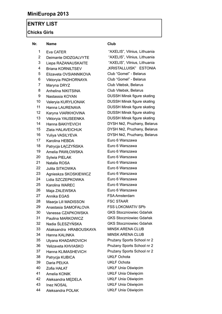 MiniEuropa 2013 ENTRY LIST Chicks Girls Nr. 1 2 3 4 5 6 7 8 9 10 11 12 13 14 15 16 17 18 19 20 21 22 23 24 25 26 27 28 29 30 31 32 33 34 35 36 37 38 39 40 41 42 43 44 Name Club Eva CATER Deimante DIDZGALVYTE Liepa RAZANAUSKAITE Briana KORNILTSEV Elizaveta OVSIANNIKOVA Viktoryia PADHORNAYA Maryna DRYZ Anhelina NIKITSINA Nastassia KOYAN Valeryia KURYLIONAK Hanna LAURENAVA Karyna VIARKHOVINA Viktoryia YAUSEENKA Hanna BAKIYEVICH Zlata HALAVEICHUK Yuliya VASILYEVA Karolina HEBDA Patrycja ŁĄCZYŃSKA Amelia PAWŁOWSKA Sylwia PIELAK Natalia ROSA Julita SITKOWKA Agnieskza SKOSKIEWICZ Lidia SZCZEPKOWKA Karolina WAREC Maja ZALEWSKA Annika EGAS Maarja Lill MADISSON Anastasia SAMOFALOVA Vanessa CZAPKOWSKA Paulina MARKOWICZ Nadia ŚLESZYŃSKA Aliaksandra HRABOUSKAYA Hanna KALINKA Ulyana KHADAROVICH Yelizaveta KHVIASKO Hanna KLIMASHEVICH Patrycja KUBICA Daria PEŁKA Zofia HAŁAT Amelia KONIK Aleksandra MĘDELA Inez NOSAL Aleksandra POLAK “AXELIS”, Vilnius, Lithuania “AXELIS”, Vilnius, Lithuania “AXELIS”, Vilnius, Lithuania „KRISTALLUISK” ESTONIA Club “Gomel” - Belarus Club “Gomel” - Belarus Club Vitebsk, Belarus Club Vitebsk, Belarus DUSSH Minsk figure skating DUSSH Minsk figure skating DUSSH Minsk figure skating DUSSH Minsk figure skating DUSSH Minsk figure skating DYSH №2, Pruzhany, Belarus DYSH №2, Pruzhany, Belarus DYSH №2, Pruzhany, Belarus Euro 6 Warszawa Euro 6 Warszawa Euro 6 Warszawa Euro 6 Warszawa Euro 6 Warszawa Euro 6 Warszawa Euro 6 Warszawa Euro 6 Warszawa Euro 6 Warszawa Euro 6 Warszawa FSA Amsterdam FSC STAAR FSS LOKOMATIV SPb GKS Stoczniowiec Gdańsk GKS Stoczniowiec Gdańsk GKS Stoczniowiec Gdańsk MINSK ARENA CLUB MINSK ARENA CLUB Prużany Sports School nr 2 Prużany Sports School nr 2 Prużany Sports School nr 2 UKŁF Ochota UKŁF Ochota UKŁF Unia Oświęcim UKŁF Unia Oświęcim UKŁF Unia Oświęcim UKŁF Unia Oświęcim UKŁF Unia Oświęcim 45 46 47 Dorota ZAWADZKA Margaryta KOLIESNIK Violetta MAKHANOK UKŁF Unia Oświęcim UKRAINE UKRAINE MiniEuropa 2013 ENTRY LIST Chicks Boys Nr. 1 2 3 4 5 6 7 8 Name Club Andrey LAGAVIK Andrei MIKHALCHUK Łukasz ŻABICKI Zahar GATILOV Uladzimir HAURYLAU Jakub ROSŁANIEC Paweł JAKUBIEC Jakub LOFEK DUSSH Minsk figure skating DUSSH Minsk figure skating Euro 6 Warszawa FSS LOKOMATIV SPb MINSK ARENA CLUB UKŁF Ochota UKŁF Unia Oświęcim UKŁF Unia Oświęcim MiniEuropa 2013 ENTRY LIST Cubs 2004 Girls Nr. 1 2 3 4 5 6 7 8 9 10 11 12 13 14 15 16 17 18 19 20 21 22 23 24 25 26 27 28 29 30 31 32 33 34 35 36 37 38 39 40 Name Club Veronika BAŠKIRJOVA Elina NOGU Kseniya KAZHAMIAKINA Valeryia KRANTOUSKAYA Gulianna LASHKEVICH Kseniya LIASNEUSKAYA Varvara LUKASHENKA Hanna MIKULICH Katsiaryna IVANOVA Valeryia MAKAREVICH Alesia KALESNIKAVA Nikoletta LEONOVA Aliaksandra NAVITSKAYA Ulyana YURKEVICH Anastasiya PASKO Marta JÓWKO Zofia MARSZAŁŁ Alicja SMAGA Sam VAN DER KOOI Karmen IVANOVA Sofija KUZNETSOVA Elisaveta PETROVA Emilia HALMAN Julia KRZYŻANOWSKA Martyna PAŁUBICKA Aleksandra PAZIEWSKA Aleksandra WIŚNIAROWSKA Michelle KNOSCH Tova LANTZ-HARARI Mandalay MALMBERG Signe THORN Yekatsiaryna HAURYLOVA Darya KAPSKAYA Varvara ZANKOVICH Karyna MARUFENKA Vesta NASKO Patricija BARTKEVIIUTE Nicola ADAMCZYK Tatiana KASPRZYK Oliwia PYTKOWICZ „KRISTALLUISK” ESTONIA „KRISTALLUISK” ESTONIA Club Gomel Skating Union of Belarus Club Gomel Skating Union of Belarus Club Gomel Skating Union of Belarus Club Gomel Skating Union of Belarus Club Gomel Skating Union of Belarus Club Gomel Skating Union of Belarus Club Vitebsk, Belarus Club Vitebsk, Belarus DUSSH Minsk figure skating DUSSH Minsk figure skating DUSSH Minsk figure skating DUSSH Minsk figure skating DYSH №2, Pruzhany, Belarus Euro 6 Warszawa Euro 6 Warszawa Euro 6 Warszawa FSA Amsterdam FSC STAAR FSC STAAR FSS LOKOMATIV SPb GKS Stoczniowiec Gdańsk GKS Stoczniowiec Gdańsk GKS Stoczniowiec Gdańsk GKS Stoczniowiec Gdańsk GKS Stoczniowiec Gdańsk KKSUNDBYBERG, Szwecja KKSUNDBYBERG, Szwecja KKSUNDBYBERG, Szwecja KKSUNDBYBERG, Szwecja MINSK ARENA CLUB MINSK ARENA CLUB MINSK ARENA CLUB Prużany Sports School nr 2 Prużany Sports School nr 2 Twizlas, Lithuania UKŁF Unia Oświęcim UKŁF Unia Oświęcim UKŁF Unia Oświęcim MiniEuropa 2013 ENTRY LIST Cubs 2003 Girls Nr. 1 2 3 4 5 6 7 8 9 10 11 12 13 14 15 16 17 18 19 20 21 22 23 24 25 26 27 28 29 30 31 Name Club Polina ZAGZIN Viola SERGEJEVA Katryna BIRGELAITE Dinara RUDALEVICIUTE Daria NIKITINA Anhelina KAROYKA Avastasiya SALAYOVA Yana BARAZNA Aliaksandra CHEPELEVA Alina DZERKACH Aliaksandra HAURYLKINA Emilija IVASKAITE Sofiya KOYAN Kseniya KUDRYASHOVA Ulyana LAURENAVA Marharyta PAKHOLKA Nastassia PUSHKAREVICH Aliaksandra RAZINA Maryia SHTAIDA Lizaveta SVORAB Lizaveta MALINOUSKAYA Yauheni PUZANAU Paula PIECHOWICZ Tessel CLERCX Amelia RAMS Sigrid TELLISKIVI Kristsina BIOKH Ksenia TELESHOVA Anastasia Anita ISSAJEVA Alicja ROGALSKA Sofia VOROBEY “AXELIS”, Vilnius, Lithuania „KRISTALLUISK” ESTONIA Baltu Ainiai (Lithuania) Club "SVAJA" Club “Gomel” - Belarus Club Vitebsk, Belarus Club Vitebsk, Belarus DUSSH Minsk figure skating DUSSH Minsk figure skating DUSSH Minsk figure skating DUSSH Minsk figure skating DUSSH Minsk figure skating DUSSH Minsk figure skating DUSSH Minsk figure skating DUSSH Minsk figure skating DUSSH Minsk figure skating DUSSH Minsk figure skating DUSSH Minsk figure skating DUSSH Minsk figure skating DUSSH Minsk figure skating DYSH №2, Pruzhany, Belarus DYSH №2, Pruzhany, Belarus Euro 6 Warszawa FSA Amsterdam GKS Stoczniowiec Gdańsk KKSUNDBYBERG, Szwecja MINSK ARENA CLUB MKOU DOD Bobrovskaya Talveunistus Estonia UKŁF Unia Oświęcim MiniEuropa 2013 ENTRY LIST Cubs Boys Nr. 1 2 3 4 5 6 7 8 Name Club Kirill KRAVTŠUK Pavel BUYAVETS Yahor KHLAPKOU Uladzislau SYTSIK Andrey TSELUIKO Nikolaj KOZLOV Yauheni PUZANAU Dzianis KAVALEVICH „KRISTALLUISK” ESTONIA Club Vitebsk, Belarus DUSSH Minsk figure skating DUSSH Minsk figure skating DUSSH Minsk figure skating DYSH №2, Pruzhany, Belarus DYSH №2