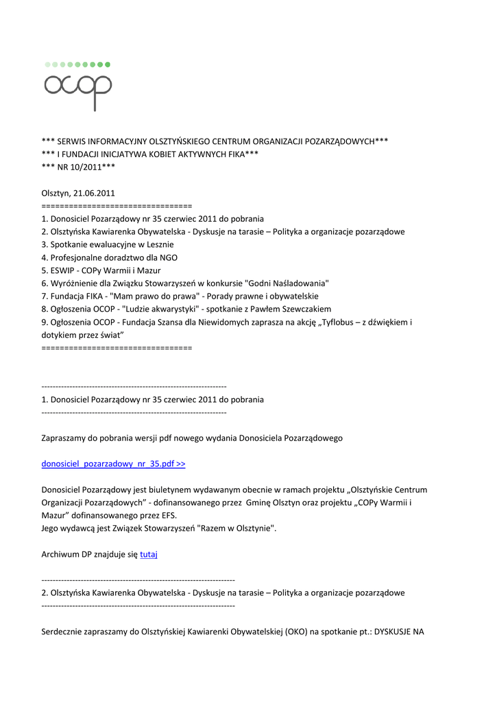 *** SERWIS INFORMACYJNY OLSZTYOSKIEGO CENTRUM ORGANIZACJI POZARZĄDOWYCH*** *** I FUNDACJI INICJATYWA KOBIET AKTYWNYCH FIKA*** *** NR 10/2011*** Olsztyn, 21.06.2011 ================================= 1. Donosiciel Pozarządowy nr 35 czerwiec 2011 do pobrania 2. Olsztyoska Kawiarenka Obywatelska - Dyskusje na tarasie – Polityka a organizacje pozarządowe 3. Spotkanie ewaluacyjne w Lesznie 4. Profesjonalne doradztwo dla NGO 5. ESWIP - COPy Warmii i Mazur 6. Wyróżnienie dla Związku Stowarzyszeo w konkursie "Godni Naśladowania" 7. Fundacja FIKA - "Mam prawo do prawa" - Porady prawne i obywatelskie 8. Ogłoszenia OCOP - "Ludzie akwarystyki" - spotkanie z Pawłem Szewczakiem 9. Ogłoszenia OCOP - Fundacja Szansa dla Niewidomych zaprasza na akcję „Tyflobus – z dźwiękiem i dotykiem przez świat” ================================= -----------------------------------------------------------------1. Donosiciel Pozarządowy nr 35 czerwiec 2011 do pobrania -----------------------------------------------------------------Zapraszamy do pobrania wersji pdf nowego wydania Donosiciela Pozarządowego donosiciel_pozarzadowy_nr_35.pdf >> Donosiciel Pozarządowy jest biuletynem wydawanym obecnie w ramach projektu „Olsztyoskie Centrum Organizacji Pozarządowych” - dofinansowanego przez Gminę Olsztyn oraz projektu „COPy Warmii i Mazur” dofinansowanego przez EFS. Jego wydawcą jest Związek Stowarzyszeo "Razem w Olsztynie". Archiwum DP znajduje się tutaj --------------------------------------------------------------------2. Olsztyoska Kawiarenka Obywatelska - Dyskusje na tarasie – Polityka a organizacje pozarządowe --------------------------------------------------------------------Serdecznie zapraszamy do Olsztyoskiej Kawiarenki Obywatelskiej (OKO) na spotkanie pt.: DYSKUSJE NA TARASIE – POLITYKA A ORGANIZACJE POZARZĄDOWE, które odbędzie się 28 czerwca (wtorek) o godz. 17.00 w Olsztyoskim Centrum Organizacji Pozarządowych ul. Tarasa Szewczenki 1 Olsztyoskie Kawiarenki Obywatelskie to inicjatywa na rzecz rozwoju debaty publicznej na ważne dla społeczności lokalnej tematy. Są okazją do swobodnej, merytorycznej i konstruktywnej wymiany przemyśleo oraz poglądów dotyczących naszego miasta i regionu, tożsamości lokalnej, przestrzeni publicznej oraz problemów społecznych, gospodarczych i rozwojowych. Ich celem jest rozwój naszego lokalnego społeczeostwa obywatelskiego, najważniejszego fundamentu nowoczesnej demokracji. Zobacz więcej >> Do dyskusji na temat współistnienia polityki i organizacji pozarządowych, relacji, przenikania się obu pozornie odległych płaszczyzn, zapraszamy po raz pierwszy zarówno przedstawicieli organizacji pozarządowych, jak i najważniejszych olsztyoskich mediów. Liczymy na to, że wnioski z dyskusji będą mogły stad się elementem dalszych działao, celów organizacji pozarządowych. Jednocześnie mogą byd początkiem głębszej analizy problemu i szerszej, publicznej dyskusji na ten temat. Debata będzie nagrana i umieszczona na stronie internetowej OCOP w formie pliku mp3. Tematy paneli dyskusyjnych: Polityka a organizacje pozarządowe Czy organizacje pozarządowe powinny wejśd do polityki? Organizacje pozarządowe rozliczające polityków? Moderator: Marek Jarmołowicz W spotkaniu wezmą udział przedstawiciele olsztyoskich mediów: Radio Zet, Radio Planeta FM, Radio Olsztyn, Radio ESKA, Radio Plus, Radio UWM FM, Gazeta Olsztyoska, Gazeta Wyborcza, Telewizja Olsztyn, Telewizja Polska Obowiązuje rezerwacja miejsc Zgłoszenia mailem na adres: [email protected] Dodatkowe informacje: Olsztyoskie Centrum Organizacji Pozarządowych ul. Tarasa Szewczenki 1, 10-274 Olsztyn [email protected] tel. 503 680 500 Współorganizatorzy: Związek Stowarzyszeo "Razem w Olsztynie" prowadzący Olsztyoskie Centrum Organizacji Pozarządowych Forum Dialogu Publicznego Spotkanie jest współorganizowane w ramach projektu „COPy Warmii i Mazur. Sied Centrów Organizacji Pozarządowych Województwa Warmiosko-Mazurskiego” przez Związek Stowarzyszeo „Razem w Olsztynie”. --------------------------------------------------------------------3. Spotkanie ewaluacyjne w Lesznie --------------------------------------------------------------------W dniach 08-09.06.11 r. w Lesznie odbyło się spotkanie robocze obejmujące samoewaluację Olsztyoskiego Centrum Organizacji Pozarządowych oraz opracowanie Planu Rozwoju Związku Stowarzyszeo „Razem w Olsztynie” pod kątem prowadzenia OCOP. W ciągu tych dwóch dni w spotkaniu wzięło udział 15 osób w tym: pracownicy Centrum, przedstawiciele organizacji pozarządowych oraz Rady Powiatu Olsztyoskiego i Urzędu Miasta, którzy odpowiedzieli na zaproszenie. Celem badania ewaluacyjnego było przeprowadzenie procesu samooceny 5 obszarów funkcjonowania OCOP przy pomocy Matrycy Podstawowej „Narzędzia Samoewaluacji” i zdiagnozowanie, w której fazie rozwoju dla poszczególnych komponentów w tych obszarach jest Organizacja. Ewaluacja obejmowała analizę poniższych 5 obszarów aktywności Centrum: 1. Zarządzanie strategiczne 2. Zarządzanie ludźmi 3. Zarządzanie relacjami z otoczeniem 4. Zarządzanie operacyjne 5. Zarządzanie finansami W ramach ewaluacji analizowano też Standard OCOP, który opracowano w roku 2005 i który wymagał już nowelizacji (aktualizacja misji, rozszerzenie działao na powiat olsztyoski). Podczas drugiej części spotkania na podstawie wniosków wypływających z samoewaluacji i analizy „Strategii rozwoju sektora organizacji pozarządowych w Olsztynie”, zostały wyznaczone ramy „Planu Rozwoju OCOP na lata 2011-2013”. Opracowano wyzwania zarówno pod kątem zarządzania OCOP jak i pod kątem usług świadczonych klientom Centrum. Spotkanie zorganizował Związek Stowarzyszeo „Razem w Olsztynie” w ramach projektu „COPy Warmii i Mazur. Sied Centrów Organizacji Pozarządowych Województwa Warmiosko-Mazurskiego”. ----------------------------------------------------