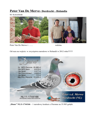 Peter Van De Merve- Dordrecht - Holandia M. Kościelniak Peter Van De Merwe i …… rodzina. Od razu na wejście: w zwycięstwa narodowe w Holandii w 2012 roku!!!!!!! „Diane” NL11-1744166 – 1 narodowy konkurs z Peronne na 35.985 gołębi. „Shane” NL11-1744271 – 1 narodowy konkurs z Argenton 624 km na 10.432 gołębie. „Arie” NL12-1620214 – 1 narodowy konkurs (sektor-2) z Sens na 12.373 gołębie. Te zdjęcia przedstawiają zwycięzców narodowych tylko w 2012 roku. Sam ten fakt świadczy o jakości i sile tej hodowli. Zwarzywszy na młody jeszcze wiek Petera można się spodziewać, że jeszcze wiele przed nim. Potrzeba do takich wyników nie tylko odpowiedniego materiału ale i umiejętności, by wygrywać w tak silnej konkurencji. Tym bardziej należą się słowa uznania. R o k 2012 w det ala c h: 1 N P O ( w H ol andii) i w pro win cji. N a obe cny cz a s 15 x 1 n arodo wy konkur s N P O. W NPO niesamowicie 1-ty z Peronne na 35.985 gołębi, 1. w NPO z Argenton 10.432 na ptaki i 1 w NPO Sens na 14.753 ptaki. On stoi samotnie w sali sławy Holandii i wśród hodowców prowincjonalnych. Jego gołębie stają się coraz bardziej popularne. W ciągu ostatnich 9 sezonów zdobył 23 x 1-sze nagrody w stosunku do średniej 22.137 ptaków. Statystyki pokazują, że ma na swoim koncie 74 konkursy narodowe w pierwszej dziesiątce, a średnia ilość konkurentów to liczba 17.000. Z tego 47 nagród jest w pierwszych 5 gołębiach krajowych. Nic więc dziwnego, że jego gołębie zaczynają się liczyć w skali światowej. Nabywców jest coraz więcej, no i gołębie te osiągają znaczne sumy na aukcjach. Teraz trochę wyników z poszczególnych lotów. Duffel 435 gołębi- 1-2-3-4-5-6-7-9-10-11-12-13-15-17-18-19-20-21-22-23-24-25-26-27-28-29 Duffel 4,286 gołębi- 3-4-5-13-14-15-16-18-20-23-33-35-38-74-75-77-78-82-83-84-85 itd. 80/116 Nijvel 667 gołębi- 1-2-3-4-5-6-7-8-11-12-13-16-17-18-19-21-22-24-25-26-28-29-30 itd. Nijvel 2,484 gołębi- 1-2-3-6-7-12-13-14-15-38-39-40-46-47-50-54-70-90 itd. 93/115 Lille-lesquin 540 gołębi- 1-2-3-4-5-6-7-8-9-10-11-12-13-15-16-17-18-19-20-21-22 itd. Lille-lesquin 4,202 gołębi- 3-5-8-9-13-14-16-19-24-29-30-32-33-37-39-41-43-51-52-53-55 itd. 75/106 Lille-lesquin 16,435 gołębi- b 7-9-13-14-19-21-24-31-42-56-61-65-66-71-76-78-83 itd. 75/106 NPO 7-9-13-14-19-21-24-31-42-56-61-65-66-71-76-78-83 itd. 75/106 Peronne 601 gołębi- 1-2-3-5-6-7-9-10-11-18-19-20-21-22-26-27-28 itd. Peronne 2,271 gołębi- b 2-3-5-17-18-19-27-28-33-54-55-57-58-66-68-75-78-79-87 itd. 66/111 Peronne 5,265 gołębi- b 1-2-4-6-10-11-13-14-16-17-23-29-32-33-34-38-46-62-64-66-74-76 itd. 84/102 Peronne 35,985 gołębi- 1e NPO Peronne 19,214 gołębi- 1-6-8-14-19-22-24-25-28-29-45-56-65-66-70-86-98 itd. 83/102 NPO 1-6-8-14-19-22-24-25-28-29-45-56-65-66-70-86-98 itd. 83/102 Nanteuil 562 gołębi- 1-3-4-5-7-9-10-11-12-13-14-17-18-19-20-21-22 itd. 58/102 Peronne 377 gołębi- 1-2-3-4-6-7-9-10-11-13-14-16-17-18-19-20-21-22-23-25 itd. 64/81 Peronne 3,223 gołębi- 2-7-8-9-24-25-45-47-48-60-61-76-77-80-84-85-96 itd. 65/81 Mantes 341 gołębi- 2-4-5-6-8-9-10-11-12-14-17-18-20-21-22-25-27-28-29-30-31 itd. Mantes 2,808 gołębi- 4-8-12-13-29-30-39-47-50-61-77-87-109-113-115 itd. 47/79 Chateaurox 1,541 gołębi- 1-2-3-70-138-139 itd. 14/20 Chateaurox 9,612 gołębi- NPO 7-11-12 itd. 14/20 Argenton 1,175 gołębi- 1-3-5-8-11-15-16-19-23-26-56-61-64-68 itd. 75/34 Argenton 10,432 gołębi- NPO 1-16-29-46-54-77-78-90 itd. 75/34 Nanteuil 751 gołębi- 1-2-4-7-17-19-22-24-26-33-34 itd. 71/36 Nijvel 1,603 gołębi- 3-12-14-18-20-28-30-31-42-44-57 itd. Peronne 3,861 gołębi- 3-10-13-29-36-42-46-65-79-84-106-109-110-119 itd. 111/54 Peronne 1,239 gołębi- 7-13-15-21-25-26-38-67-77-86-88 itd. 38/22 Nijvel 1,795 gołębi- 1-2-5-15-22-24-29-30-34-39-41-60-66-72-74-80 itd. Ruffec 416 gołębi- 1-5-9-10-20-24-32-35-37-39 itd. Sens 13,373 gołębi- 1e NPO sector 2 Sens 13,373 gołębi- 1-9-37-39-41-42-49-65-82-135-137-173-182 itd. 93/67 Sens 1,359 gołębi- 1-3-7-8-9-10-13-16-19-22-24-26-28-34-36-39-40-41-45-47-50 itd. 93/64 Pommeroeul 2,135 gołębi- 2-3-5-6-8-9-11-12-14-16-17-19-22-39-48-64-66 itd. 46/43 Nijvel 2,991 gołębi- 2-4-5-7-10-15-21-30-31-42-54-68-75-83-89-90-91. 8 najszybszy z 24,000 gołębi w prowincji Peronne 9,695 gołębi- 1-3-4-5-6-7-9-12-14-15-17-19- itd. Peter Van De 2013Merwe Chateaudun 1.049 gołębi 1-2-3-5-6-8-13-16-17-21-31-33 itd. 27/27 Chateaudun 11.572 gołębie NPO 1-5-6-18-24-44-81-119-131-159 itd. 27/27 Pommeroeul 4.441 gołębie 1-2-5-9-16-19-20-21-22-25-34-41-45-46-58-60-67-68 itd. 130/97 Pommeroeul 1 i 2 najszybsze z 27.000 gołębi Sens 28.413 gołębi NPO 1-27-28-29-40-65-76-97-103-115-129-144-158-170 itd. 106/50 Sens 3.246 gołębi 1-9-10-11-14-23-24-29-31-36-43-51-52-55-61-66-72 itd. Peronne 3.634 gołębi 3-4-9-10-12-13-18-19-22-23-24-26-35-38-44-48-50 itd. 95/76 Peronne 11.930 gołębi Prov 8-9-18-20-24-28-34-35-39-40-43-61-73 itd. Peronne 5.184 Peronne 19.278 gołębi Prov 10-13-24-42-46-50-58-69-75-95 itd. Ronquiers 2.082 gołębie 2-8-9-11-12-16-17-21-22-24-25-26-27-28-30 itd. 128/94 Nanteuil 4.666 3-12-14-15-17-24-30-31-36-37-38-54-56-57-60 128/68 Nanteuil 17.786 gołębi 6-33-38-39-45-81-95-96 Meaux 12.420 gołębi 6 Peronne 2.817 gołębi 1-10-14-15-18-39-42-44-57-74-75-76-97 itd Peronne 9.776 gołębi 4-28-33-34-43-105-120-122 itd 79/63 Bourges 1.154 gołębi 2-4-28-29-42-50-69-71-91-93-94-95 itd. 27/16 Bourges 7.586 gołębi NPO - 3 -30 gołębi gołębi 2-3-6-10-11-12-14-20-24-32-33-35-36-39-46-47-48-50-53-54-55 itd. 128/101 Sam Peter ma na swoim koncie: 1991 1. narodowy NPO Etampes 27.698 gołębi 1991 1. narodowy NPO Orleans 11.244 gołębie 1994 1. narodowy NPO Orleans 17.150 gołębi 1995 1. narodowy NPO Ruffec 6.150 gołębi -Speedy 2000 1. narodowy NPO Chateauroux 10.789 gołębi 2001 1. narodowy NPO Creil 22.725 gołębi –Joyce 96 itd. 79/61 2002 1. narodowy NPO Sourdun 18.339 gołębi -Wonder Girl 2006 1. narodowy NPO Chantilly 30.07