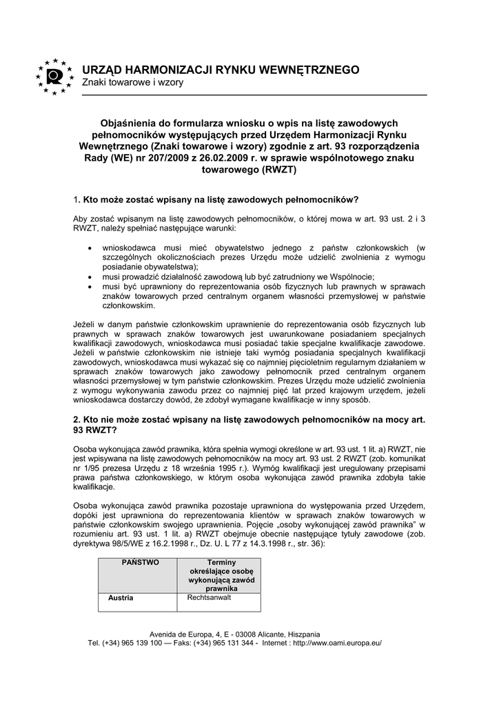 URZĄD HARMONIZACJI RYNKU WEWNĘTRZNEGO Znaki towarowe i wzory Objaśnienia do formularza wniosku o wpis na listę zawodowych pełnomocników występujących przed Urzędem Harmonizacji Rynku Wewnętrznego (Znaki towarowe i wzory) zgodnie z art. 93 rozporządzenia Rady (WE) nr 207/2009 z 26.02.2009 r. w sprawie wspólnotowego znaku towarowego (RWZT) 1. Kto może zostać wpisany na listę zawodowych pełnomocników? Aby zostać wpisanym na listę zawodowych pełnomocników, o której mowa w art. 93 ust. 2 i 3 RWZT, należy spełniać następujące warunki: • • • wnioskodawca musi mieć obywatelstwo jednego z państw członkowskich (w szczególnych okolicznościach prezes Urzędu może udzielić zwolnienia z wymogu posiadanie obywatelstwa); musi prowadzić działalność zawodową lub być zatrudniony we Wspólnocie; musi być uprawniony do reprezentowania osób fizycznych lub prawnych w sprawach znaków towarowych przed centralnym organem własności przemysłowej w państwie członkowskim. Jeżeli w danym państwie członkowskim uprawnienie do reprezentowania osób fizycznych lub prawnych w sprawach znaków towarowych jest uwarunkowane posiadaniem specjalnych kwalifikacji zawodowych, wnioskodawca musi posiadać takie specjalne kwalifikacje zawodowe. Jeżeli w państwie członkowskim nie istnieje taki wymóg posiadania specjalnych kwalifikacji zawodowych, wnioskodawca musi wykazać się co najmniej pięcioletnim regularnym działaniem w sprawach znaków towarowych jako zawodowy pełnomocnik przed centralnym organem własności przemysłowej w tym państwie członkowskim. Prezes Urzędu może udzielić zwolnienia z wymogu wykonywania zawodu przez co najmniej pięć lat przed krajowym urzędem, jeżeli wnioskodawca dostarczy dowód, że zdobył wymagane kwalifikacje w inny sposób. 2. Kto nie może zostać wpisany na listę zawodowych pełnomocników na mocy art. 93 RWZT? Osoba wykonująca zawód prawnika, która spełnia wymogi określone w art. 93 ust. 1 lit. a) RWZT, nie jest wpisywana na listę zawodowych pełnomocników na mocy art. 93 ust. 2 RWZT (zob. komunikat nr 1/95 prezesa Urzędu z 18 września 1995 r.). Wymóg kwalifikacji jest uregulowany przepisami prawa państwa członkowskiego, w którym osoba wykonująca zawód prawnika zdobyła takie kwalifikacje. Osoba wykonująca zawód prawnika pozostaje uprawniona do występowania przed Urzędem, dopóki jest uprawniona do reprezentowania klientów w sprawach znaków towarowych w państwie członkowskim swojego uprawnienia. Pojęcie „osoby wykonującej zawód prawnika” w rozumieniu art. 93 ust. 1 lit. a) RWZT obejmuje obecnie następujące tytuły zawodowe (zob. dyrektywa 98/5/WE z 16.2.1998 r., Dz. U. L 77 z 14.3.1998 r., str. 36): PAŃSTWO Austria Terminy określające osobę wykonującą zawód prawnika Rechtsanwalt Avenida de Europa, 4, E - 03008 Alicante, Hiszpania Tel. (+34) 965 139 100 — Faks: (+34) 965 131 344 - Internet : http://www.oami.europa.eu/ PAŃSTWO Belgia Bułgaria Czechy Cypr Dania Estonia Finlandia Francja Niemcy Grecja Węgry Irlandia Włochy Łotwa Litwa Luksemburg Malta Polska Portugalia Rumunia Słowacja Słowenia Hiszpania Szwecja Holandia Wielka Brytania Terminy określające osobę wykonującą zawód prawnika Avocat, Advocaat, Rechtsanwalt юрист Advokát Dikigoroz Advokat Jurist, Advokaat Asianajaja, Advokat Avocat Rechtsanwalt Δικηγόρος — Dikigoroz Ügyvéd, Jogtanácsos Barrister, Solicitor Avvocato, procuratore legale Advokāts Teisininkas Avocat Avukat, Prokuratur Legali Adwokat, radca prawny Avogado Avocat Advokát, Komerčný Pravnik Odvetniki Abogado Advokat Advocaat Advocate, Barrister, Solicitor W szczególnych okolicznościach, osoba wykonująca zawód prawnika, która jest już objęta kategorią art. 93 ust. 1 lit a) RWZT nabyła również dodatkową kwalifikację, uzyskując specjalne kwalifikacje zawodowe do występowania w sprawach znaków towarowych przed urzędem ochrony własności przemysłowej państwa członkowskiego, o których mowa w art. 93 ust. 2 lit. c) pierwsze zdanie RWZT, może zostać wpisana na listę zawodowych pełnomocników, jeżeli taka kumulacja jest dopuszczalna na mocy prawa krajowego. W przypadku Grecji i Cypru, gdzie tylko osoby wykonujące zawód prawnika mogą być pełnomocnikami w sprawach znaków towarowych przed krajowym urzędem, wpis na listę zawodowych pełnomocników nie jest możliwy. Osoba wykonująca zawód prawnika, która nie może albo może tylko częściowo reprezentować osoby trzecie w sprawach znaków towarowych przed krajowym organem w państwie członkowskim swojego uprawnienia, oraz która musi w tym celu zdać odpowiedni egzamin z zakresu znaków towarowych przed urzędem ochrony własności przemysłowej (co ma miejsce w Czechach, Estonii, na Litwie, Łotwie, w Polsce, Słowenii i Słowacji), może zostać wpisana na listę zawodowych pełnomocników. W przypadku Rumunii i Bułgarii osoby wykonujące zawód prawnika (prawnicy) nie mogą występować w zwykłych postępowaniach przed organami krajowymi. Jednakże, jeżeli prawnicy mają co najmniej 5-letnie doświadczenie zawodowe w 2 dziedzinie własności intelektualnej, mogą być zwolnieni z obowiązku zdawania egzaminu pełnomocnika ds. własności przemysłowej. Są jednak zobowiązani do spełnienia wszystkich pozostałych wymogów. Zawodowi pełnomocnicy, którzy posiadają specjalne kwalifikacje zawodowe tylko w sprawach wzorów, odmienne od kwalifikacji wymaganych w sprawach znaków towarowych, mogą wnioskować o wpis na specjalną listę zawodowych pełnomocników w sprawach wzorów zgodnie z art. 78 rozporządzenia w sprawie wzorów wspólnotowych. Osoby z państw, w stosunku do których ma zastosowanie, wymienione są w odpowiednim formularzu i w objaśnieniach dostępnych w Urzędzie pod adresem podanym w części 4 tych objaśnień lub na stronie internetowej Urzędu: http://oami.europa.eu/ows/rw/pages/QPLUS/forms/nonelectronic/nonelectronic.en.do 