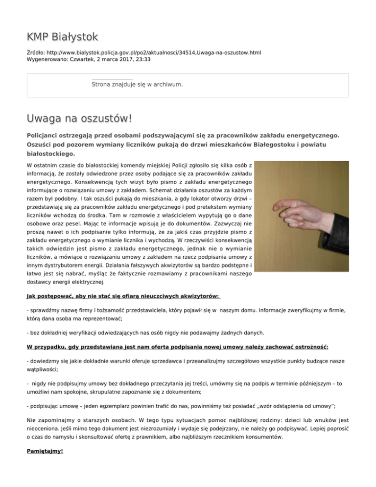 KMP Białystok Źródło: http://www.bialystok.policja.gov.pl/po2/aktualnosci/34514,Uwaga-na-oszustow.html Wygenerowano: Czwartek, 2 marca 2017, 23:33 Strona znajduje się w archiwum. Uwaga na oszustów! Policjanci ostrzegają przed osobami podszywającymi się za pracowników zakładu energetycznego. Oszuści pod pozorem wymiany liczników pukają do drzwi mieszkańców Białegostoku i powiatu białostockiego. W ostatnim czasie do białostockiej komendy miejskiej Policji zgłosiło się kilka osób z informacją, że zostały odwiedzone przez osoby podające się za pracowników zakładu energetycznego. Konsekwencją tych wizyt było pismo z zakładu energetycznego informujące o rozwiązaniu umowy z zakładem. Schemat działania oszustów za każdym razem był podobny. I tak oszuści pukają do mieszkania, a gdy lokator otworzy drzwi – przedstawiają się za pracowników zakładu energetycznego i pod pretekstem wymiany liczników wchodzą do środka. Tam w rozmowie z właścicielem wypytują go o dane osobowe oraz pesel. Mając te informacje wpisują je do dokumentów. Zazwyczaj nie proszą nawet o ich podpisanie tylko informują, że za jakiś czas przyjdzie pismo z zakładu energetycznego o wymianie licznika i wychodzą. W rzeczywiści konsekwencją takich odwiedzin jest pismo z zakładu energetycznego, jednak nie o wymianie liczników, a mówiące o rozwiązaniu umowy z zakładem na rzecz podpisania umowy z innym dystrybutorem energii. Działania fałszywych akwizytorów są bardzo podstępne i łatwo jest się nabrać, myśląc że faktycznie rozmawiamy z pracownikami naszego dostawcy energii elektrycznej. Jak postępować, aby nie stać się ofiarą nieuczciwych akwizytorów: - sprawdźmy nazwę firmy i tożsamość przedstawiciela, który pojawił się w naszym domu. Informacje zweryfikujmy w firmie, którą dana osoba ma reprezentować; - bez dokładniej weryfikacji odwiedzających nas osób nigdy nie podawajmy żadnych danych. W przypadku, gdy przedstawiana jest nam oferta podpisania nowej umowy należy zachować ostrożność: - dowiedzmy się jakie dokładnie warunki oferuje sprzedawca i przeanalizujmy szczegółowo wszystkie punkty budzące nasze wątpliwości; - nigdy nie podpisujmy umowy bez dokładnego przeczytania jej treści, umówmy się na podpis w terminie późniejszym – to umożliwi nam spokojne, skrupulatne zapoznanie się z dokumentem; - podpisując umowę – jeden egzemplarz powinien trafić do nas, powinniśmy też posiadać „wzór odstąpienia od umowy”; Nie zapominajmy o starszych osobach. W tego typu sytuacjach pomoc najbliższej rodziny: dzieci lub wnuków jest nieoceniona. Jeśli mimo tego dokument jest niezrozumiały i wydaje się podejrzany, nie należy go podpisywać. Lepiej poprosić o czas do namysłu i skonsultować ofertę z prawnikiem, albo najbliższym rzecznikiem konsumentów. Pamiętajmy! Od każdej umowy podpisanej poza siedzibą firmy można odstąpić w ciągu 10 dni, a jeśli sprzedawca usługi o tym nie poinformował - w ciągu trzech miesięcy. Wystarczy pod wskazany adres wysłać tzw. oświadczenie woli. To informacja, że klient odstępuje od umowy zawartej w danym dniu. Nie trzeba nawet podawać przyczyny rezygnacji z umowy. Ocena: 0/5 (0) Tweetnij