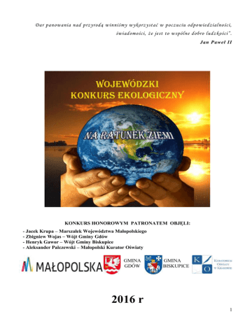 Dar panowania nad przyrodą winniśmy wykorzystać w poczuciu odpowiedzialności, świadomości, że jest to wspólne dobro ludzkości”. Jan Paweł II KONKURS HONOROWYM PATRONATEM OBJĘLI: - Jacek Krupa – Marszałek Województwa Małopolskiego - Zbigniew Wojas – Wójt Gminy Gdów - Henryk Gawor – Wójt Gminy Biskupice - Aleksander Palczewski – Małopolski Kurator Oświaty GMINA GDÓW GMINA BISKUPICE 2016 r 1 ZASADY I PRZEBIEG MIĘDZYNARODOWEGO, OGÓLNOPOLSKIEGO I WOJEWÓDZKIEGO KONKURSU EKOLOGICZNEGO Temat konkursu: EKOLOGIA I PŁAZY CELE: Propagowanie wiedzy przyrodniczej. Rozwijanie uzdolnień i zainteresowań przyrodniczych uczniów. Wyłanianie talentów oraz rozbudzanie ciekawości poznawczej i twórczego działania uczniów. Uwrażliwianie na piękno otaczającego świata. Dostrzeganie realnego zagrożenia życia na Ziemi. Zrozumienie konieczności ochrony środowiska. UCZESTNICY: Uczniowie Przedszkoli i Szkół Podstawowych Uczniowie Gimnazjum Fundacje Osób Niepełnosprawnych, Ośrodki Wsparcia Dziennego, Świetlice Środowiskowe, uczniowie Szkół Integracyjnych i Specjalnych FORMY KONKURSU: turniej wiedzy - WOJEWÓDZKI konkurs plastyczny - WOJEWÓDZKI konkurs literacki - OGÓLNOPOLSKI konkurs fotograficzny - MIĘDZYNARODOWY ORGANIZATORZY: Publiczna Szkoła Podstawowa w Trąbkach Gimnazjum w Niegowici KOORDYNATORZY: Dyrektor Szkoły Podstawowej w Trąbkach – mgr inż. Anna Gonet Dyrektor Gimnazjum w Niegowici – mgr inż. Leszek Rajtarski PARTNERZY: Kuratorium Oświaty w Krakowie Marszałek Województwa Małopolskiego Starostwo Powiatowe w Wieliczce Urząd Gminy w Gdowie Urząd Gminy w Biskupicach Stowarzyszenie na Rzecz EKO-Rozwoju Wsi Trąbki Cinema Park w Krakowie Park Wodny Kraków Kopalnia Soli w Bochni Ogród Botaniczny w Krakowie Małopolski Bank Spółdzielczy w Wieliczce 2 Harmonogram konkursu Termin Zadanie do 06.04.2016r. Zgłoszenie udziału w turnieju wiedzy wypełnić kartę zgłoszeniową (zał. nr 1) i wysłać pocztą na adres: (środa) 08.04.2016 r. (piątek) godz. 10.00 Publiczna Szkoła Podstawowa Trąbki 312 32-020 Wieliczka Gimnazjum w Niegowici Niegowić 62 32 – 420 Gdów [email protected] [email protected] Turniej wiedzy ekologicznej Szkoły Podstawowe i Przedszkola - Szkoła Podstawowa w Trąbkach Gimnazja – Gimnazjum w Niegowici rejestracja uczestników 9.00 – 9.45 08.04.2016 r. (piątek) Termin oddawania prac: plastycznych, literackich i fotograficznych. Miejsce: Szkoła Podstawowa w Trąbkach Trąbki 312 32-020 Wieliczka 14.04.2016 r. (czwartek) godz. 13.00 Gimnazjum w Niegowici Niegowić 62 32 – 420 Gdów Ocena i wybór najlepszych prac plastycznych, literackich i fotograficznych przez komisję powołaną przez organizatorów. W tym dniu zapraszamy chętnych uczestników konkursu wraz z opiekunami do udziału w głosowaniu na specjalną Nagrodę Publiczności Miejsce: Urząd Gminy Biskupice – Tomaszkowice 455 27.04.2016 r. (środa) GALA KONKURSU wręczenie nagród i dyplomów wystawa nagrodzonych prac Miejsce: CINEMA PARK BONARKA W KRAKOWIE Informacje o konkursie można uzyskać pod numerem telefonu: Szkoła Podstawowa w Trąbkach tel: 12 250 50 55 lub Alicja Mazur tel: 607 937 207 Gimnazjum w Niegowici tel: 12 251 95 15 lub Janina Świeży tel : 501 355 804 3 KONKURS PLASTYCZNY-WOJEWÓDZKI KATEGORIA prace płaskie format: A2 (420 mm x 594 mm) technika: dowolna prace przestrzenne format: max.(40cm x 40cm x 40cm) technika: dowolna GRUPA WIEKOWA Przedszkola i SP – kl.0 -III SP – kl. IV – VI Gimnazjum – kl. I – III Przedszkola i SP – kl.0 -III SP – kl. IV – VI Gimnazjum – kl. I – III Fundacje Osób Niepełnosprawnych Ośrodki Wsparcia Dziennego Świetlice Środowiskowe Szkoły Integracyjne i Specjalne KONKURS LITERACKI- OGÓLNOPOLSKI KATEGORIA praca literacka opowiadanie format: max. 1 strona A4 GRUPA WIEKOWA Przedszkola i SP – kl. 0 - III SP – kl. IV – VI Gimnazjum – kl. I – III KONKURS FOTOGRAFICZNY-MIĘDZYNARODOWY KATEGORIA tylko jedno zdjęcie format: A4 GRUPA WIEKOWA Przedszkola i SP – kl. 0 – VI Gimnazjum – kl. I – III Każda szkoła może przesłać jedną pracę z każdej grupy wiekowej z wymienionych wyżej kategorii. Autorem jednej pracy konkursowej może być tylko jeden uczeń. Wszystkie prace konkursowe: plastyczne, literackie i fotograficzne muszą być opisane na odwrocie zgodnie z podanym wzorem metryczki: Kategoria: ………………………………………..………..……………… Imię i nazwisko:…………………….…………………………………….. Klasa: ………………………………………………………………….….. Szkoła: ………………………..……………………………………………. Opiekun: …………………………………………………………………… Telefon: ……………………………………………………………………. Prace niezgodne z regulaminem zostaną odrzucone. Prace po zakończeniu konkursu można odebrać u organizatorów do 13.05.2016 r. ZAPRASZAMY DO UDZIAŁU, NA FINALISTÓW CZEKAJĄ ATRAKCYJNE NAGRODY ! 4 TURNIEJ WIEDZY –PRZEDSZKOLA I SZKOŁY PODSTAWOWE Każde Przedszkole i Szkołę Podstawową może reprezentować tylko jeden uczeń kategorii tzn. jedno dziecko z Przedszkola, jeden uczeń z klas 0- III oraz jeden uczeń z klas IV-VI PRZEDSZKOLA I KLASY 0- III KLASY IV - VI Uczniowie klas 0- I i Przedszkola wezmą udział w turnieju wiedzy - w formie ustnej oraz testu wyboru – obrazki. Natomiast uczniów klas II-III będzie obowiązywał pisemny test wyboru. Turniej przeprowadzony jest w formie testu (zadania zamknięte i otwarte). Czas rozwiązania 45 minut. Czas rozwiązania: 45 minut. OGÓLNE ZAGADNIENIA Ekologia: Pojęcia ekologiczne: recykling, ekologia, zanieczyszczenie; środowisko; Współczesne zagrożenia dla świata przyrody; Ochrona przyrody; Wpływ człowieka na zanieczyszczenie wody. Świat zwierząt: Płazy: cechy charakterystyczne; Przys