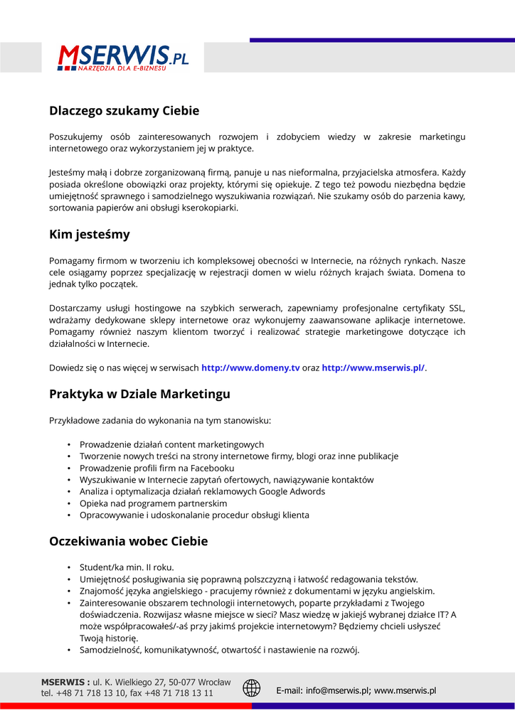 Dlaczego szukamy Ciebie Poszukujemy osób zainteresowanych rozwojem i zdobyciem wiedzy w zakresie marketingu internetowego oraz wykorzystaniem jej w praktyce. Jesteśmy małą i dobrze zorganizowaną firmą, panuje u nas nieformalna, przyjacielska atmosfera. Każdy posiada określone obowiązki oraz projekty, którymi się opiekuje. Z tego też powodu niezbędna będzie umiejętność sprawnego i samodzielnego wyszukiwania rozwiązań. Nie szukamy osób do parzenia kawy, sortowania papierów ani obsługi kserokopiarki. Kim jesteśmy Pomagamy firmom w tworzeniu ich kompleksowej obecności w Internecie, na różnych rynkach. Nasze cele osiągamy poprzez specjalizację w rejestracji domen w wielu różnych krajach świata. Domena to jednak tylko początek. Dostarczamy usługi hostingowe na szybkich serwerach, zapewniamy profesjonalne certyfikaty SSL, wdrażamy dedykowane sklepy internetowe oraz wykonujemy zaawansowane aplikacje internetowe. Pomagamy również naszym klientom tworzyć i realizować strategie marketingowe dotyczące ich działalności w Internecie. Dowiedz się o nas więcej w serwisach http://www.domeny.tv oraz http://www.mserwis.pl/. Praktyka w Dziale Marketingu Przykładowe zadania do wykonania na tym stanowisku: • • • • • • • Prowadzenie działań content marketingowych Tworzenie nowych treści na strony internetowe firmy, blogi oraz inne publikacje Prowadzenie profili firm na Facebooku Wyszukiwanie w Internecie zapytań ofertowych, nawiązywanie kontaktów Analiza i optymalizacja działań reklamowych Google Adwords Opieka nad programem partnerskim Opracowywanie i udoskonalanie procedur obsługi klienta Oczekiwania wobec Ciebie • • • • • Student/ka min. II roku. Umiejętność posługiwania się poprawną polszczyzną i łatwość redagowania tekstów. Znajomość języka angielskiego - pracujemy również z dokumentami w języku angielskim. Zainteresowanie obszarem technologii internetowych, poparte przykładami z Twojego doświadczenia. Rozwijasz własne miejsce w sieci? Masz wiedzę w jakiejś wybranej działce IT? A może współpracowałeś/-aś przy jakimś projekcie internetowym? Będziemy chcieli usłyszeć Twoją historię. Samodzielność, komunikatywność, otwartość i nastawienie na rozwój. MSERWIS : ul. K. Wielkiego 27, 50-077 Wrocław tel. +48 71 718 13 10, fax +48 71 718 13 11 E-mail: [email protected]; www.mserwis.pl Warunki praktyk • • • • • Czas trwania: 3 miesiące. Miejsce: biuro stacjonarne, ul. Kazimierza Wielkiego 27 we Wrocławiu. Wymiar czasu pracy: elastyczny, minimum 20 godzin tygodniowo. Praktyka jest bezpłatna w pierwszym miesiącu jej trwania. Możliwość nawiązania stałej współpracy po zakończeniu praktyk. Zgłoszenia Prześlij swój CV oraz dodatkowo krótko opisz swoje zainteresowania i doświadczenia związane z IT, oczekiwania wobec praktyk oraz dlaczego uważasz, że jest to oferta właśnie dla Ciebie. Czekamy na kontakt od Ciebie pod adresem [email protected]. MSERWIS : ul. K. Wielkiego 27, 50-077 Wrocław tel. +48 71 718 13 10, fax +48 71 718 13 11 E-mail: [email protected]; www.mserwis.pl