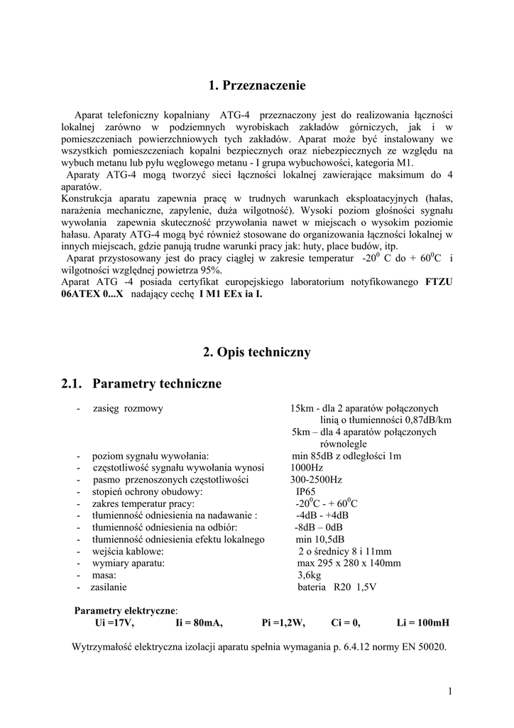 1. Przeznaczenie Aparat telefoniczny kopalniany ATG-4 przeznaczony jest do realizowania łączności lokalnej zarówno w podziemnych wyrobiskach zakładów górniczych, jak i w pomieszczeniach powierzchniowych tych zakładów. Aparat może być instalowany we wszystkich pomieszczeniach kopalni bezpiecznych oraz niebezpiecznych ze względu na wybuch metanu lub pyłu węglowego metanu - I grupa wybuchowości, kategoria M1. Aparaty ATG-4 mogą tworzyć sieci łączności lokalnej zawierające maksimum do 4 aparatów. Konstrukcja aparatu zapewnia pracę w trudnych warunkach eksploatacyjnych (hałas, narażenia mechaniczne, zapylenie, duża wilgotność). Wysoki poziom głośności sygnału wywołania zapewnia skuteczność przywołania nawet w miejscach o wysokim poziomie hałasu. Aparaty ATG-4 mogą być również stosowane do organizowania łączności lokalnej w innych miejscach, gdzie panują trudne warunki pracy jak: huty, place budów, itp. Aparat przystosowany jest do pracy ciągłej w zakresie temperatur -200 C do + 600C i wilgotności względnej powietrza 95%. Aparat ATG -4 posiada certyfikat europejskiego laboratorium notyfikowanego FTZU 06ATEX 0...X nadający cechę I M1 EEx ia I. 2. Opis techniczny 2.1. Parametry techniczne - zasięg rozmowy - poziom sygnału wywołania: - częstotliwość sygnału wywołania wynosi - pasmo przenoszonych częstotliwości - stopień ochrony obudowy: - zakres temperatur pracy: - tłumienność odniesienia na nadawanie : - tłumienność odniesienia na odbiór: - tłumienność odniesienia efektu lokalnego - wejścia kablowe: - wymiary aparatu: - masa: - zasilanie Parametry elektryczne: Ui =17V, Ii = 80mA, 15km - dla 2 aparatów połączonych linią o tłumienności 0,87dB/km 5km – dla 4 aparatów połączonych równolegle min 85dB z odległości 1m 1000Hz 300-2500Hz IP65 -200C - + 600C -4dB - +4dB -8dB – 0dB min 10,5dB 2 o średnicy 8 i 11mm max 295 x 280 x 140mm 3,6kg bateria R20 1,5V Pi =1,2W, Ci = 0, Li = 100mH Wytrzymałość elektryczna izolacji aparatu spełnia wymagania p. 6.4.12 normy EN 50020. 1 2.2. Budowa Podstawa i pokrywa aparatu wykonane są z antystatycznego tworzywa sztucznego VESTAMID o dużej wytrzymałości mechanicznej i łączone są ze sobą przy pomocy śrub specjalnych o łbach trójkątnych. Obudowa aparatu zapewnia pyłoszczelność i bryzgoszczelność IP65 wg EN60529. Układ elektryczny aparatu zawiera: mikrotelefon, induktor 1000Hz, baterię 1,5V R20, płytkę drukowaną wzmacniacza, słuchawkę dodatkową i łączówkę zaciskową. Mikrotelefon ma typową obudowę wykonaną z tworzywa sztucznego i połączony jest z aparatem sznurem pięciożyłowym. Zastosowano w nim przetworniki elektroakustyczne typu W 69-1. Mikrotelefon ma wbudowany przełącznik mikrotelefonu „PM”. Induktor 1000Hz stanowi źródło prądu wywoławczego. W nierozbieralnej obudowie induktora usytuowane są przekładnie zębate, uzwojenie induktora wraz z rezystancyjnym ogranicznikiem mocy, diodowy układ ogranicznika oraz układ sprężyn stykowych przełączanych przełącznikiem odśrodkowym. Płytka drukowana z układem wzmacniacza jest zamocowana poprzez izolujące podkładki do dna podstawy aparatu. Wzmacniacz zasilany jest napięciem 1,5V ( bateria R20) . Słuchawka dodatkowa podłączona jest do słuchawki mikrotelefonu na listwie zaciskowej. Listwa zaciskowa posiada 7 zacisków. Dla wprowadzenia kabli przewidziano wpusty kablowe o średnicach: 2 sztuki Ø 8mm i jeden Ø 11mm. 2.3. Opis działania układu aparatu Przywołanie aparatu współpracującego do rozmowy odbywa się przez pokręcenie korbką induktora w aparacie wywołującym. W linie wysłany zostaje wtedy prąd wywołania o częstotliwości około 1000Hz. Prąd ten wytwarza w słuchawce mikrotelefonu aparatu wywoływanego – sygnał akustyczny. Dla zwiększenia głośności tego sygnału wykorzystano zawieszenie mikrotelefonu w kształcie tuby akustycznej. Po zdjęciu mikrotelefonu i naciśnięciu przełącznika PM można prowadzić rozmowę. Jeden zestyk przełącznika PM włącza zasilanie dla wzmacniacza tranzystorowego, drugi włącza równoważnik linii układu antylokalnego. Układ zaprojektowany jest tak, że nowa bateria R-20 wystarcza na jednoroczną eksploatację aparatu. Niezależnie od tego aparat umożliwia przeprowadzenie rozmowy w układzie bezbateryjnym jeśli wykorzystamy słuchawkę dodatkową jako mikrofon, co pozwala na nawiązanie łączności przy uszkodzonym wzmacniaczu lub zupełnym wyczerpaniu baterii. baterii. 3. Spełnienie wymagań odnośnie iskrobezpieczeństwa 3.1. Obudowa Obudowa aparatu została tak zaprojektowana, aby spełniała wymagania stopnia ochrony IP65 zgodnie z EN 60529 (p.6.1 normy EN 50020). Wszystkie zastosowane w aparacie przetworniki elektroakustyczne są w wykonaniu IP65. Obudowa została wykonana z antystatycznego tworzywa sztucznego w kolorze czarnym typu VESTAMID L-R2-GF25sw firmy Creanova Spezialchemie GmbH /grupa Huels. Przewody 2 do wnętrza obudowy wprowadzane są przez odpowiednie wpusty i mocowane do listwy zaciskowej spełniającej wymagania normy EN 50020. 3.2. Płytki drukowane. Zastosowane płytki drukowane można zaliczyć do klasyfikacji temperaturowej grupy I według wymagań p. 6.2.3 normy EN 50020. Płytki mają grubość 1,5 mm, ścieżki przewodzące mają grubość co najmniej 35um. Ścieżki lutownicze na płytce drukowanej pokryte są maską lutowniczą, a cała zmontowana płytka drukowana pokryta jest lakierem elektroizolacyjnym MND-25 3.3. Ograniczniki napięcia i prądu Bezpieczeństwo przeciwwybuchowe aparatu jest zapewnione: - przez zbocznikowanie uzwojenia induktora rezystorem - zbocznikowanie zacisków liniowych aparatu /L1,L2/ ogranicznikem z 4 diod Zenera Uzwojenie induktora jest zbocznikowane rezystancją ≤ 287Ω. Połączenie induktora z rezystancyjnym bocznikiem wykonane jest w taki sposób, aby odłączenie bocznika od induktora było niemożliwe. Prąd zwarcia induktora jest ograniczon