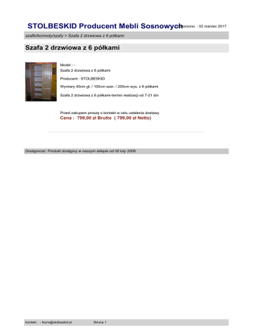 Utworzono : 02 marzec 2017 STOLBESKID Producent Mebli Sosnowych szafki/komody/szafy > Szafa 2 drzwiowa z 6 półkami Szafa 2 drzwiowa z 6 półkami Model : Szafa 2 drzwiowa z 6 półkami Producent : STOLBESKID Wymiary 40cm gł. / 100cm szer. / 200cm wys. z 6 półkami Szafa 2 drzwiowa z 6 półkami-termin realizacji od 7-21 dni Przed zakupem proszę o kontakt w celu ustalenia dostawy Cena : 799,00 zł Brutto ( 799,00 zł Netto) Dostępność: Produkt dostępny w naszym sklepie od 05 luty 2009 kontakt : - [email protected] Strona 1