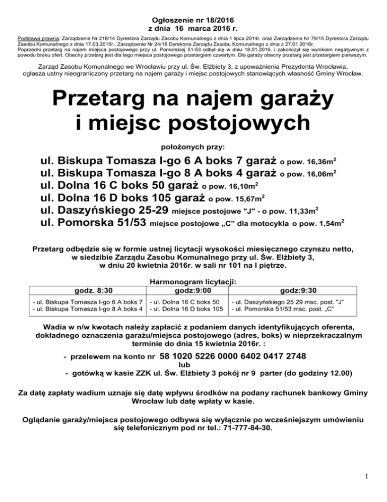 Ogłoszenie nr 18/2016 z dnia 16 marca 2016 r. Podstawa prawna: Zarządzenie Nr 218/14 Dyrektora Zarządu Zasobu Komunalnego z dnia 1 lipca 2014r. oraz Zarządzenie Nr 79/15 Dyrektora Zarządu Zasobu Komunalnego z dnia 17.03.2015r., Zarządzenie Nr 24/16 Dyrektora Zarządu Zasobu Komunalnego z dnia z 27.01.2016r. Poprzedni przetarg na najem miejsca postojowego przy ul. Pomorskiej 51-53 odbył się w dniu 18.01.2016. i zakończył się wynikiem negatywnym z powodu braku ofert. Obecny przetarg jest dla tego miejsca postojowego przetargiem czwartym. Dla garaży obecny przetarg jest przetargiem pierwszym. Zarząd Zasobu Komunalnego we Wrocławiu przy ul. Św. Elżbiety 3, z upoważnienia Prezydenta Wrocławia, ogłasza ustny nieograniczony przetarg na najem garaży i miejsc postojowych stanowiących własność Gminy Wrocław. Przetarg na najem garaży i miejsc postojowych położonych przy: ul. Biskupa Tomasza I-go 6 A boks 7 garaż o pow. 16,36m2 ul. Biskupa Tomasza I-go 8 A boks 4 garaż o pow. 16,06m2 ul. Dolna 16 C boks 50 garaż o pow. 16,10m2 ul. Dolna 16 D boks 105 garaż o pow. 15,67m2 ul. Daszyńskiego 25-29 miejsce postojowe "J" - o pow. 11,33m2 ul. Pomorska 51/53 miejsce postojowe „C” dla motocykla o pow. 1,54m2 Przetarg odbędzie się w formie ustnej licytacji wysokości miesięcznego czynszu netto, w siedzibie Zarządu Zasobu Komunalnego przy ul. Św. Elżbiety 3, w dniu 20 kwietnia 2016r. w sali nr 101 na I piętrze. godz. 8:30 - ul. Biskupa Tomasza I-go 6 A boks 7 - ul. Biskupa Tomasza I-go 8 A boks 4 Harmonogram licytacji: godz:9:00 - ul. Dolna 16 C boks 50 - ul. Dolna 16 D boks 105 godz:9:30 - ul. Daszyńskiego 25 29 msc. post. "J” - ul. Pomorska 51/53 msc. post. „C” Wadia w n/w kwotach należy zapłacić z podaniem danych identyfikujących oferenta, dokładnego oznaczenia garażu/miejsca postojowego (adres, boks) w nieprzekraczalnym terminie do dnia 15 kwietnia 2016r. : - przelewem na konto nr 58 1020 5226 0000 6402 0417 2748 lub - gotówką w kasie ZZK ul. Św. Elżbiety 3 pokój nr 9 parter (do godziny 12.00) Za datę zapłaty wadium uznaje się datę wpływu środków na podany rachunek bankowy Gminy Wrocław lub datę wpłaty w kasie. Oglądanie garaży/miejsca postojowego odbywa się wyłącznie po wcześniejszym umówieniu się telefonicznym pod nr tel.: 71-777-84-30. 1 opis garaży : Adres 2 ul. Biskupa Tomasza I-go 6 A boks 7 ul. Biskupa Tomasza I-go 8 A boks 4 16,36 16,06 Obręb Plac Grunwaldzki AM-19 dz.16/5, garaż nie ma urządzonej ksiegi wieczystej. Dla nieruchomości, w której znajduje się garaż Sąd Rejonowy dla Wrocławia-Krzyków prowadzi księgę wieczystą nr KW107214 Obręb Plac Grunwaldzki AM-19 dz.16/5, garaż nie ma urządzonej ksiegi wieczystej. Dla nieruchomości, w której znajduje się garaż Sąd Rejonowy dla WrocławiaKrzyków prowadzi księgę wieczystą nr KW107214 garaż w ciągu garaży we wnętrzu podwórzowym garażowanie pojazdu* garaż w ciągu garaży we wnętrzu podwórzowym garażowanie pojazdu* Wywoławczy miesięczny czynsz netto [zł] 82,00 81,00 Wysokość wadium [zł] 82,00 81,00 Wysokość minimalnego postąpienia [zł] 10,00 10,00 tak tak demontaż zbędnych elementów wyposażenia, malowanie ścian i sufitu z przygotowaniem powierzchni, naprawa posadzki betonowej, ewentualna naprawa pokrycia dachowego z papy wraz z obróbkami blacharskimi, naprawa lub wymiana bramy wjazdowej, uzupełnienie lub wymiana przekrycia kanału warsztatowego z desek. Powierzchnia m Oznaczenie nieruchomości wg ewidencji gruntów i katastru Lokalizacja Instalacje Przeznaczenie Wspólnota Orientacyjny zakres robót remontowo-budowlanych: likwidacja zacieków, uzupełnienie tynków, malowanie z przygotowaniem powierzchni, naprawa posadzki betonowej, naprawa pokrycia dachowego z papy wraz z obróbkami blacharskimi, naprawa lub wymiana bramy wjazdowej. opis garaży: ul. Dolna 16 C boks 50 Adres 2 ul. Dolna 16 D boks 105 16,1 15,67 Obręb Plac Grunwaldzki AM-12 dz.2, garaż nie ma urządzonej księgi wieczystej. Dla nieruchomości, w której znajduje się garaż Sąd Rejonowy dla Wrocławia-Krzyków prowadzi księgę wieczystą nr WR1K/00310937/3 Obręb Plac Grunwaldzki AM-12 dz.2, garaż nie ma urządzonej księgi wieczystej. Dla nieruchomości, w której znajduje się garaż Sąd Rejonowy dla WrocławiaKrzyków prowadzi księgę wieczystą nr WR1K/00310937/3 garaż w ciągu garażowym, wjazd od ul. Namysłowskiej elektryczna garażowanie pojazdu* garaż w ciągu garażowym, wjazd od ul. Namysłowskiej garażowanie pojazdu* Wywoławczy miesięczny czynsz netto [zł] 81,00 79,00 Wysokość wadium [zł] 81,00 79,00 Wysokość minimalnego postąpienia [zł] 10,00 10,00 nie Malowanie ścian i sufitu z przygotowaniem powierzchni, malowanie bramy, naprawa pokrycia dachowego z papy wraz z obróbkami blacharskimi, sprawdzenie lub wymiana instalacji elektrycznej nie Powierzchnia m Oznaczenie nieruchomości wg ewidencji gruntów i katastru Lokalizacja Instalacje Przeznaczenie Wspólnota Orientacyjny zakres robót remontowo-budowlanych: likwidacja pęknięć, malowanie ścian i sufitu z przygotowaniem powierzchni, malowanie bramy, naprawa pokrycia dachowego z papy wraz z obróbkami blacharskimi OZNACZENIA: * pojazd – środek transportu przeznaczony do poruszania się po drodze oraz maszynę lub urządzenie do tego przystosowane. 2 opis miejsc postojowych: Adres Powierzchnia m 2 Oznaczenie nieruchomości wg ewidencji gruntów i katastru ul. Daszyńskiego 25-29 miejsce postojowe "J" 11,33 ul. Pomorska 51/53 miejsce postojowe „C” 1,54 Obręb Plac Grunwaldzki AM-9 dz.7/2, garaż nie ma urządzonej ksiegi wieczystej. Dla nieruchomości, w której znajduje się garaż Sąd Rejonowy dla Wrocławia-Krzyków prowadzi księgę wieczystą nr WR1K/00251367/4 miejsce postojowe na terenie zamkniętym we wnętrzu podwórzowym, wjazd od ul. Daszyńskiego Obręb Plac Grunwaldzki AM-23 dz.75/5, miejsce postojowe nie ma urządzonej księgi wieczystej. Dla nieruchom