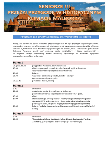 Program dla grupy Seniorów Uniwersytetu III Wieku Dzień 1 Dzień 2