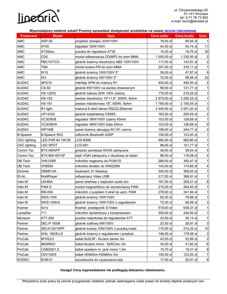ul. Chrzanowskiego 62 51-141 Wrocław tel. 0-71 78 73 900 e-mail: [email protected] Wyprzedajemy ostatnie sztuki! Prosimy sprawdzać dostępność produktów na naszej stronie internetowej Producent Model Opis Cena netto Cena brutto Ilość AMC ASP-20 projektor dźwięku 20W/100V 78,00 zł 95,94 zł 1 AMC AT30 regulator 30W/100V 44,50 zł 54,74 zł 11 AMC AT30box puszka do regulatora AT30 15,20 zł 18,70 zł 30 AMC CD5 moduł odtwarzacza CD/MP3 do wzm MMA 1 000,00 zł 1 230,00 zł 2 AMC PBC10/TCO głośnik ścienny dwudrożny ABS 10W/100V 117,00 zł 143,91 zł 2 AMC TM4 moduł tunera FM do wzm MMA 257,00 zł 316,11 zł 1 AMC W10 głośnik ścienny 10W/100V 5" 39,00 zł 47,97 zł 9 AMC W3 głośnik ścienny 3W/100V 5" 72,00 zł 88,56 zł 22 AUDAC APG10 interfejs APM do matrycy R1 400,00 zł 492,00 zł 2 AUDAC CS-50 głośnik 6W/100V na panelu drewnianym AUDAC HS-120/G głośnik tubowy 20W 100V zielony AUDAC HS-152 AUDAC HS-181 AUDAC AUDAC 99,00 zł 121,77 zł 1 175,00 zł 215,25 zł 1 zestaw dwudrożny 15"+1,8", 500W, 8ohm 2 675,00 zł 3 290,25 zł 1 zestaw niskotonowy 18", 500W, 8ohm 1 785,00 zł 2 195,55 zł 1 R1 light matryca 8 stref stereo RS232,Ethernet 2 440,00 zł 3 001,20 zł 3 UP14/2Q głośnik kwadratowy CS65S 163,00 zł 200,49 zł 2 AUDAC VC3036/B regulator 36W/100V czarny 45mm 103,00 zł 126,69 zł 1 AUDAC VC3036/W regulator 36W/100V biały 45mm 103,00 zł 126,69 zł 9 AUDAC WP18/B panel ścienny sterujący M1,R1 czarny 199,00 zł 244,77 zł 2 B-Speech B-Speech RX2 odbiornik Bluetooth A2DP 100,00 zł 123,00 zł 1 CKC lighting LED PAR 64 1W/36 LCD-830B 460,00 zł 565,80 zł 1 CKC lighting LED SPOT LCD-651 99,00 zł 121,77 zł 1 Comm-Tec BTX-MD4FP gniazdo panelowe SVHS zakręcane 48,00 zł 59,04 zł 5 Comm-Tec BTX-MX-HD15F wtyk VGAf zakręcany z obudową na kabel 96,00 zł 118,08 zł 4 DB Tech VH512SR mikrofon nagłowny do PU901D 289,00 zł 355,47 zł 1 DB Tech VH9504 mikrofon lavalier do WM220M 142,00 zł 174,66 zł 4 Dorimei DRM610A keyboard, 61 klawiszy 300,00 zł 369,00 zł 1 ID-AL MultiPlayer odtwarzacz Video USB 317,00 zł 389,91 zł 1 Inter-M LM-88A panel strefowy z wejściem audio b/o 167,00 zł 205,41 zł 8 Inter-M PAM D moduł magnetofonu do wzmacniaczy PAM 215,00 zł 264,45 zł 1 Inter-M RM-05A mikrofon z pulpitem 5 stref do wzm. PAM 278,00 zł 341,94 zł 1 Inter-M SWS-10W głośnik ścienny 10W/100V 62,50 zł 76,88 zł 1 Inter-M SWS-10W/A głośnik ścienny 10W/100V z regulatorem 72,00 zł 88,56 zł 3 Kramer 4x1s Kramer, przełącznik S-Video 519,00 zł 638,37 zł 1 Lampifier 711 mikrofon dynamiczny z kompresorem 350,00 zł 430,50 zł 1 Monacor ATT-200 puszka natynkowa do regulatorów ATT 24,50 zł 30,14 zł 7 Partner DEL-P 165/6 głośnik sufitowy 6W/100V 23,50 zł 28,91 zł 3 Partner DELK130/10PP głośnik kulowy 10W/100V z puszką instal. 175,00 zł 215,25 zł 10 Partner WAL 165/6-LS głośnik ścienny z regulatorem i przekaź. 146,00 zł 179,58 zł 3 ProCab 8FXSJ/3 kabel 8xXLRf - 8xJack stereo 3m 43,00 zł 52,89 zł 2 ProCab 8MJRM/3 kabel 8xJack mono - 8xRCAm 3m 34,00 zł 41,82 zł 6 ProCab CAB306/1,5 kabel speakon m- jack mono 1,5m 15,70 zł 19,31 zł 6 ProCab CDV100/5 kabel HDMIAm-HDMIAm 5m 100,00 zł 123,00 zł 7 RODEC DVB-01 szczoteczka do czyszczenia płyt 17,00 zł 20,91 zł 6 Uwaga! Ceny wyprzedażowe nie podlegają dalszemu rabatowaniu. Włożyliśmy dużo pracy by cennik przygotować rzetelnie, jednak zastrzegamy sobie prawo do korekty błędnie podanych cen.
