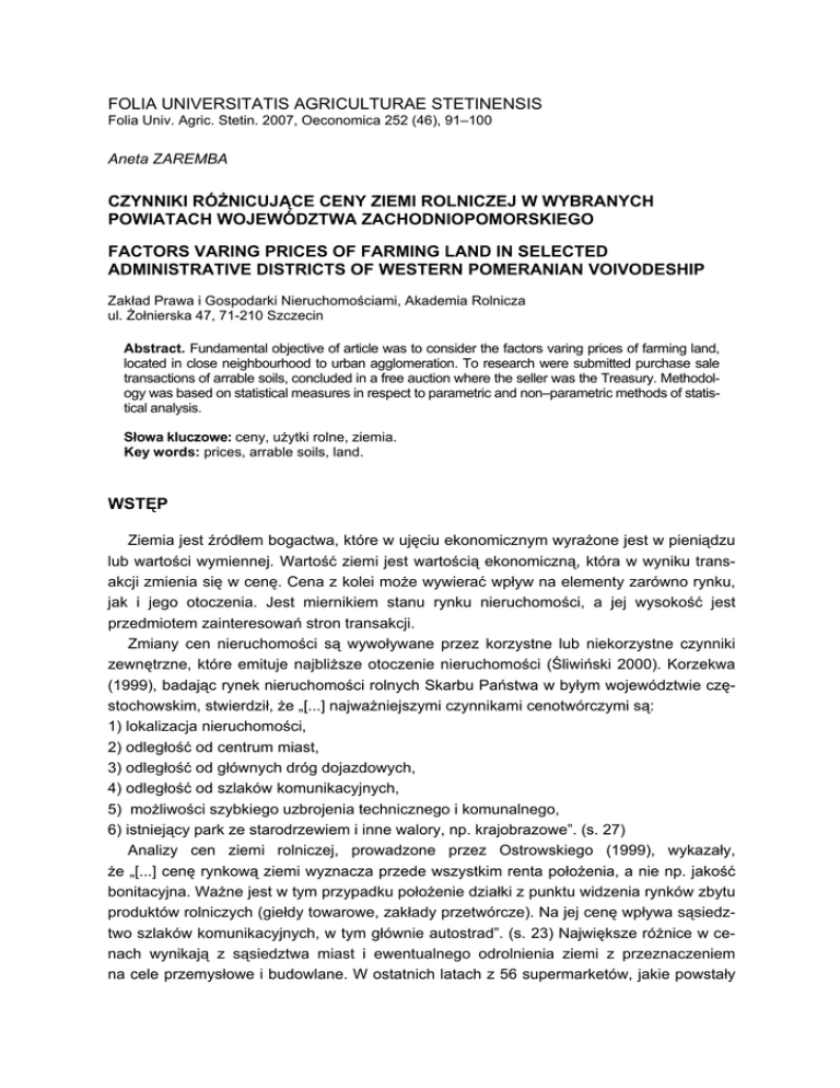 FOLIA UNIVERSITATIS AGRICULTURAE STETINENSIS Folia Univ. Agric. Stetin. 2007, Oeconomica 252 (46), 91–100 Aneta ZAREMBA CZYNNIKI RÓŻNICUJĄCE CENY ZIEMI ROLNICZEJ W WYBRANYCH POWIATACH WOJEWÓDZTWA ZACHODNIOPOMORSKIEGO FACTORS VARING PRICES OF FARMING LAND IN SELECTED ADMINISTRATIVE DISTRICTS OF WESTERN POMERANIAN VOIVODESHIP Zakład Prawa i Gospodarki Nieruchomościami, Akademia Rolnicza ul. Żołnierska 47, 71-210 Szczecin Abstract. Fundamental objective of article was to consider the factors varing prices of farming land, located in close neighbourhood to urban agglomeration. To research were submitted purchase sale transactions of arrable soils, concluded in a free auction where the seller was the Treasury. Methodology was based on statistical measures in respect to parametric and non–parametric methods of statistical analysis. Słowa kluczowe: ceny, użytki rolne, ziemia. Key words: prices, arrable soils, land. WSTĘP Ziemia jest źródłem bogactwa, które w ujęciu ekonomicznym wyrażone jest w pieniądzu lub wartości wymiennej. Wartość ziemi jest wartością ekonomiczną, która w wyniku transakcji zmienia się w cenę. Cena z kolei może wywierać wpływ na elementy zarówno rynku, jak i jego otoczenia. Jest miernikiem stanu rynku nieruchomości, a jej wysokość jest przedmiotem zainteresowań stron transakcji. Zmiany cen nieruchomości są wywoływane przez korzystne lub niekorzystne czynniki zewnętrzne, które emituje najbliższe otoczenie nieruchomości (Śliwiński 2000). Korzekwa (1999), badając rynek nieruchomości rolnych Skarbu Państwa w byłym województwie częstochowskim, stwierdził, że „[...] najważniejszymi czynnikami cenotwórczymi są: 1) lokalizacja nieruchomości, 2) odległość od centrum miast, 3) odległość od głównych dróg dojazdowych, 4) odległość od szlaków komunikacyjnych, 5) możliwości szybkiego uzbrojenia technicznego i komunalnego, 6) istniejący park ze starodrzewiem i inne walory, np. krajobrazowe”. (s. 27) Analizy cen ziemi rolniczej, prowadzone przez Ostrowskiego (1999), wykazały, że „[...] cenę rynkową ziemi wyznacza przede wszystkim renta położenia, a nie np. jakość bonitacyjna. Ważne jest w tym przypadku położenie działki z punktu widzenia rynków zbytu produktów rolniczych (giełdy towarowe, zakłady przetwórcze). Na jej cenę wpływa sąsiedztwo szlaków komunikacyjnych, w tym głównie autostrad”. (s. 23) Największe różnice w cenach wynikają z sąsiedztwa miast i ewentualnego odrolnienia ziemi z przeznaczeniem na cele przemysłowe i budowlane. W ostatnich latach z 56 supermarketów, jakie powstały 92 A. Zaremba w Polsce, aż 52 zbudowano na gruntach odrolnionych (Ostrowski 1999). Uwagę na wpływ położenia i powierzchni na cenę transakcyjną zwrócił już Moszczeński (1927), stwierdzając, że „[...] im bliżej wsi leżą ziemie, rozsprzedawane cząstkowo im przeto więcej sąsiedzkie, tem stosunkowo wyższe ceny można za nie osiągnąć”. (s. 13) Wyniki wstępnej analizy transakcji kupna – sprzedaży gruntów rolnych w latach 1996–2003, w wybranych powiatach województwa zachodniopomorskiego, charakteryzują się ogromnym zróżnicowaniem cen. Wiadomo również, że występujące różnice w cenach ziemi są rezultatem wielu czynników zewnętrznych i wewnętrznych, które je kształtują. W pracy podjęto próbę określenia czynników różnicujących ceny ziemi rolniczej. Artykuł stanowi sprawozdanie z części obszerniejszych badań zjawisk zachodzących na rynku ziemi rolniczej, związanych ze wzrostem znaczenia gruntów rolnych jako segmentu rynku nieruchomości w okresie transformacji systemowej. Celem artykułu było określenie czynników różnicujących ceny ziemi rolniczej położonej w bliskim sąsiedztwie aglomeracji miejskiej. MATERIAŁ I METODA Do badań wybrano pięć powiatów województwa zachodniopomorskiego, położonych w zasięgu oddziaływania miasta Szczecina. Wybrane powiaty to: goleniowski, gryfiński, policki, pyrzycki i stargardzki. Obiektem prowadzonych badań, z punktu widzenia przedmiotowego, były transakcje kupna – sprzedaży użytków rolnych Zasobu Własności Rolnej Skarbu Państwa z lat 1996–2003. Przeprowadzone badania empiryczne objęły 2273 transakcje kupna – sprzedaży użytków rolnych. Po przeprowadzonej obróbce i weryfikacji merytorycznej opracowano statystycznie materiał źródłowy. Dostępność danych i procedura ich uzyskania narzuciły przedział czasowy i zmienne przyjęte do badań. Badania dotyczyły tych elementów i były oparte na tych wielkościach, które były możliwe do zdobycia, opracowania statystycznego i przedstawienia liczbowego. Badając wpływ cech nieruchomości rolnych na ich ceny rynkowe, analizie poddano następujące cechy każdej nieruchomości: lokalizację ogólną nieruchomości, powierzchnię, odległość od miasta Szczecina, położenie względem dróg, powierzchnię przeliczeniową, wskaźnik jakości, rodzaj użytku. W zależności od rodzaju danych wykorzystano parametryczne lub nieparametryczne metody analizy statystycznej. Z metod parametrycznych zastosowano: analizę wariancji – klasyfikację pojedynczą, która pozwoliła na określenie wpływu zmiennych niezależnych na zmienną zależną i analizę wariancji – klasyfikację podwójną; procedura ta posłużyła do oceny wpływu dwóch niezależnych czynników na wartości. Cechę „powierzchnia fizyczna i przeliczeniowa” podano w ha, odległość od Szczecina (Centrum – Brama Portowa) podano w km. Jakość użytków rolnych określono współczynnikiem jakości (hp/hf). Przeliczniki powierzchni użytków rolnych na hektary przeliczeniowe zastosowano według Ustawy o podatku rolnym z dnia 15 listopada 1984 r. oraz Rozporządzenia Ministra Finansów z dnia 10 grudnia 2001 r. w sprawie zaliczenia gmin oraz miast do jednego z czterech okręgów podatkowych. Klasyfikacja transakcji ze względu na cechę „położenie wzg